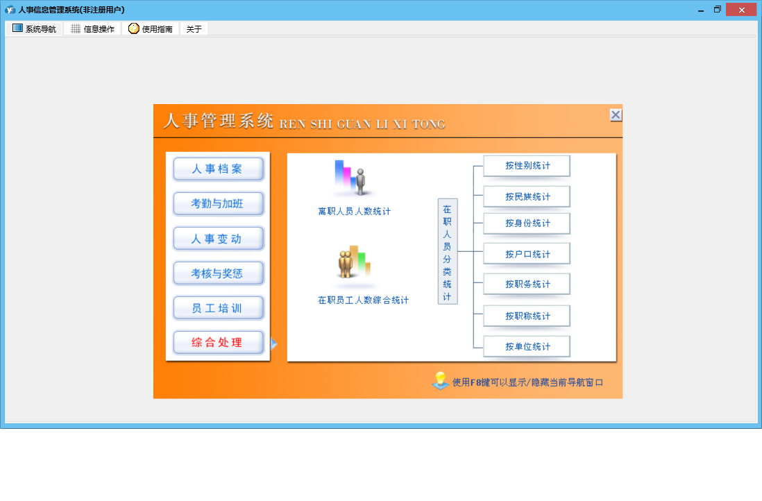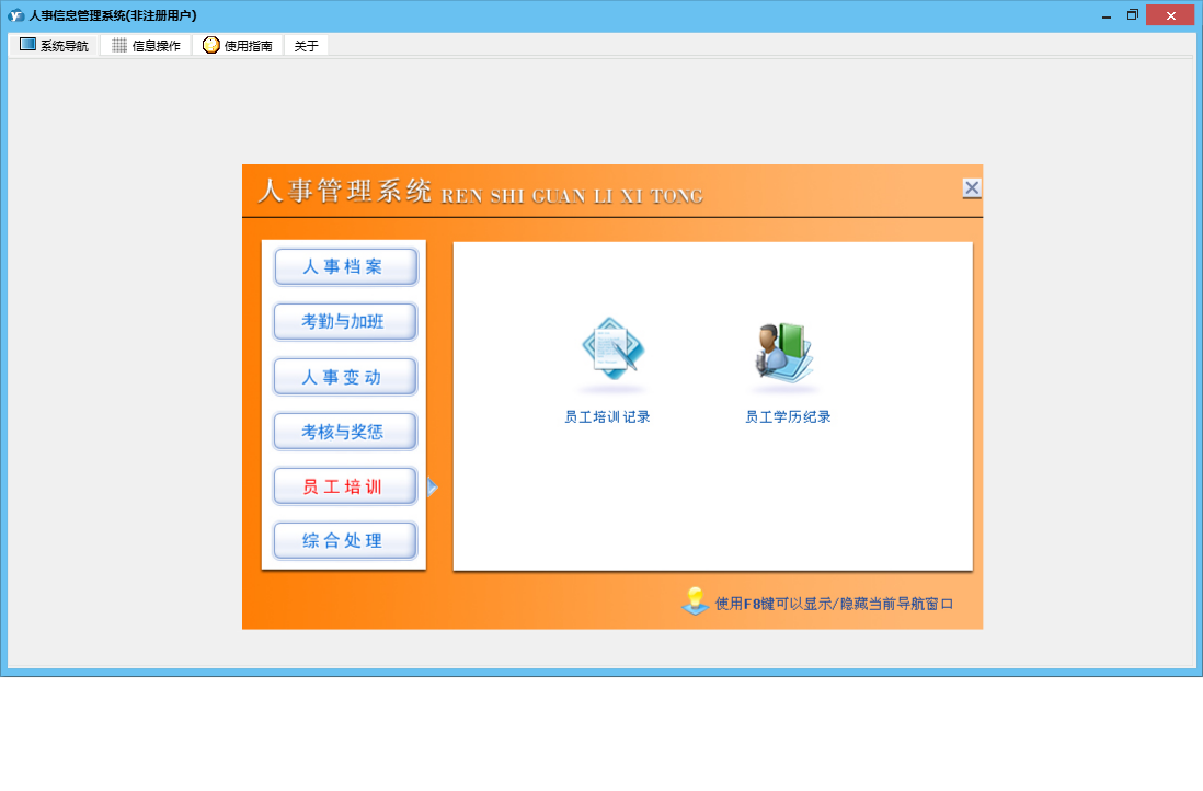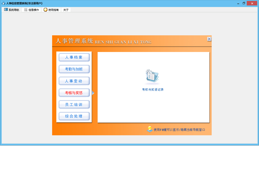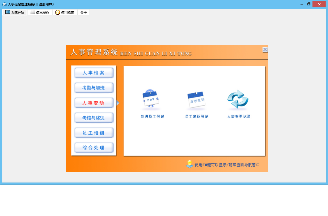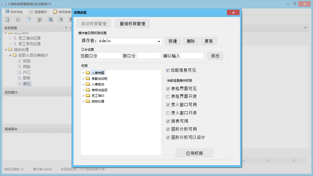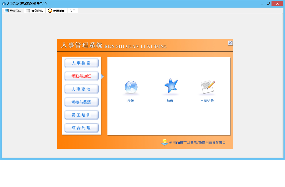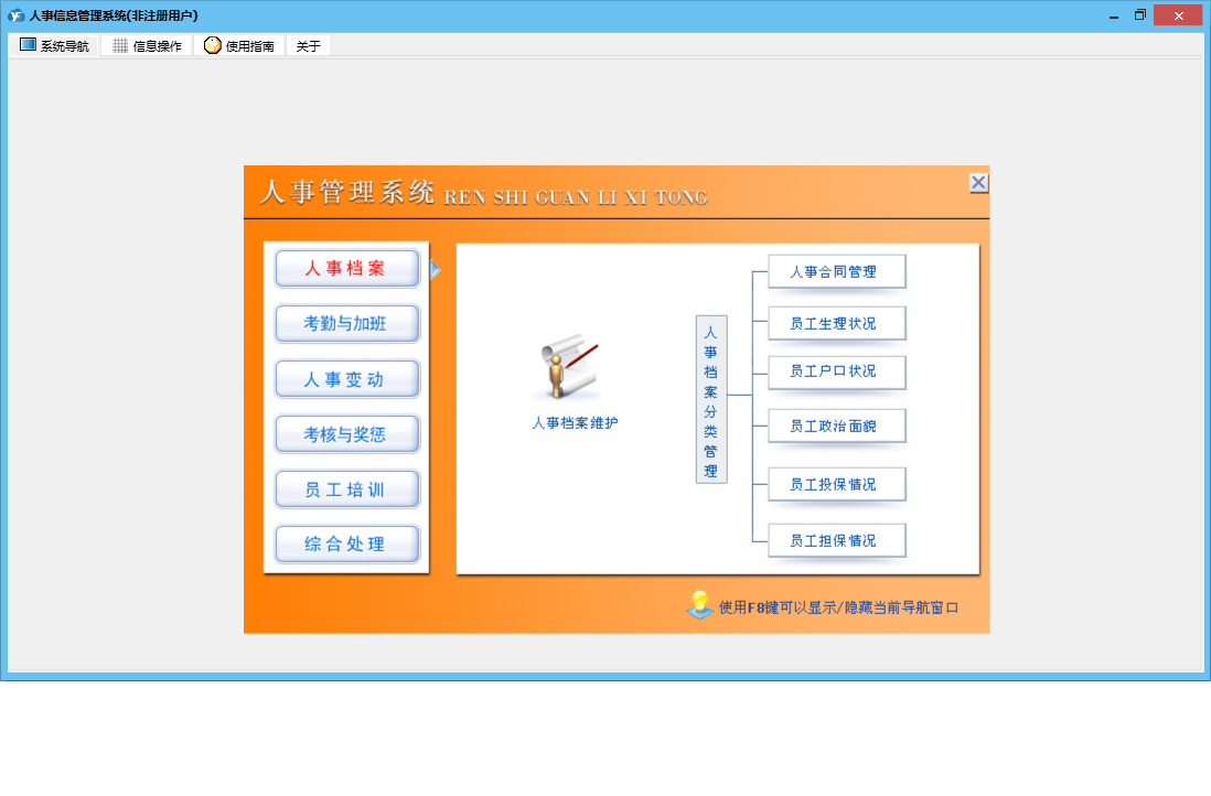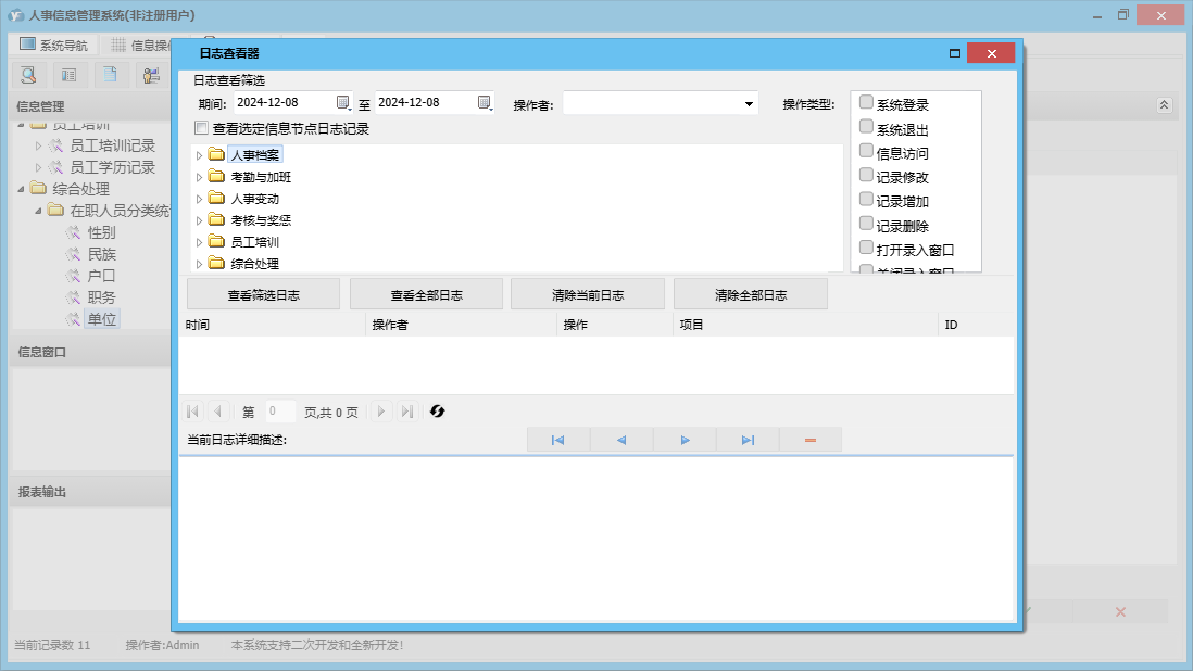 人事信息管理系统包含以下功能:1、员工户口状况、2、加班、出差记录、员工担保情况、权限设置、考勤、员工生理状况、3、员工投保情况、5、6、员工学历记录、关于、新进员工登记、人事合同管理、员工政治面貌、4、日志、员工培训记录、员工离职登记、人事档案完整资料、人事变更记录、考核与奖惩记录等
