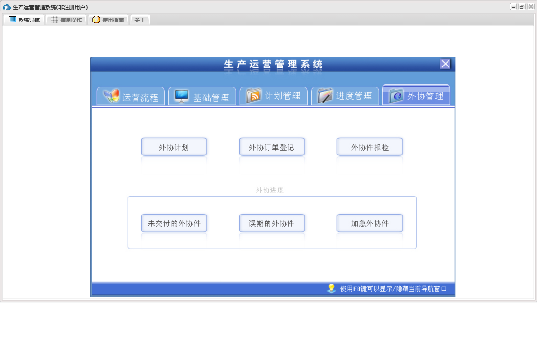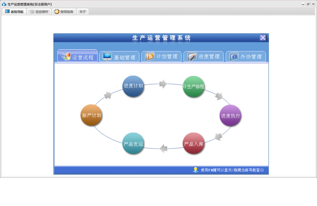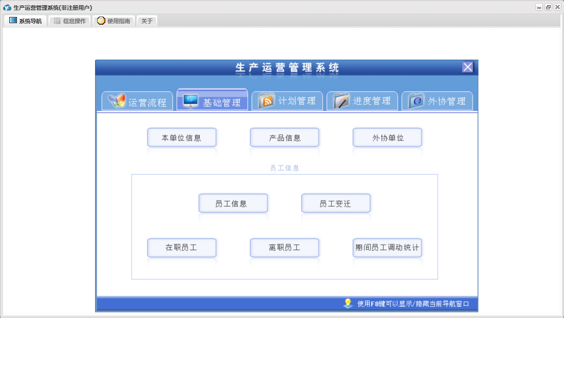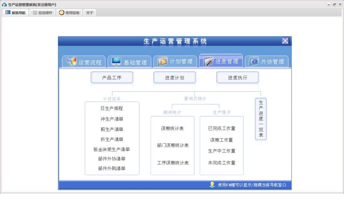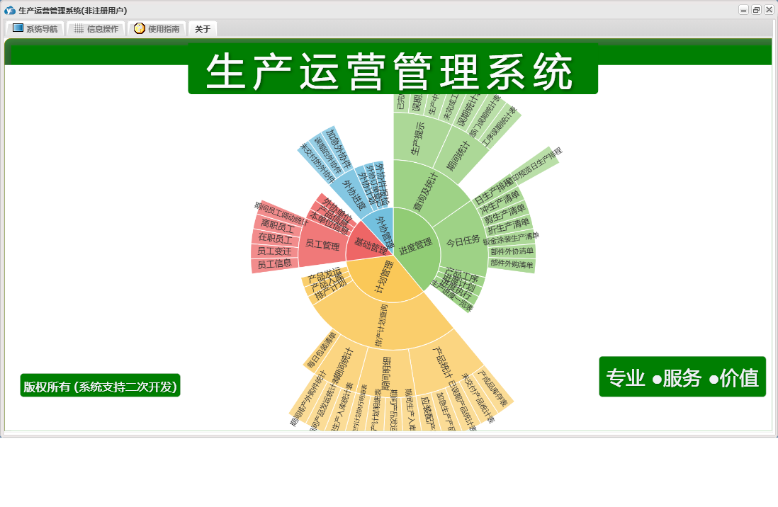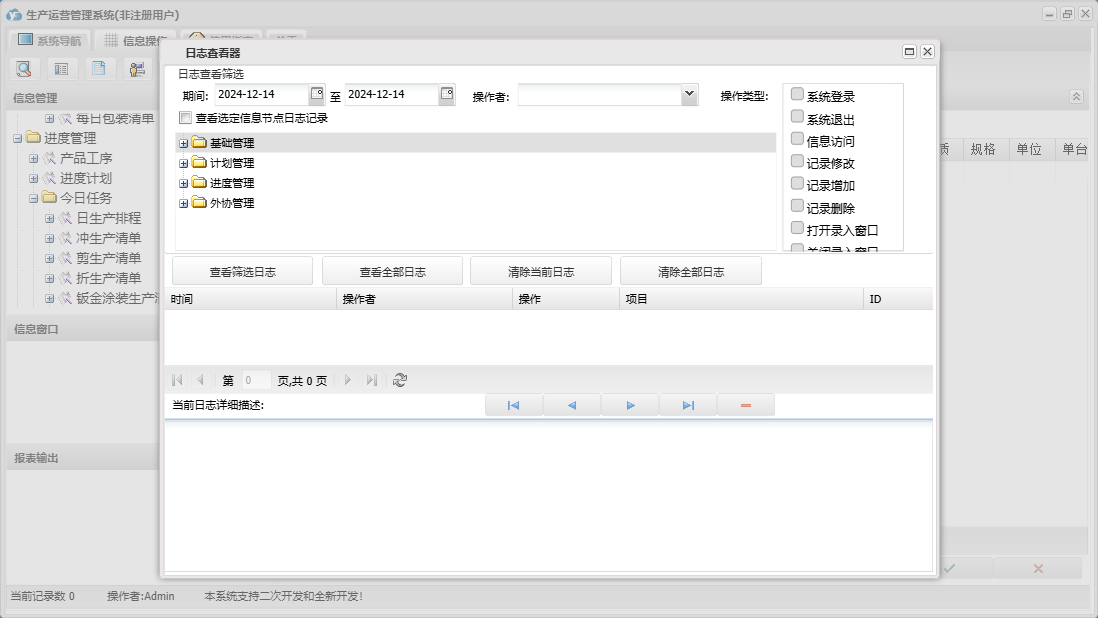 生产运营管理系统包含以下功能:外协件报检、产品发运、外协管理、产品信息、员工变迁、外协计划、本单位信息、进度计划、产品工序、权限设置、计划管理、排产计划、外协订单登记、外协单位、关于、进度执行、基础管理、生产流程、进度管理、员工信息、产品入库、日志、日生产排程等