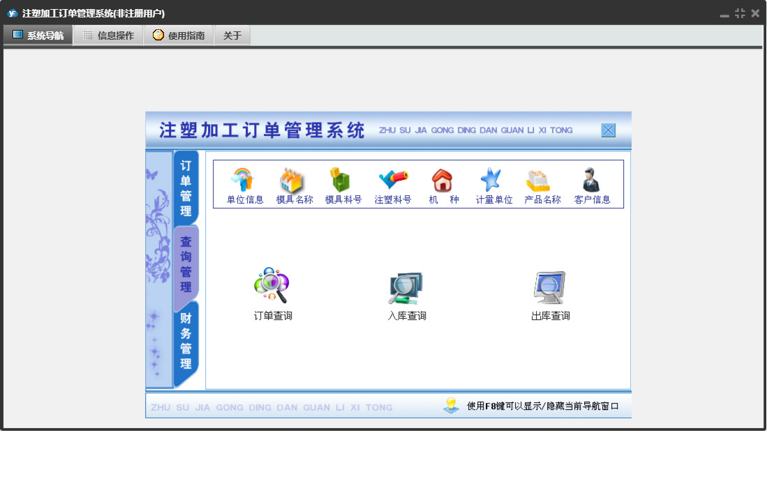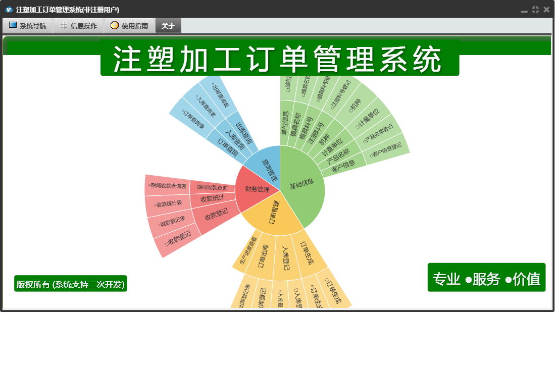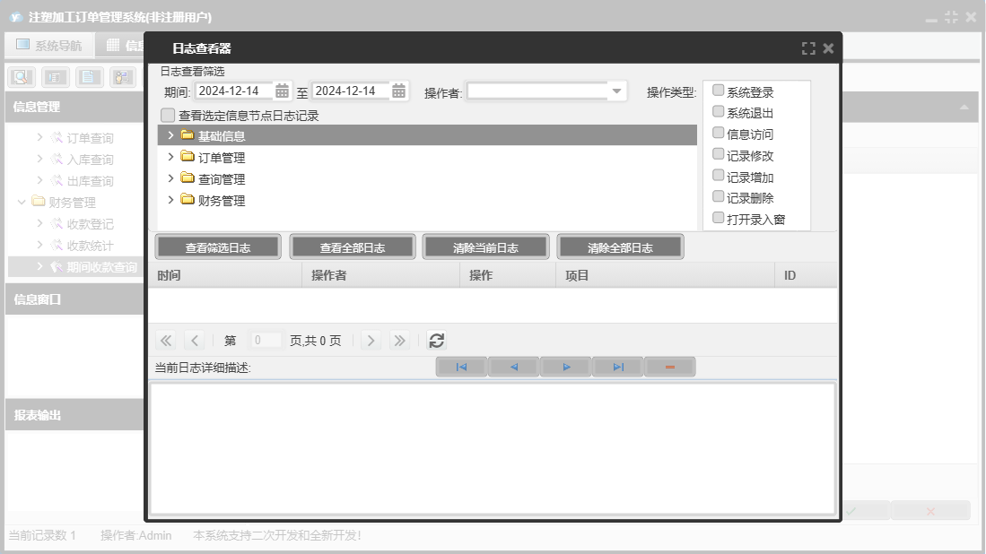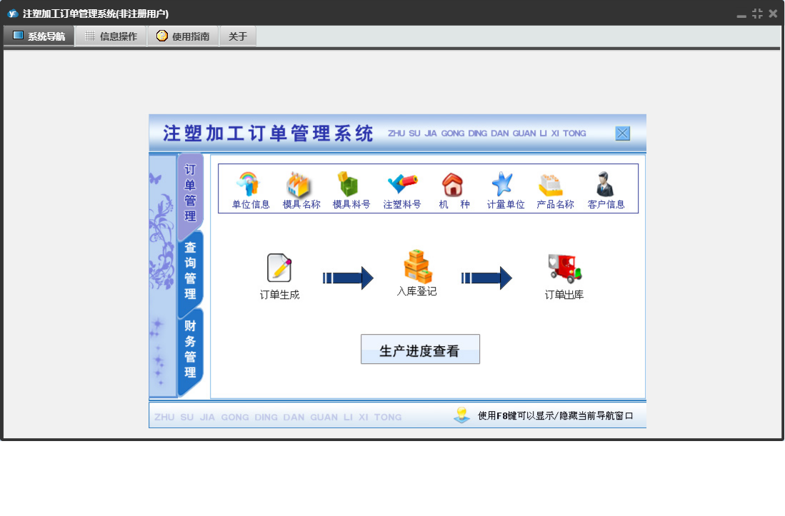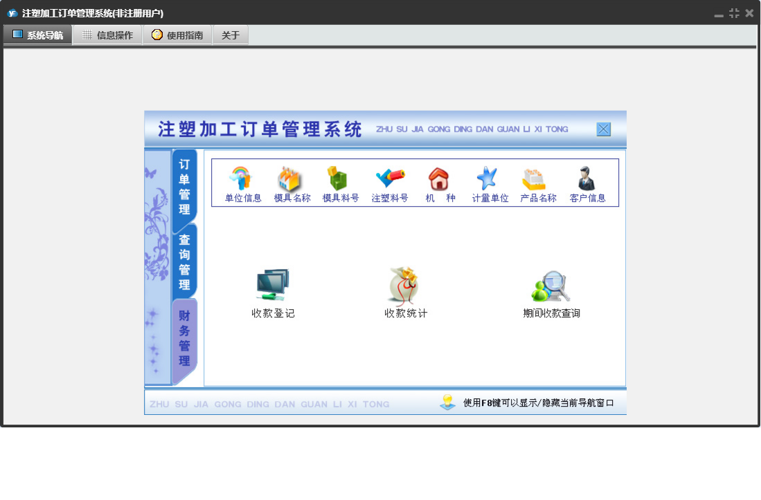注塑加工订单管理系统包含以下功能:单位信息、注塑料号、模具名称、入库登记、机种、订单出库、订单管理、日志、计量单位、关于、权限设置、产品名称、客户信息、收款登记、订单生成、财务管理、查询管理、模具料号等