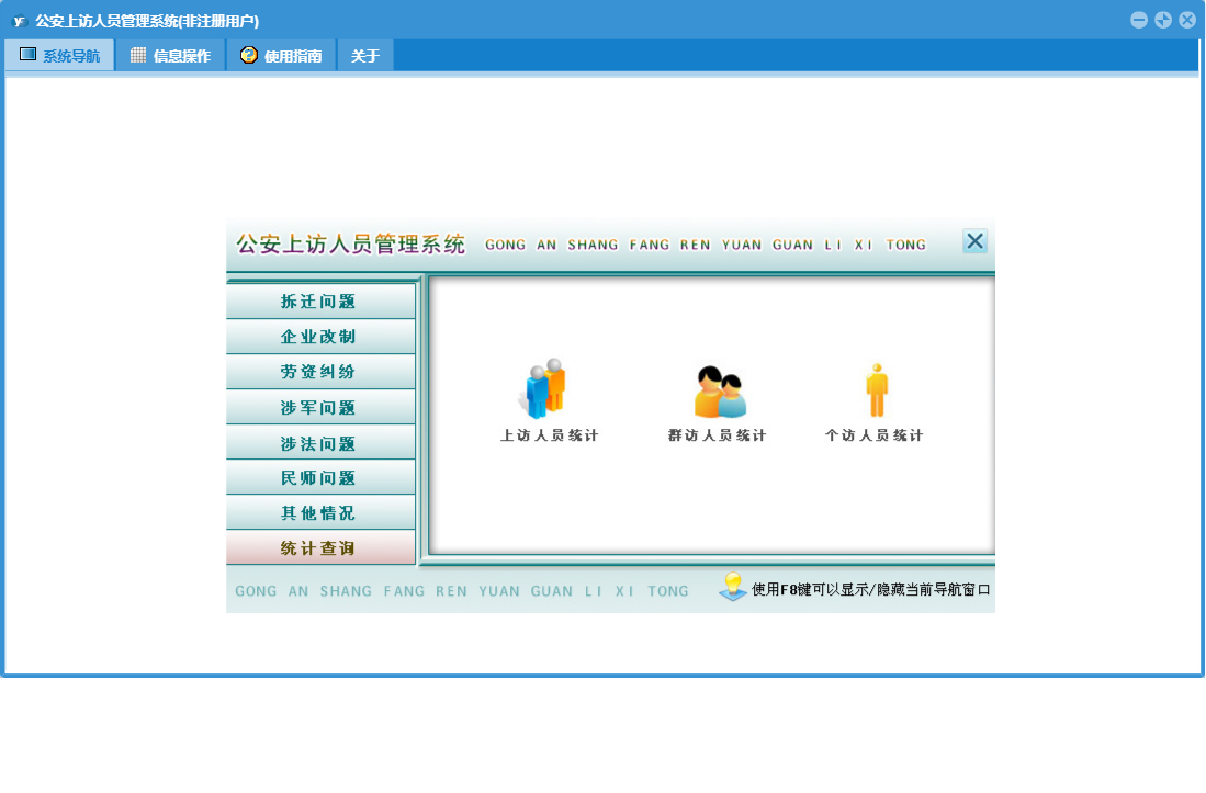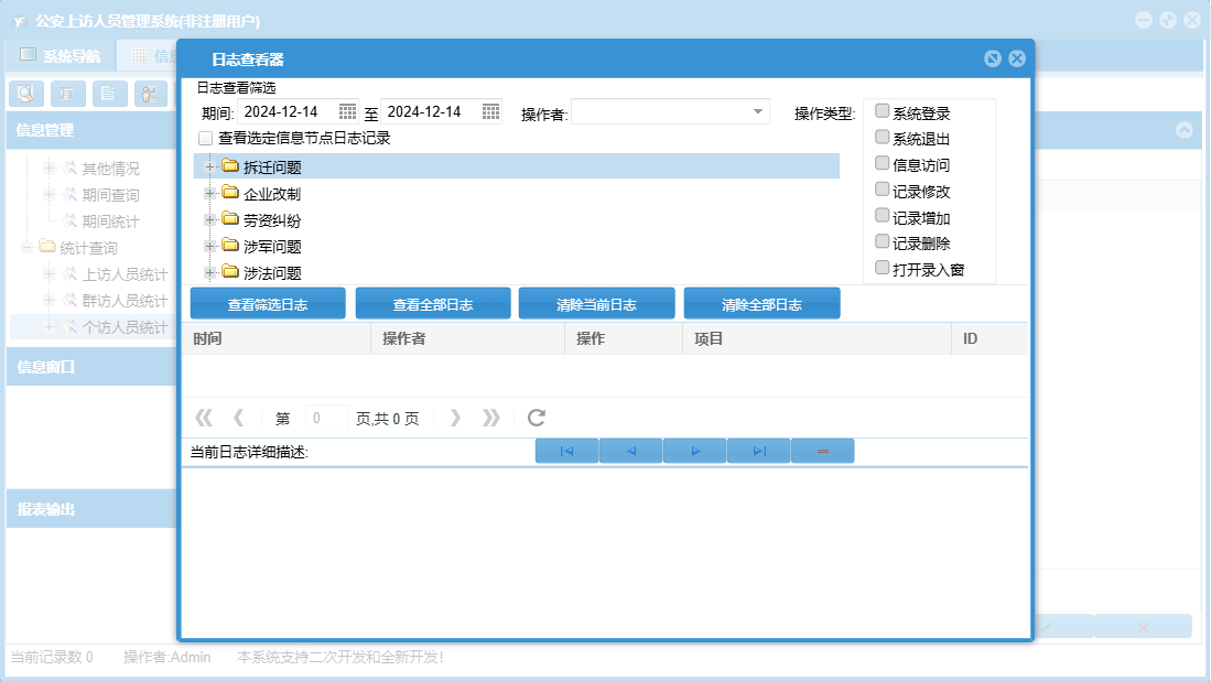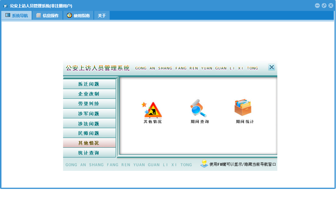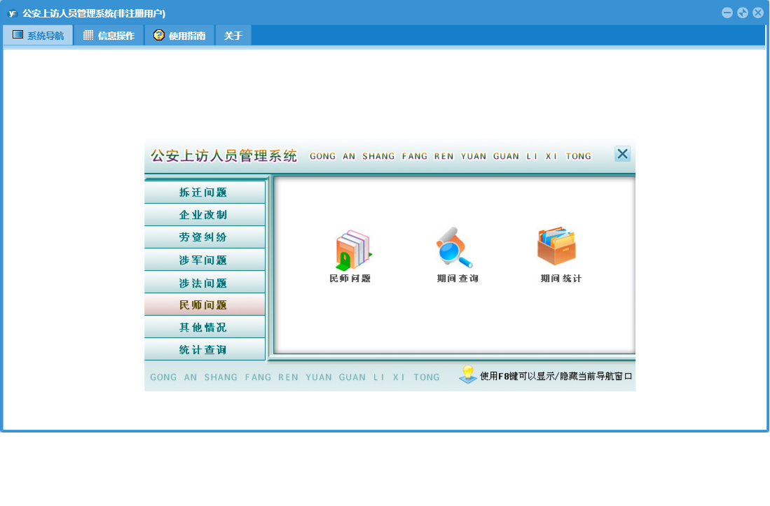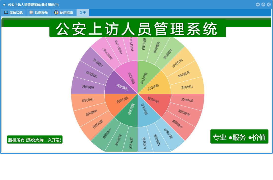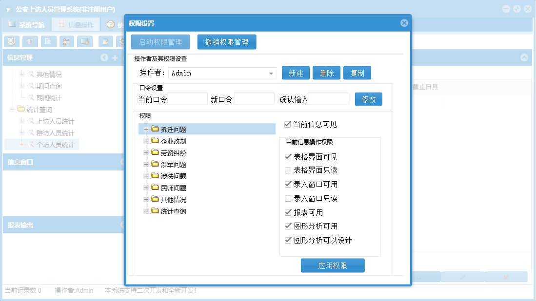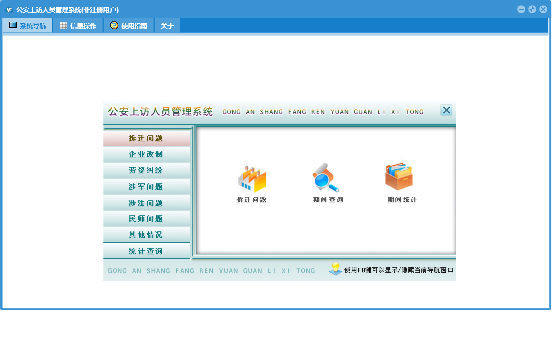 公安上访人员管理系统包含以下功能:涉军问题、涉法问题、其他情况、民师问题、劳资纠纷、日志、关于、权限设置、统计查询、拆迁问题、企业改制等