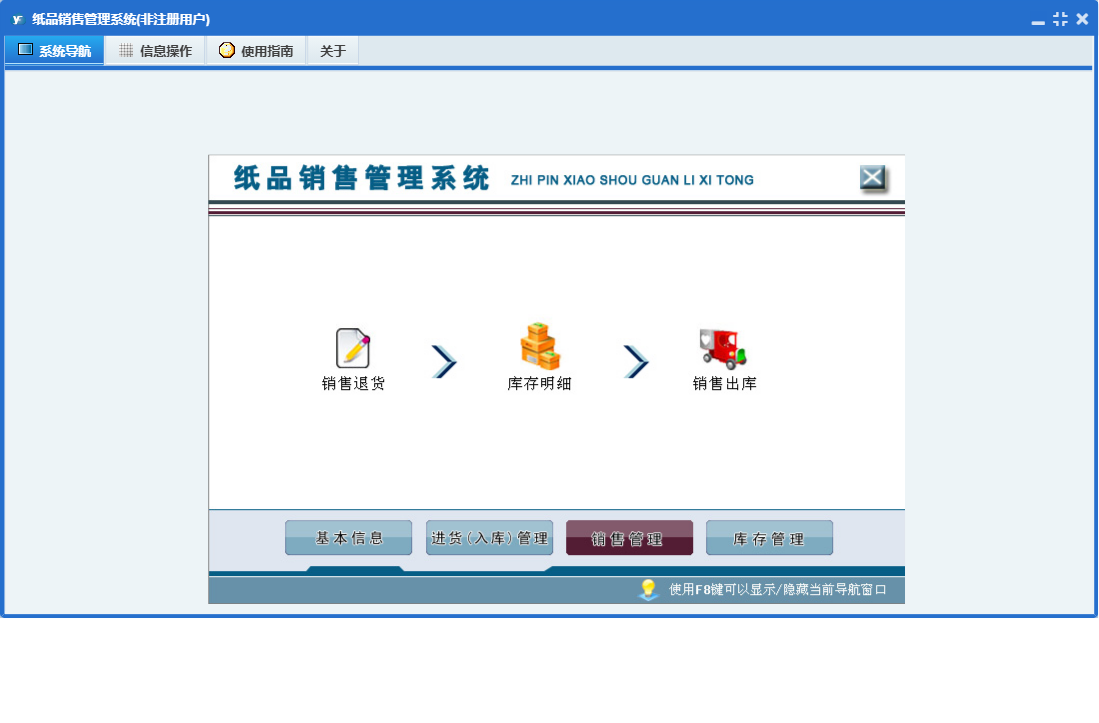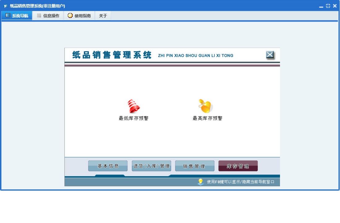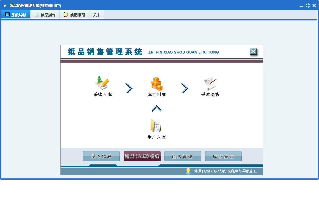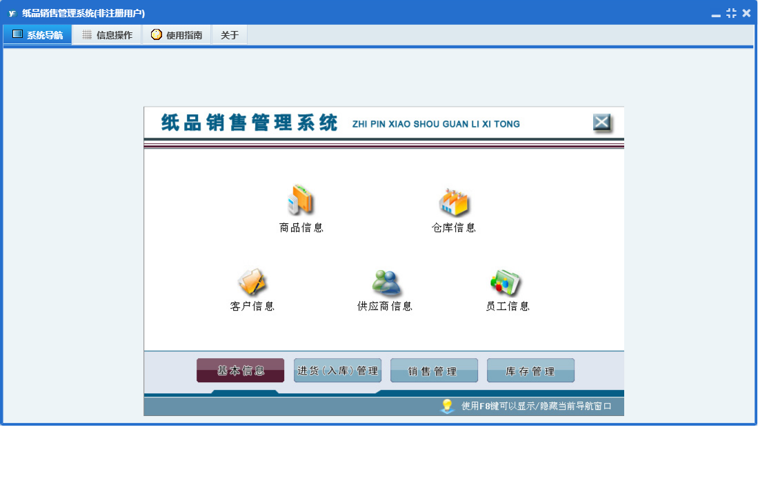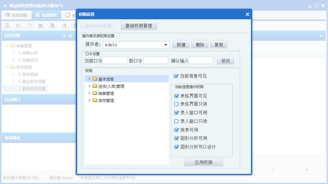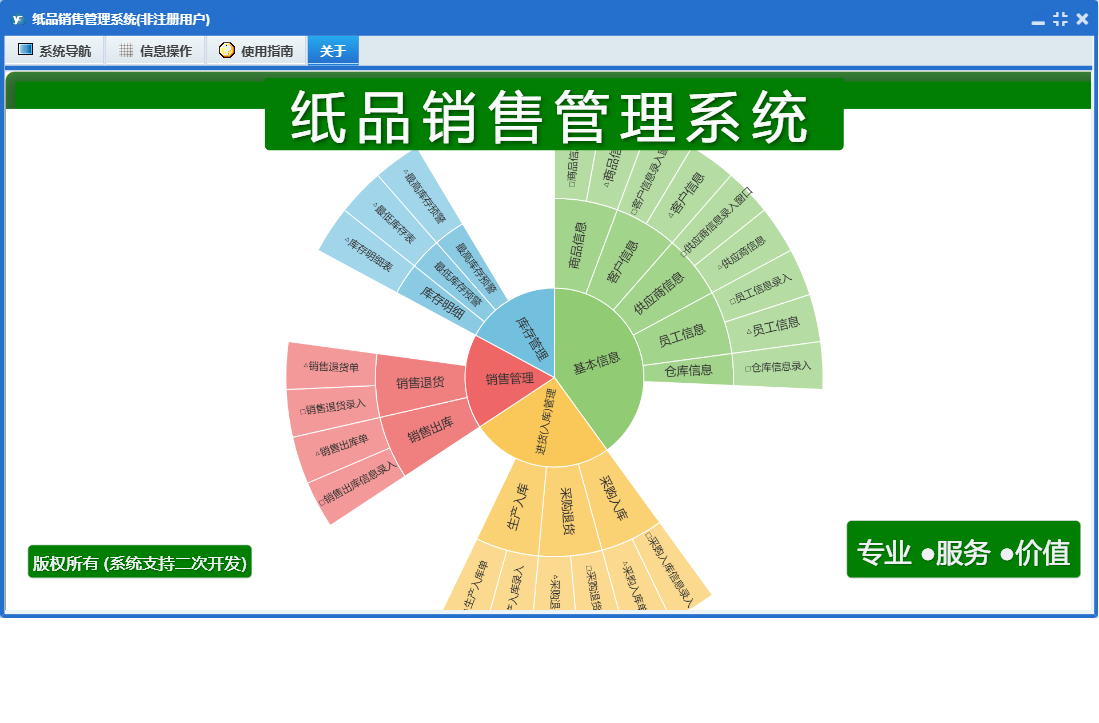 纸品销售管理系统包含以下功能:供应商信息、销售管理、生产入库、商品信息、员工信息、销售退货、日志、采购退货、进货入库管理、采购入库、关于、权限设置、基本信息、销售出库、库存管理、客户信息、仓库信息等