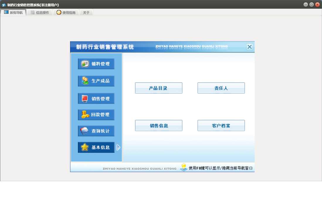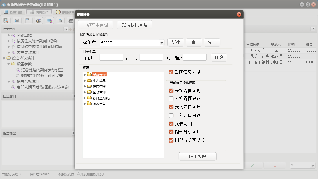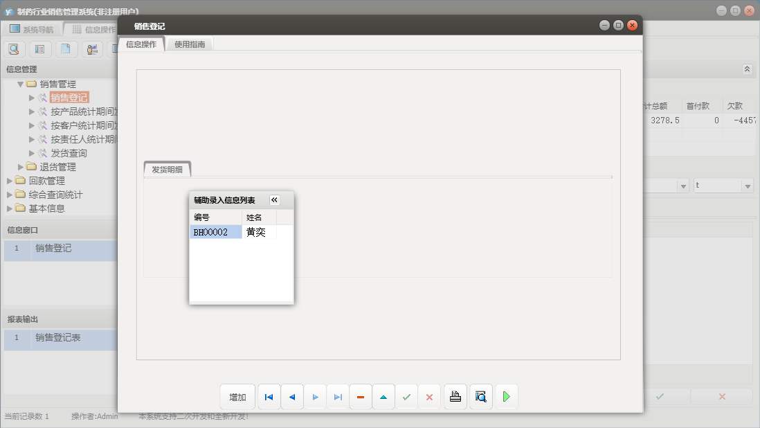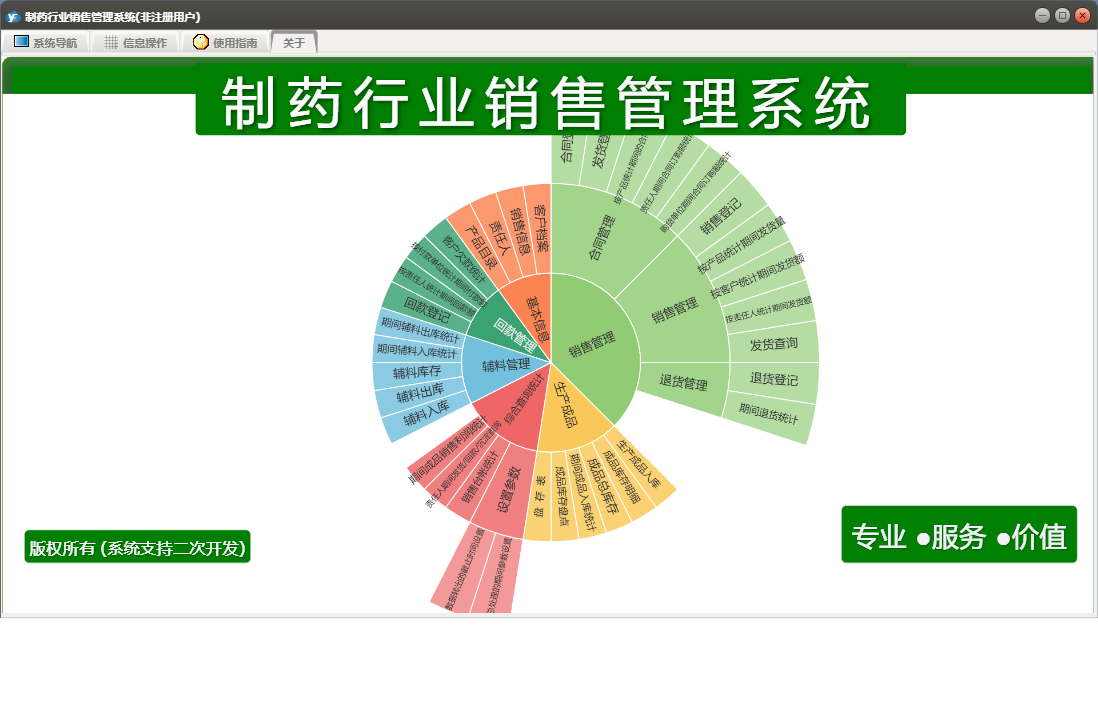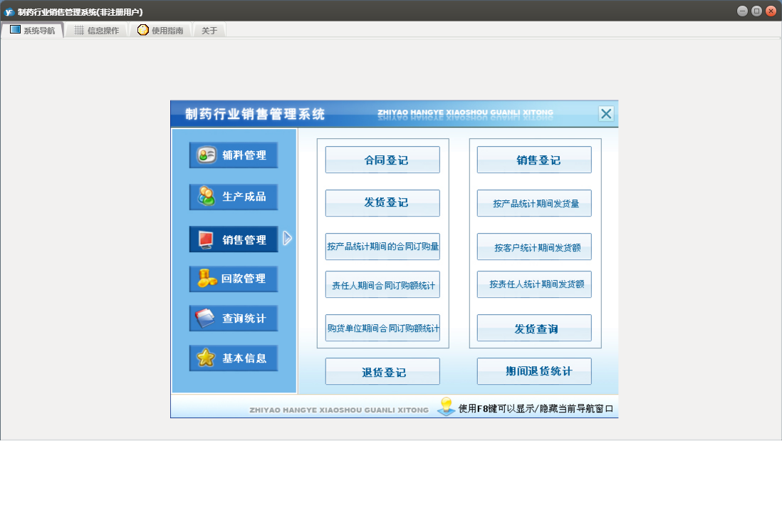 制药行业销售管理系统包含以下功能:销售管理、辅料管理、合同登记、发货登记、生产成品入库、退货登记、辅料出库、回款管理、成品库存盘点、权限设置、销售信息、客户档案、综合查询统计、关于、销售登记、基本信息、回款登记、成品生产、日志、产品目录、责任人、辅料入库等