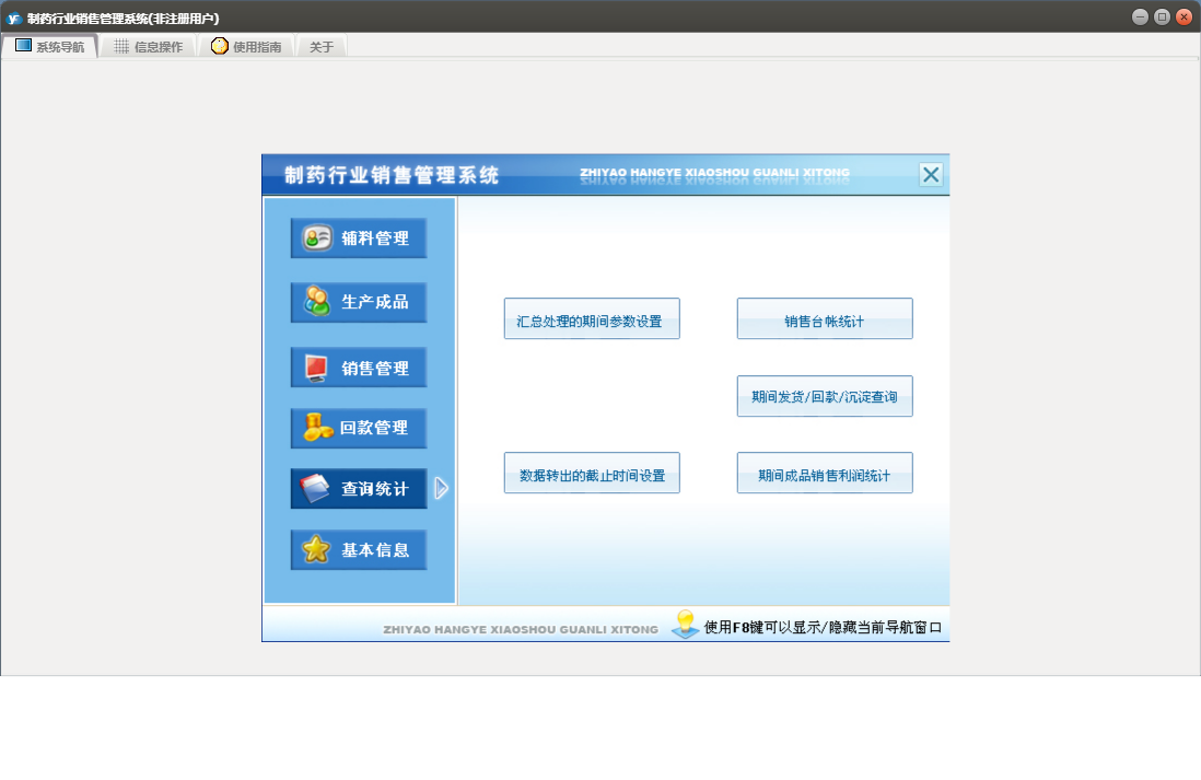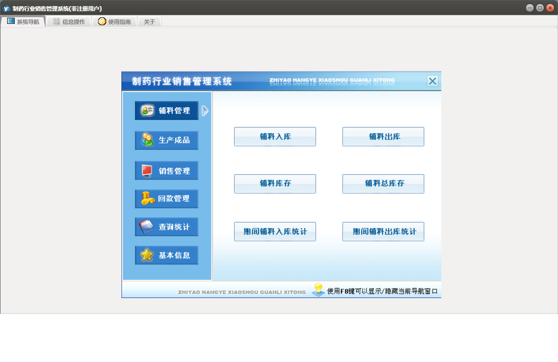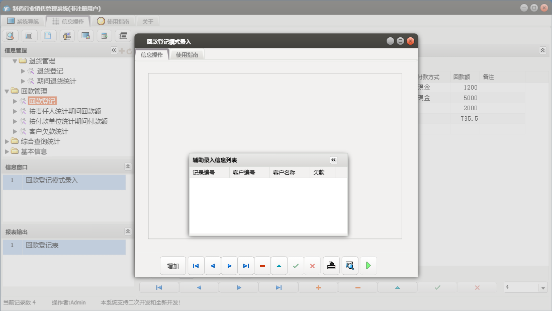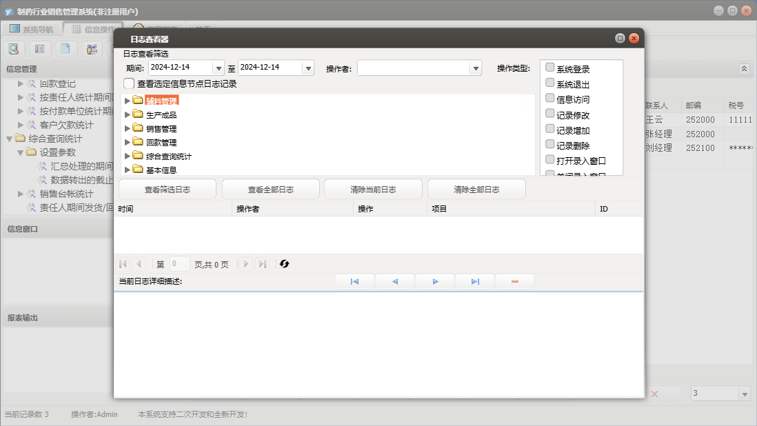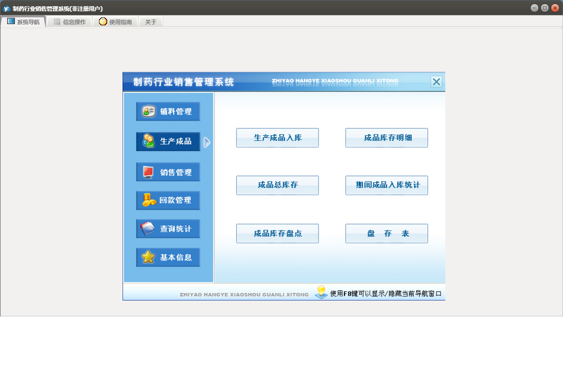 制药行业销售管理系统包含以下功能:销售管理、辅料管理、合同登记、发货登记、生产成品入库、退货登记、辅料出库、回款管理、成品库存盘点、权限设置、销售信息、客户档案、综合查询统计、关于、销售登记、基本信息、回款登记、成品生产、日志、产品目录、责任人、辅料入库等