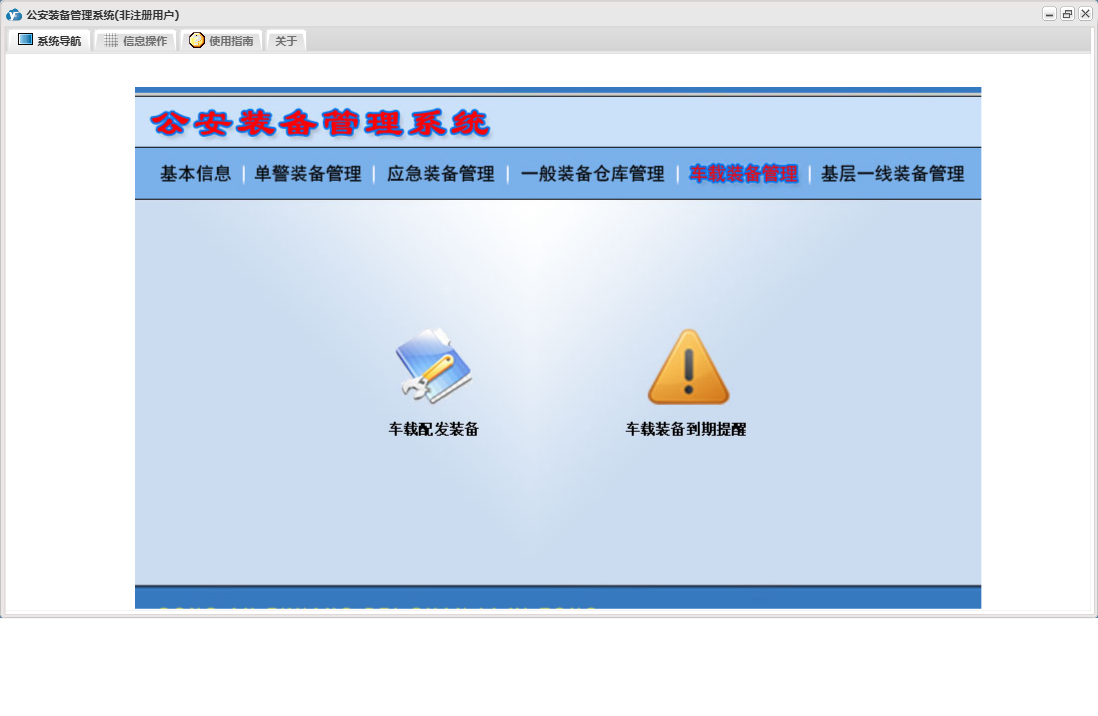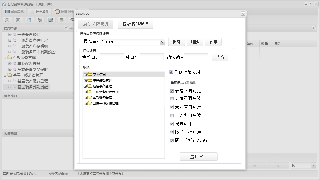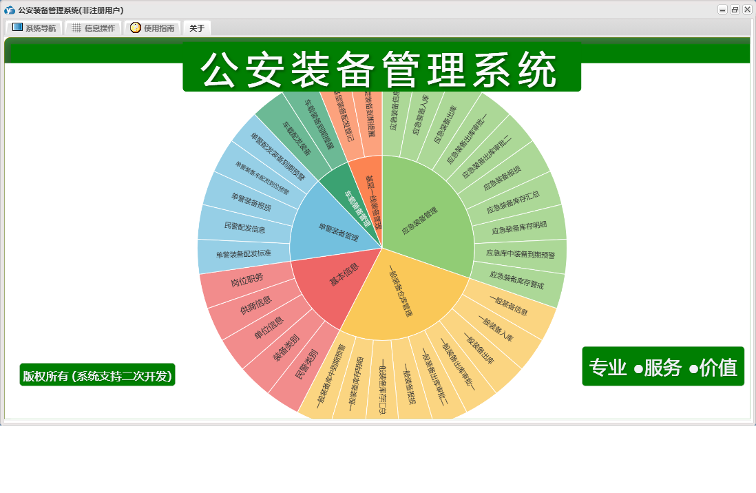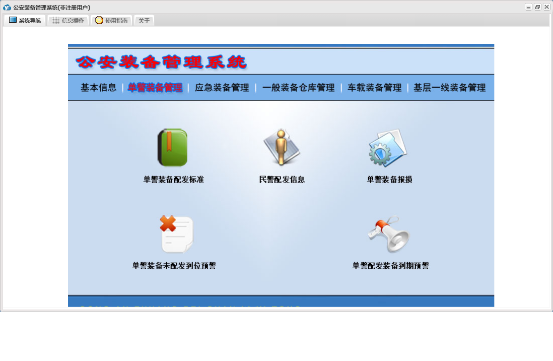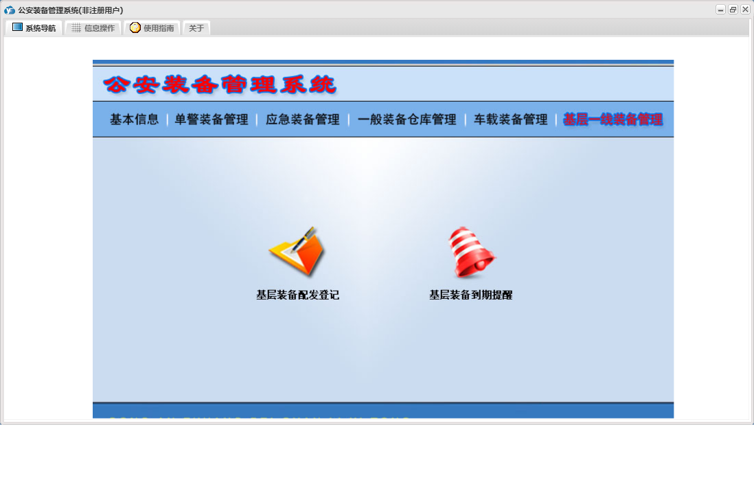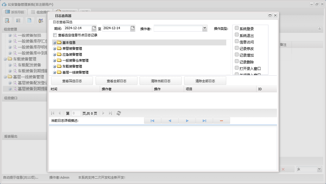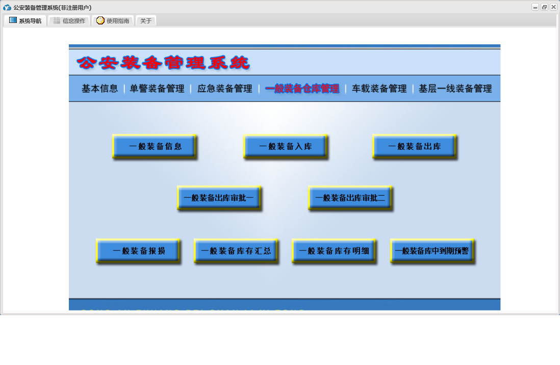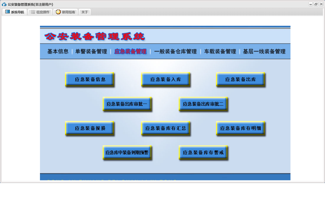 公安装备管理系统包含以下功能:单警装备报损、应急装备出库审批一、应急装备出库审批二、单警装备管理、一般装备仓库管理、一般装备出库、一般装备报损、日志、应急装备管理、车载装备管理、基层一线装备管理、关于、基本信息、一般装备出库审批一、权限设置、应急装备出库、一般装备出库审批二等