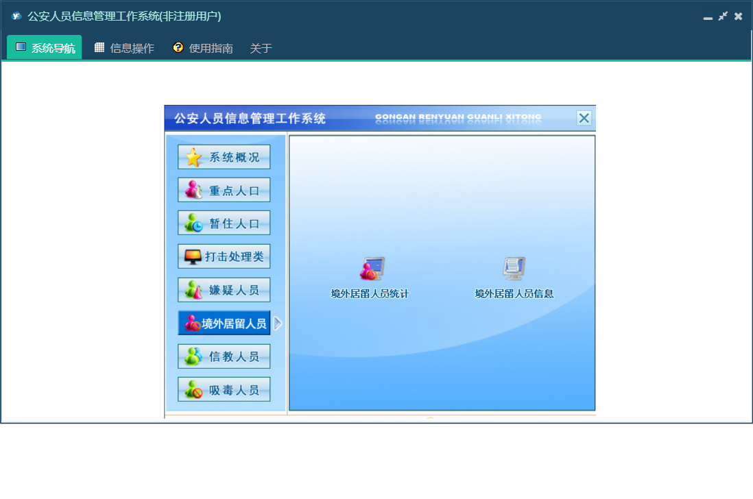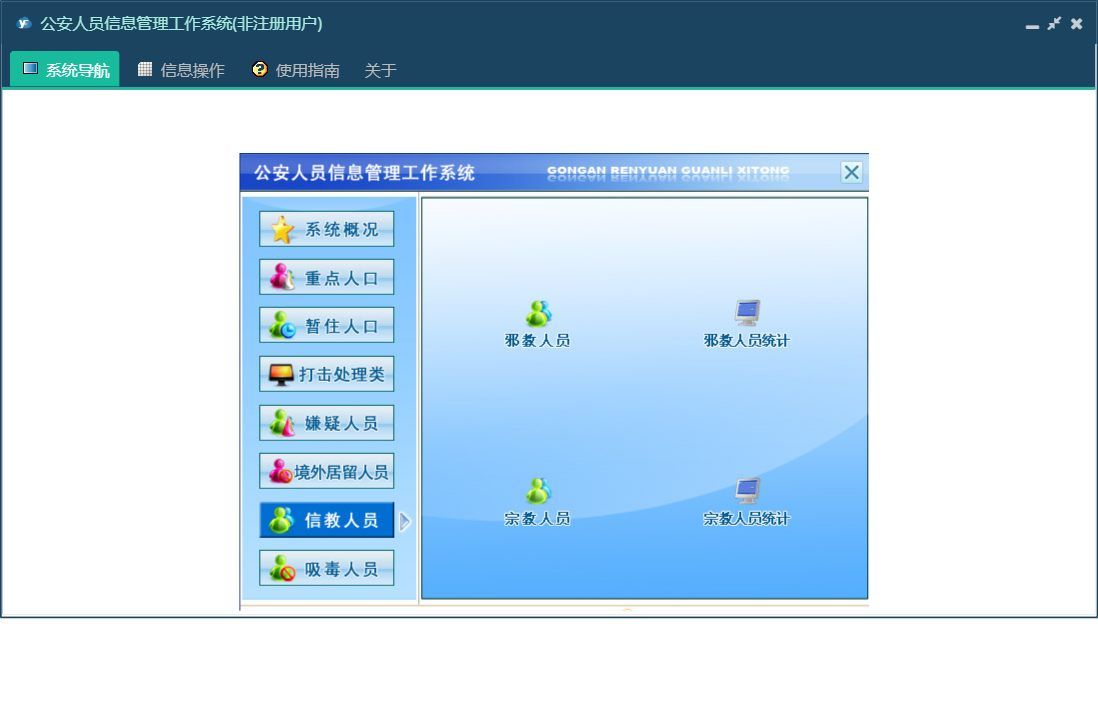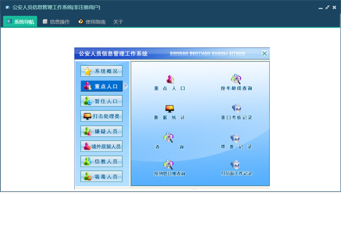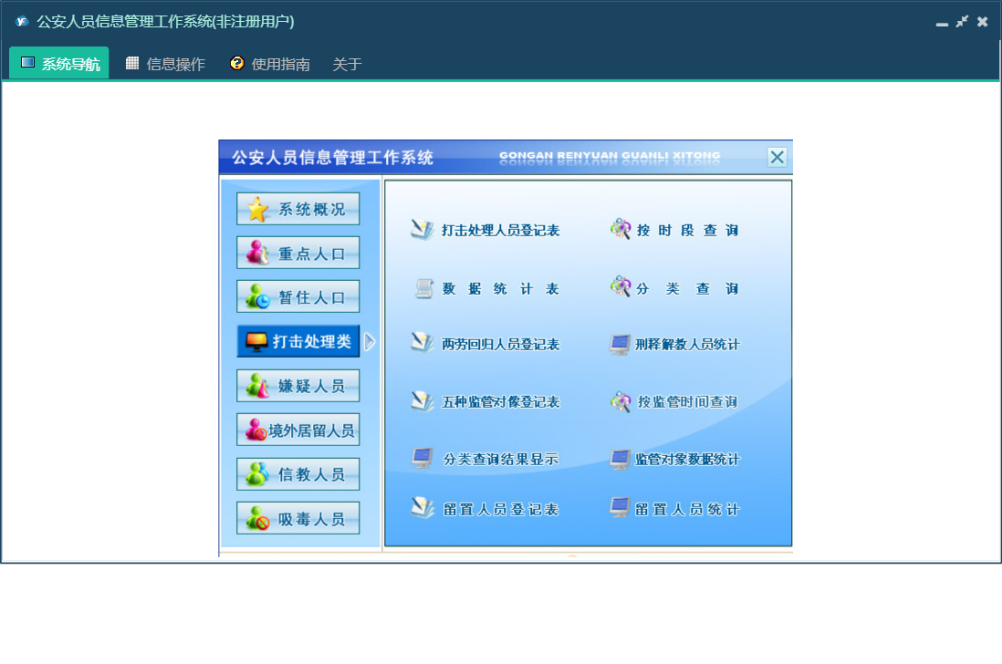 公安人员信息管理工作系统包含以下功能:五种监管对象、宗教人员、邪教人员、吸毒人员、考核记录、刑释解教人员、帮教记录、权限设置、月见面记录、境外居留人员、打击处理人员、信教人员、关于、留置人员、嫌疑人员、日志、暂住人口、重点人口、打击处理类等