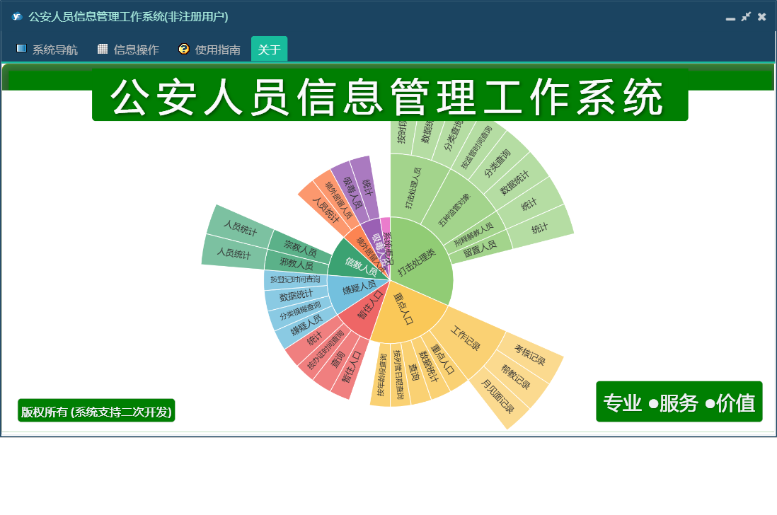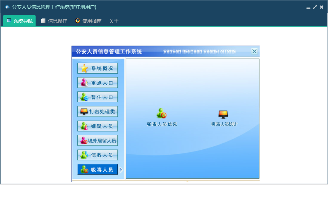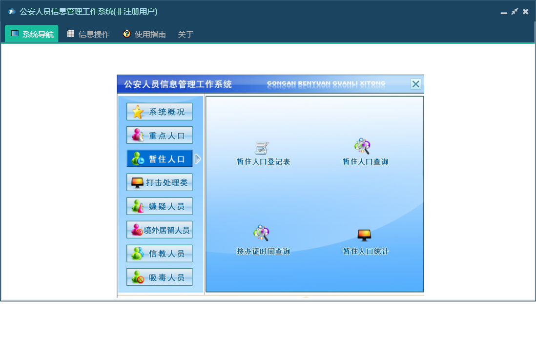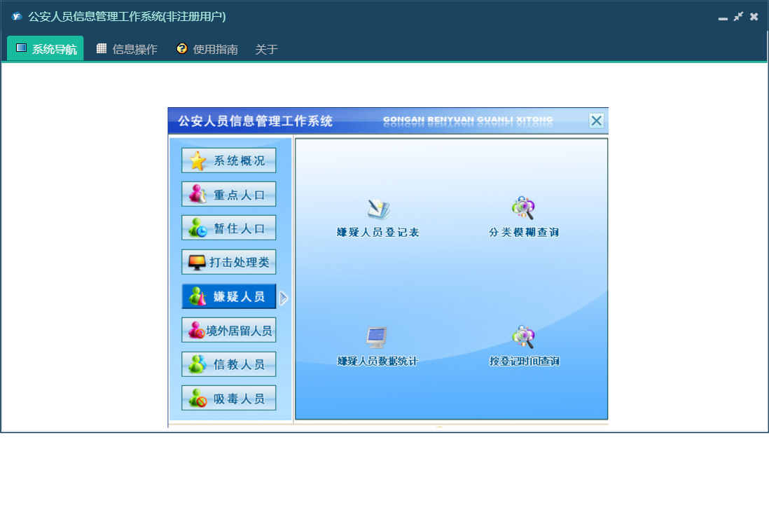 公安人员信息管理工作系统包含以下功能:五种监管对象、宗教人员、邪教人员、吸毒人员、考核记录、刑释解教人员、帮教记录、权限设置、月见面记录、境外居留人员、打击处理人员、信教人员、关于、留置人员、嫌疑人员、日志、暂住人口、重点人口、打击处理类等