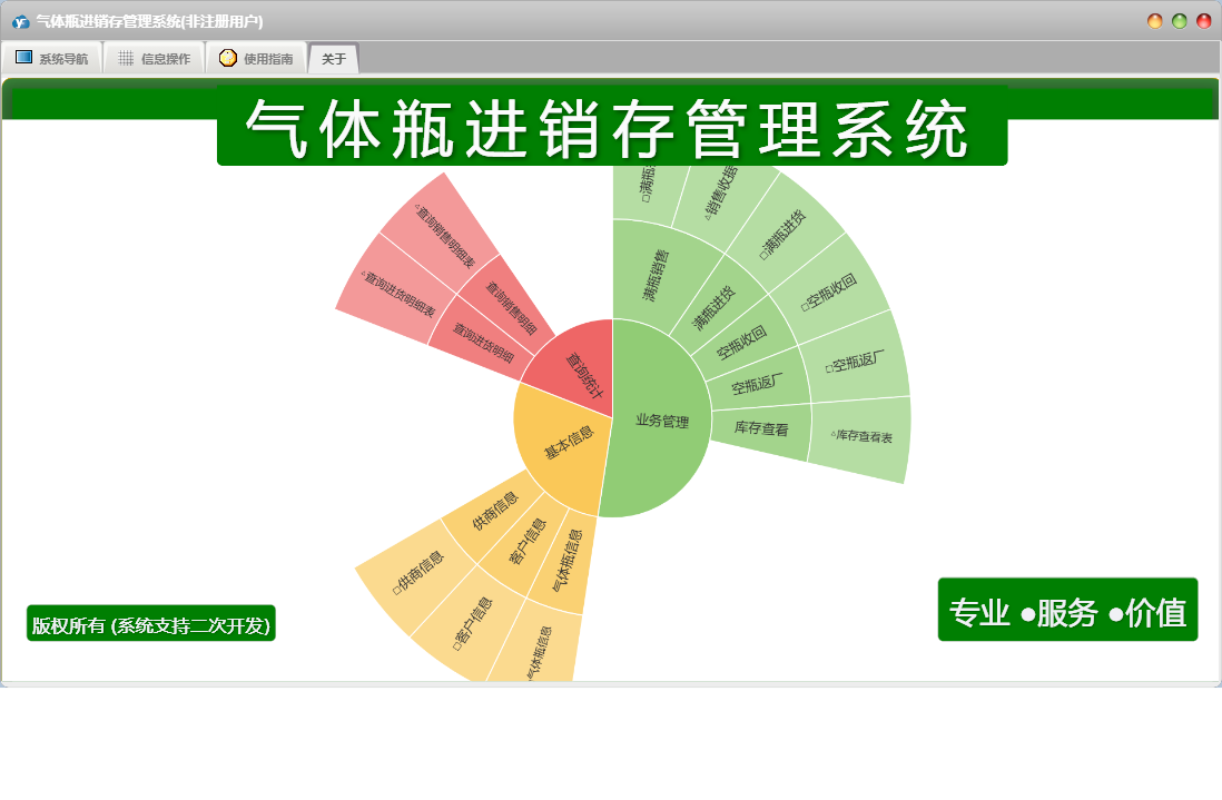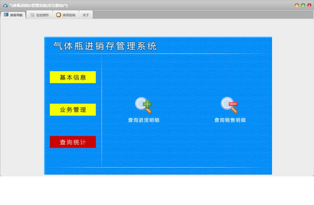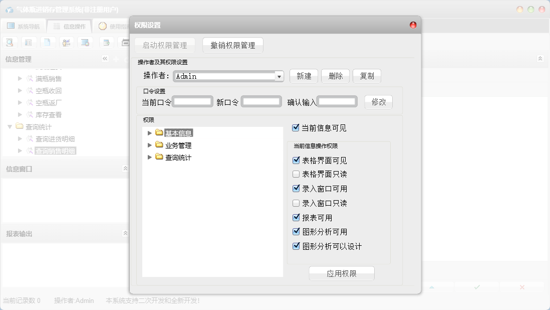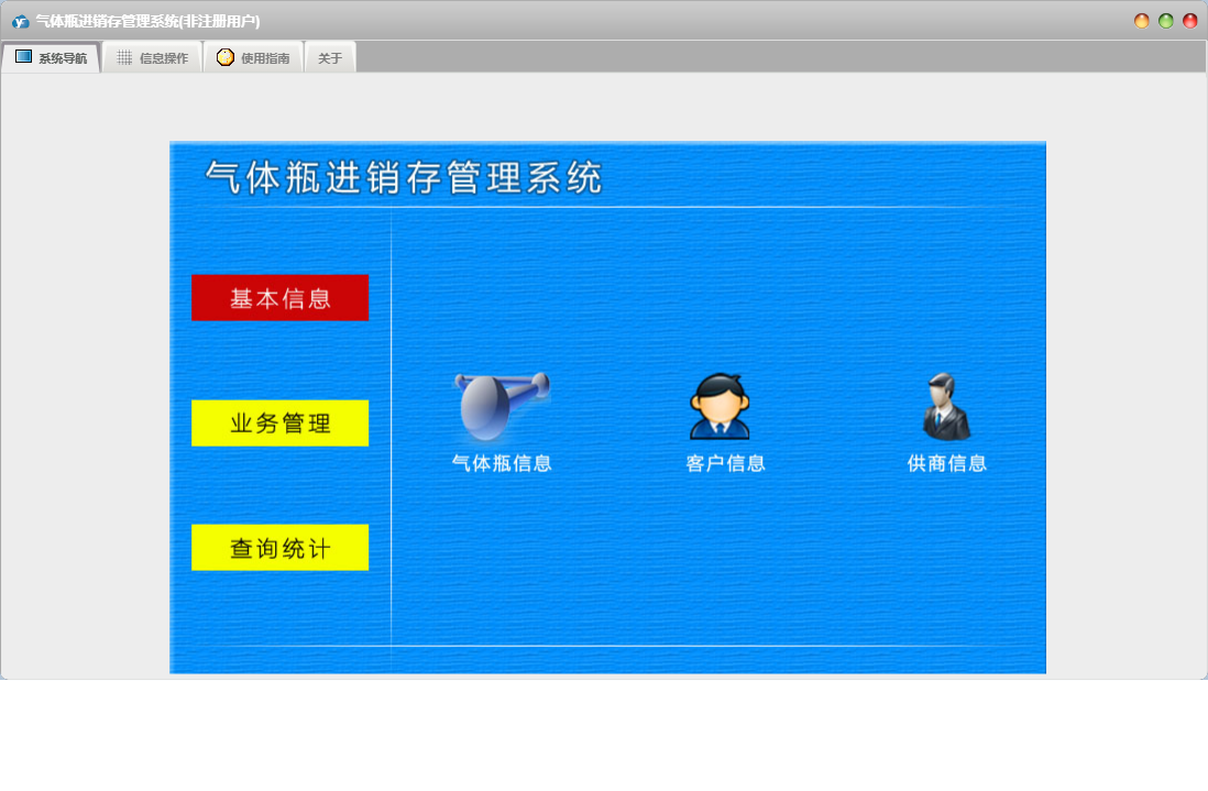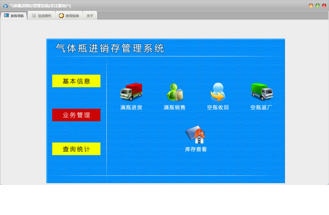 气体瓶进销存管理系统包含以下功能:查询统计、空瓶返厂、空瓶收回、日志、满瓶销售、关于、权限设置、基本信息、气体瓶信息、客户信息、业务管理、满瓶进货、供商信息等