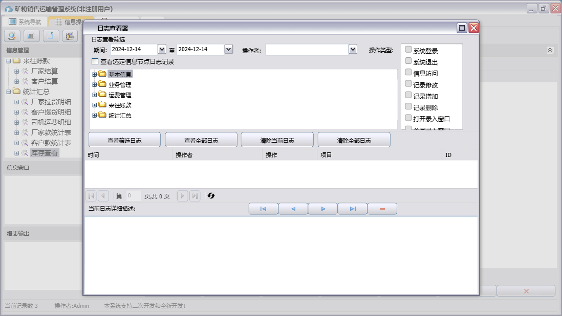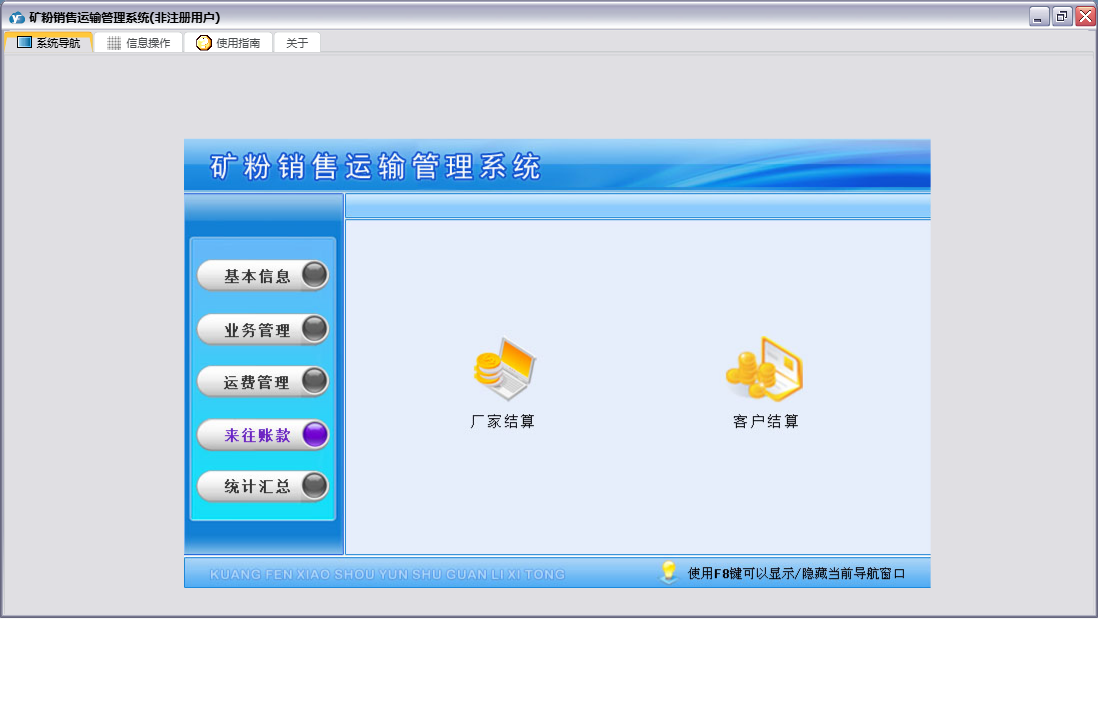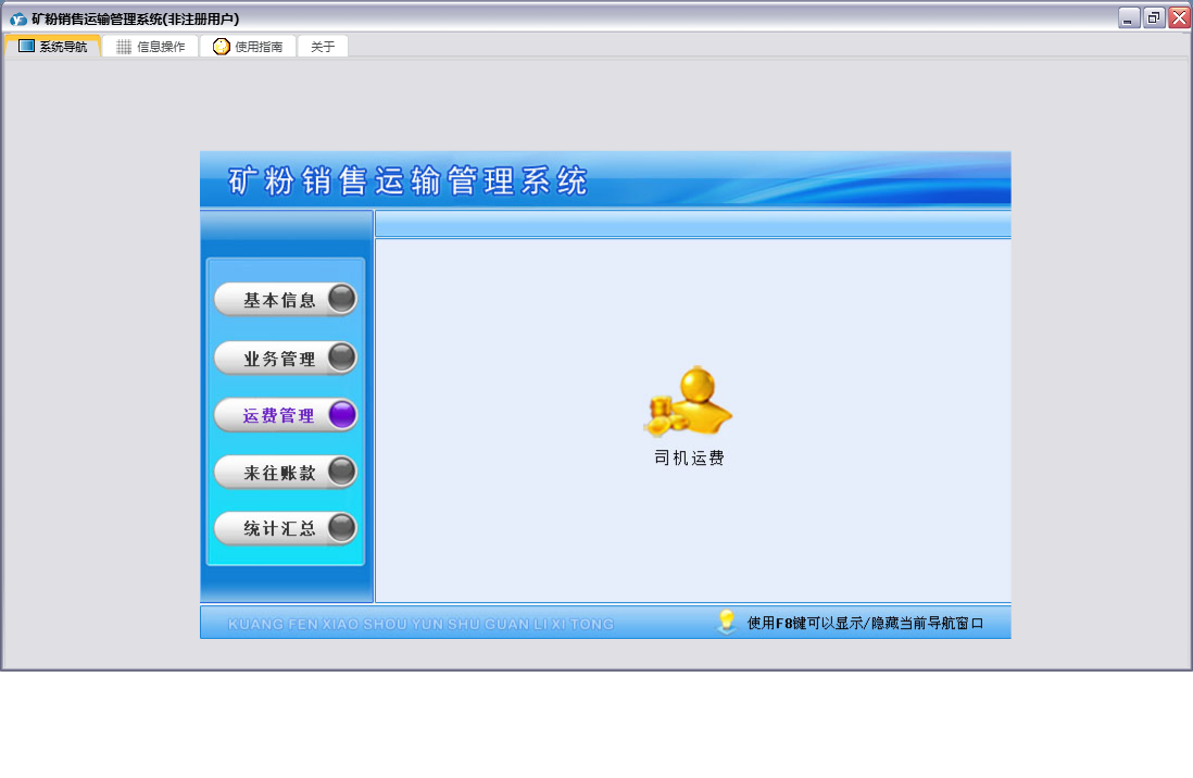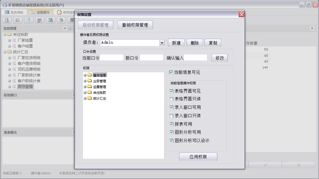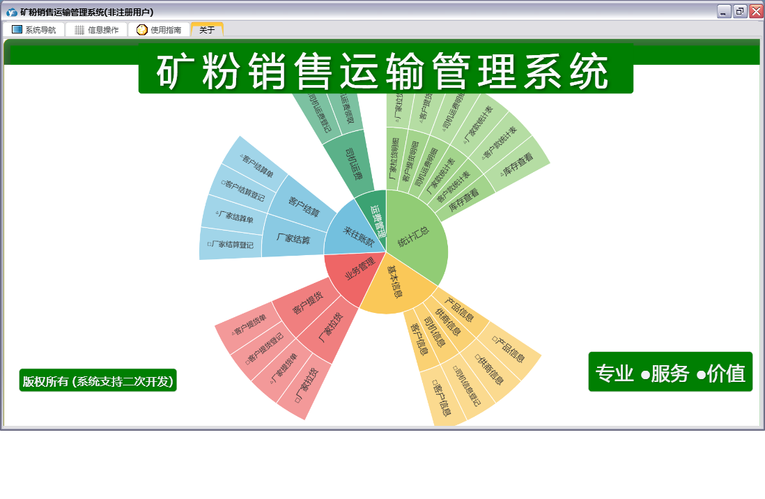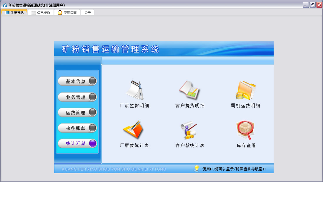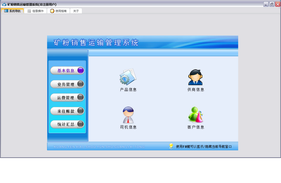 矿粉销售运输管理系统包含以下功能:司机信息、客户结算、客户提货、运费管理、日志、来往账款、统计汇总、关于、权限设置、司机运费、厂家结算、基本信息、客户信息、业务管理、产品信息、供商信息、厂家拉货等