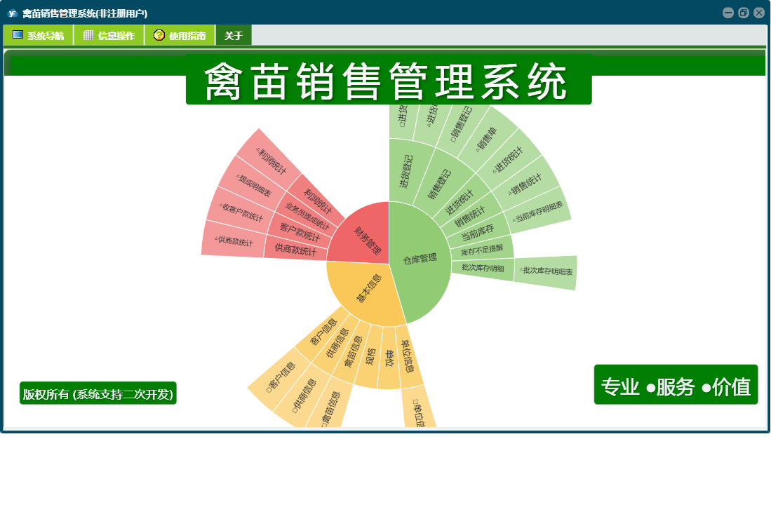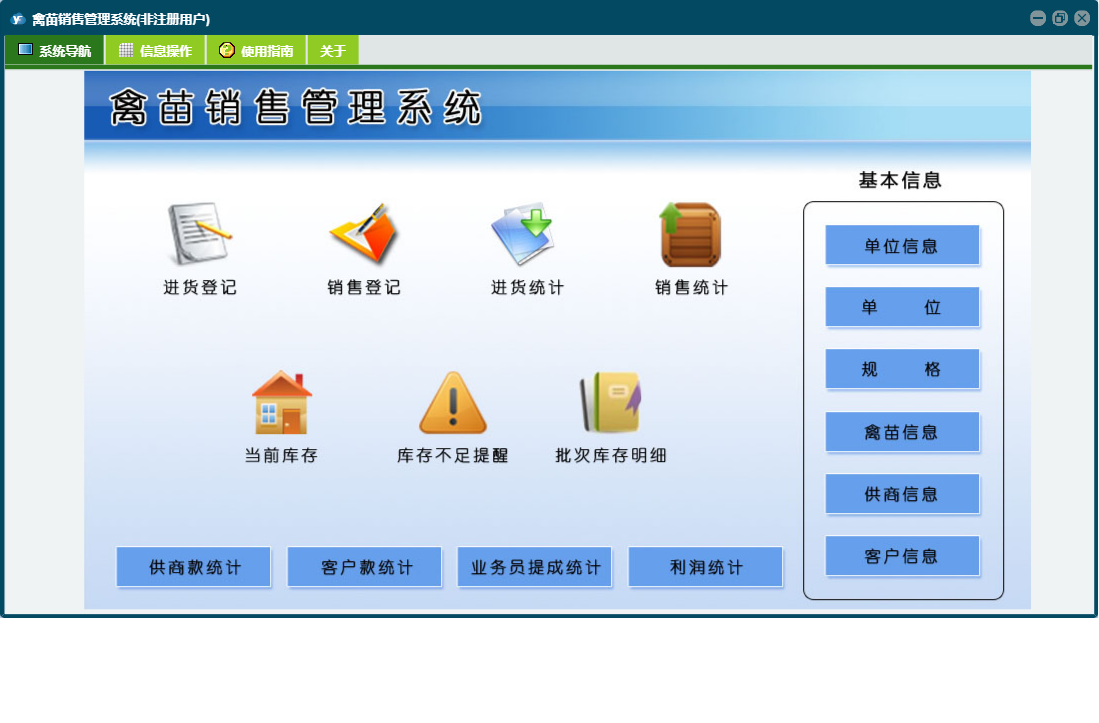 禽苗销售管理系统包含以下功能:面板、日志、关于、权限设置、进货登记等