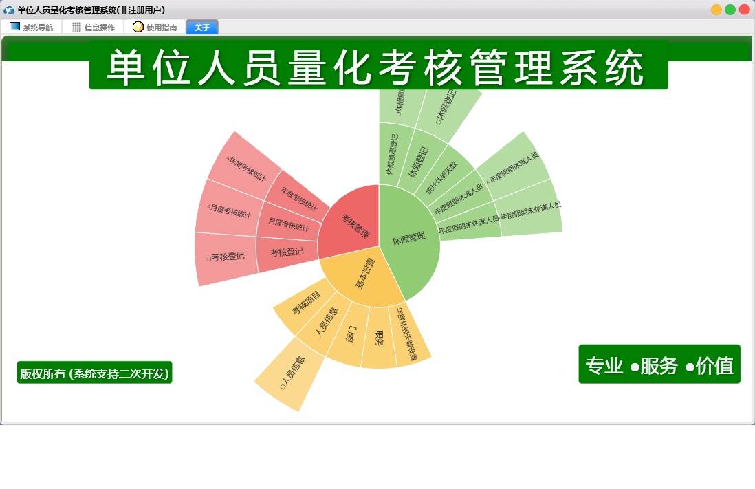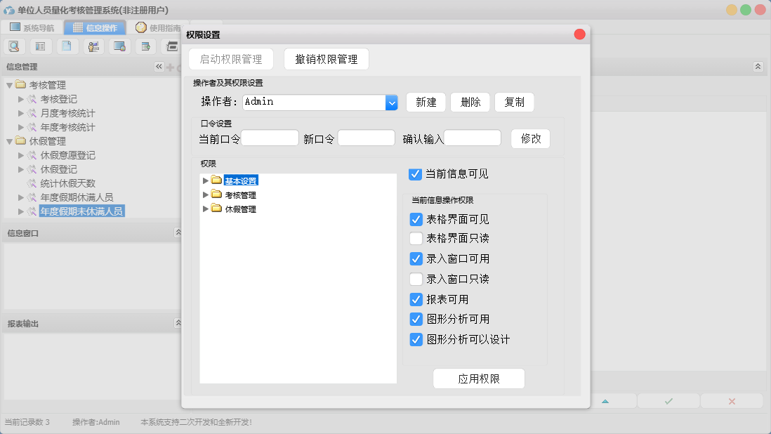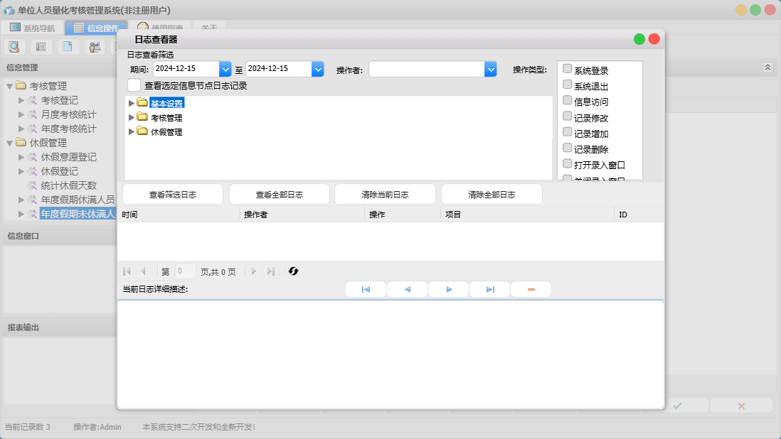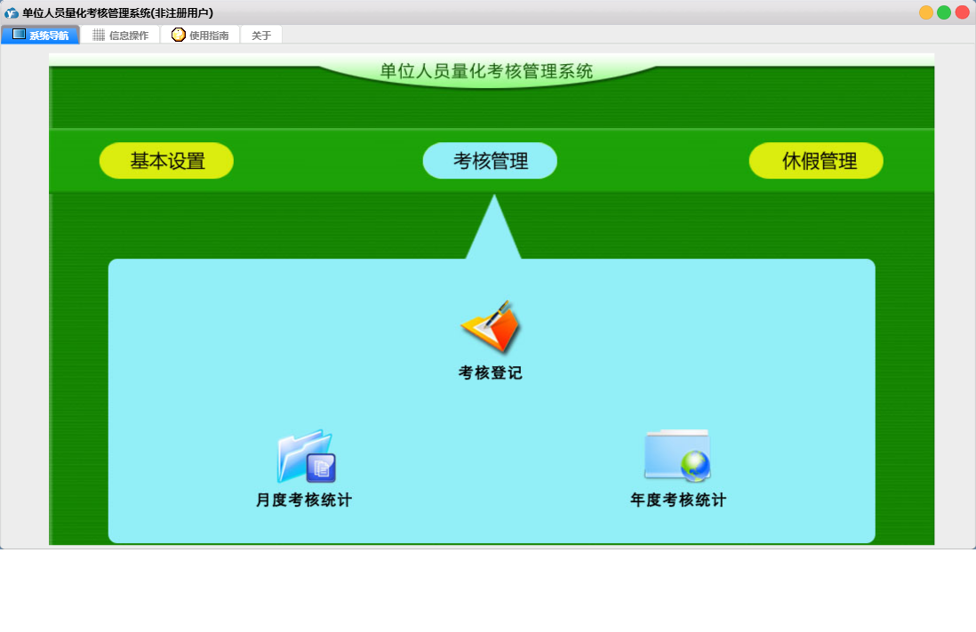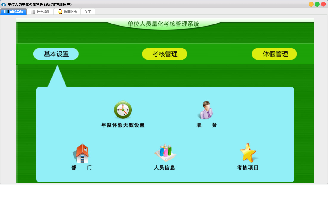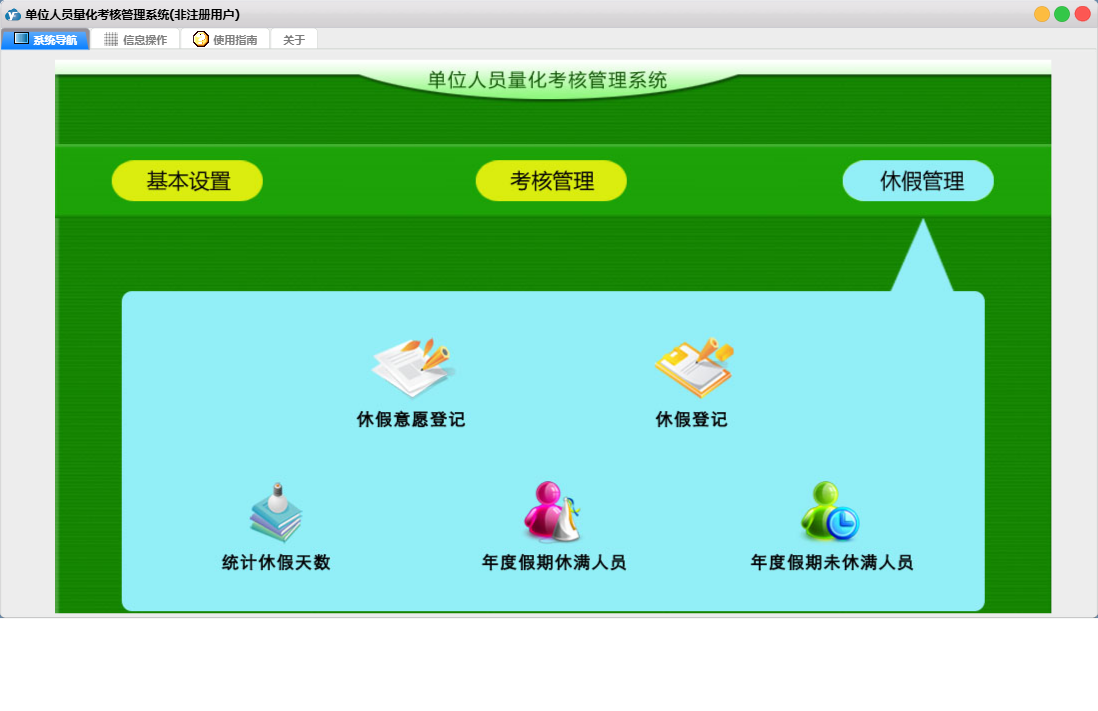 单位人员量化考核管理系统包含以下功能:考核管理、休假管理、基本设置、考核登记、日志、关于、休假登记、权限设置、人员信息、休假意愿登记等