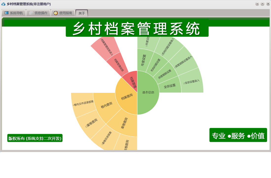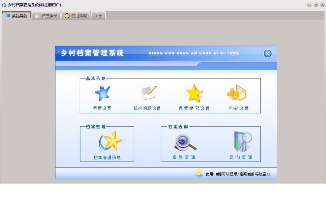 乡村档案管理系统包含以下功能:保管期限设置、全宗设置、案卷查询、卷内查询、机构问题设置、日志、关于、权限设置、年度设置、档案管理信息、主面板等