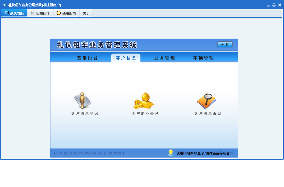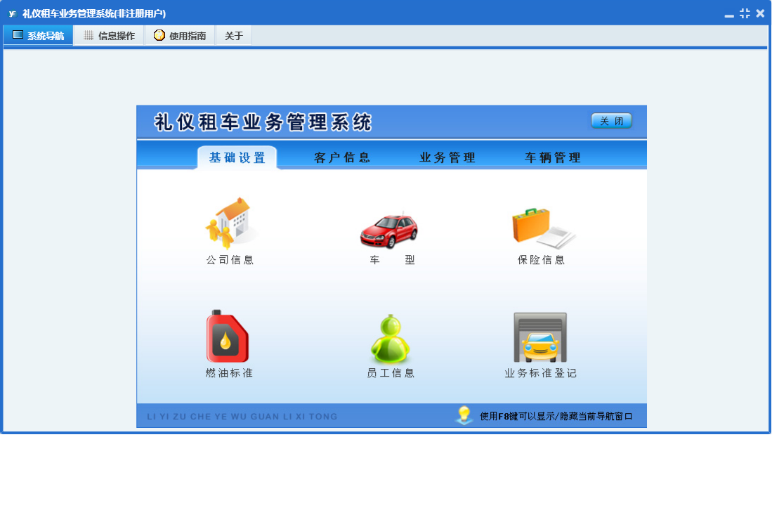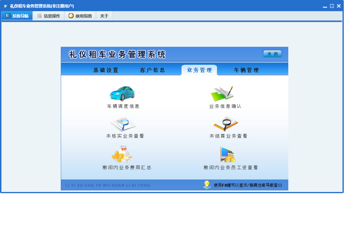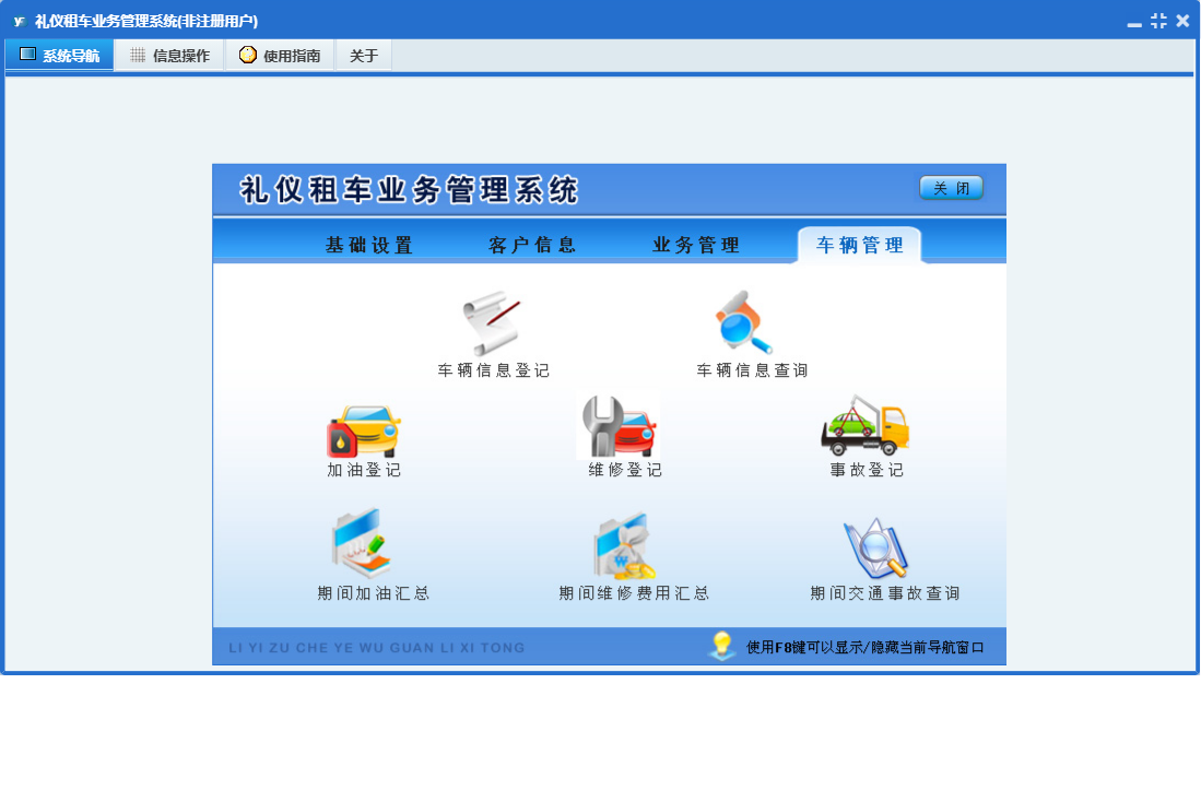 礼仪租车业务管理系统包含以下功能:期间交通事故查询、基础设置、车辆信息登记、维修登记、车辆管理、未结算业务查看、客户定价登记、加油登记、车辆调度信息、未核实业务查看、公司信息、业务标准登记、事故登记、权限设置、车辆信息查询、客户信息登记、关于、客户信息、业务信息确认、业务管理、员工信息、保险信息、日志、客户信息查询等