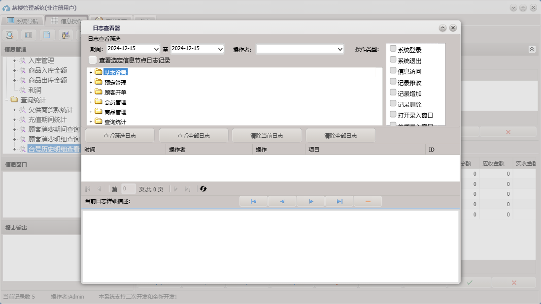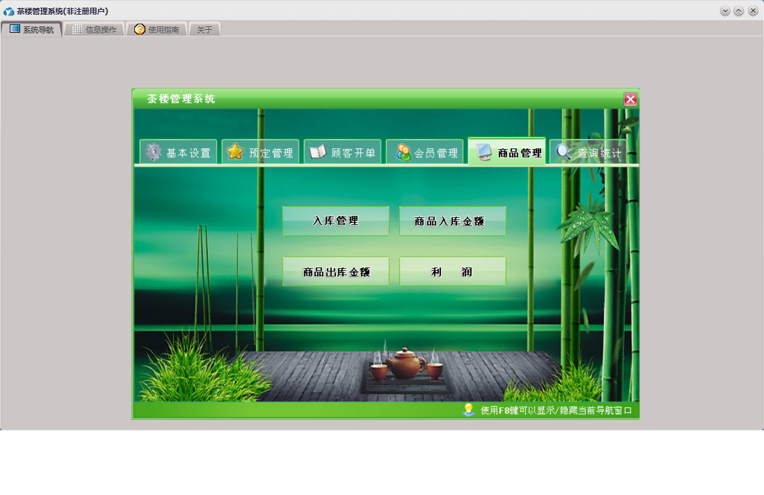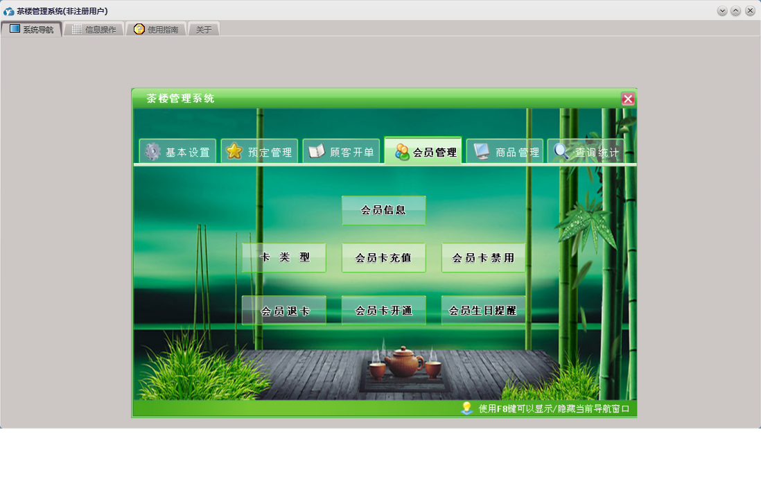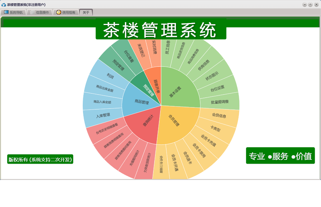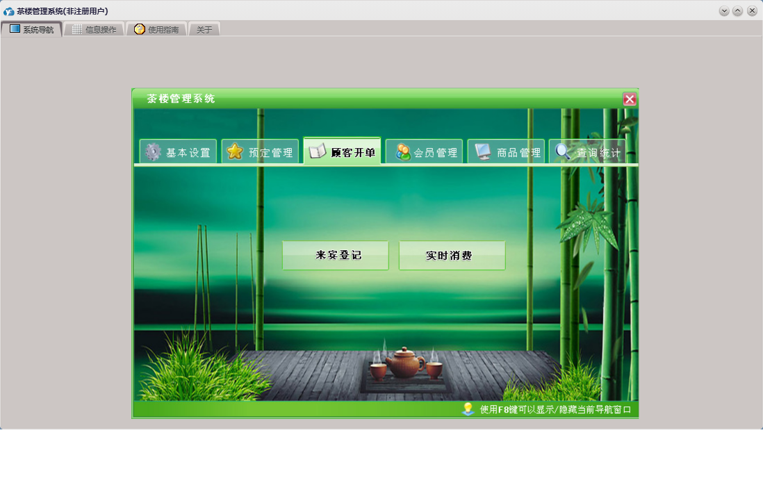 茶楼管理系统包含以下功能:顾客开单、会员信息、查询统计、基本设置、卡类型、状态图示、来宾登记、商品进货信息、商品消费信息、会员卡开通、会员卡禁用、权限设置、预定管理、台位查看、关于、会员卡充值、入库管理、商品管理、会员管理、员工信息、日志、台位设置、实时消费、会员退卡、台号历史明细查看、供商信息等