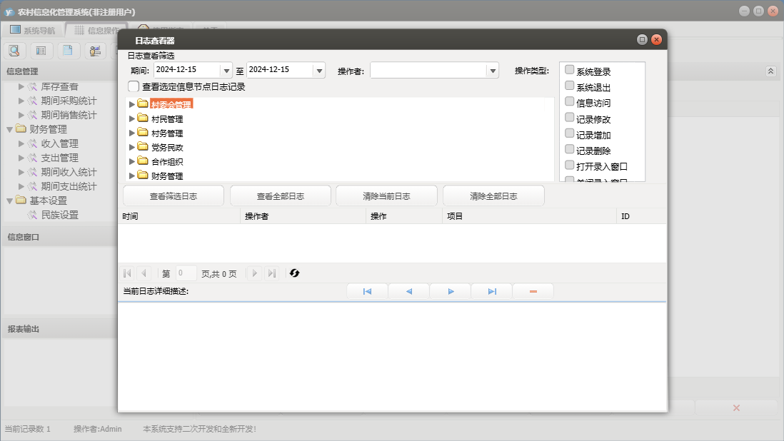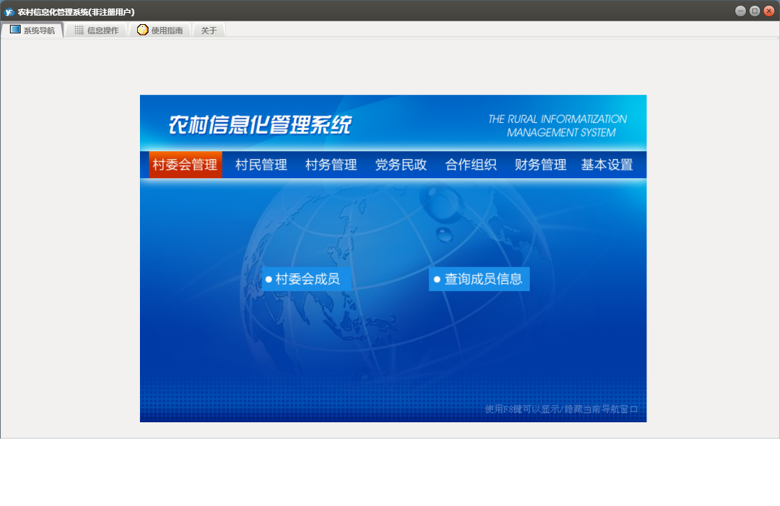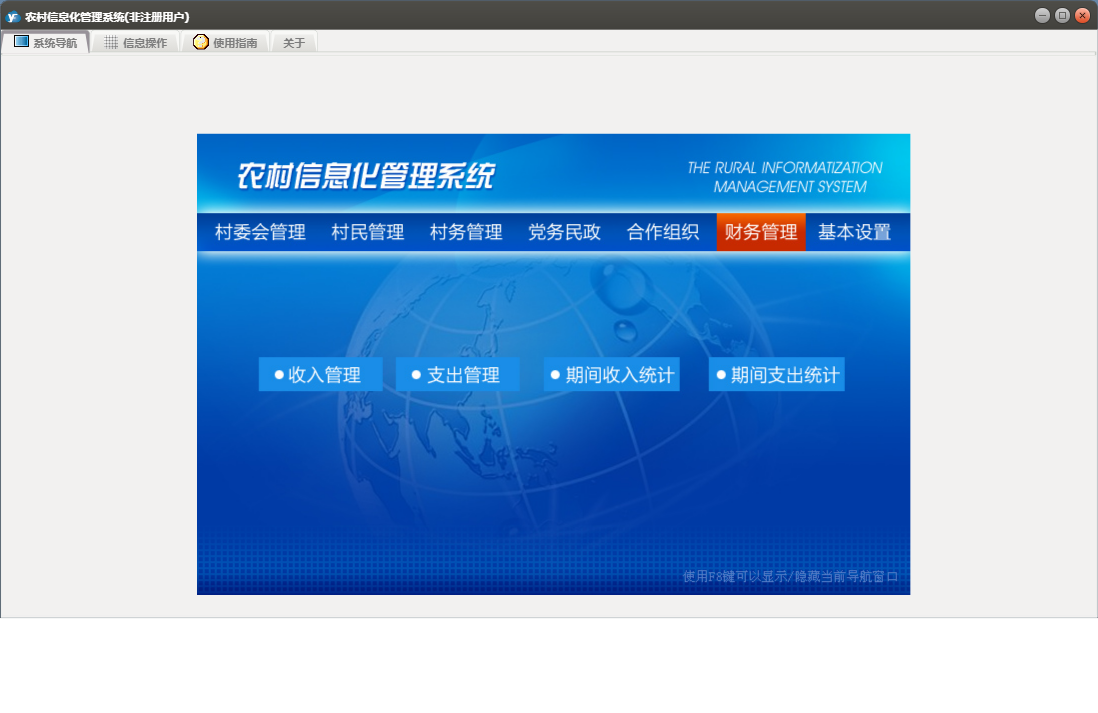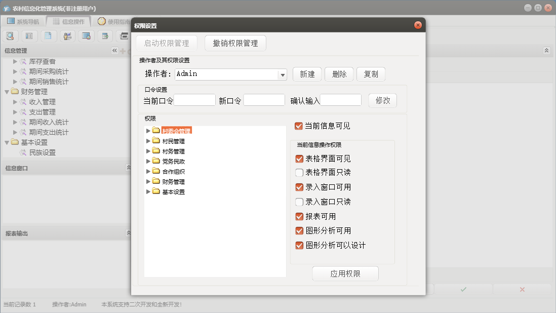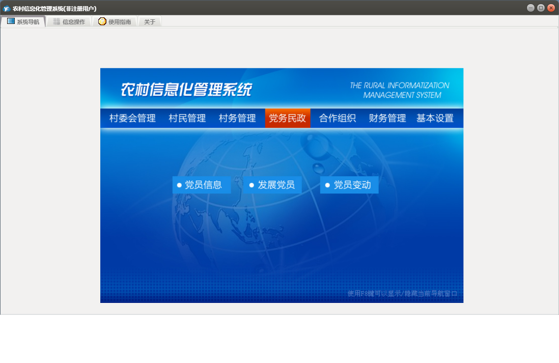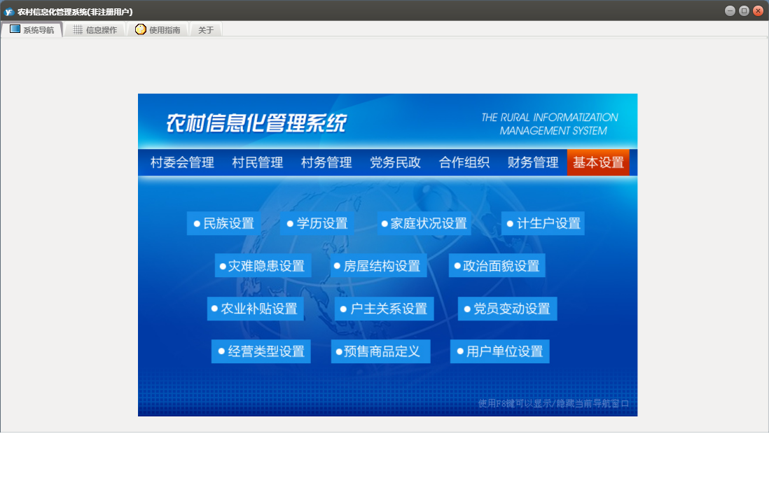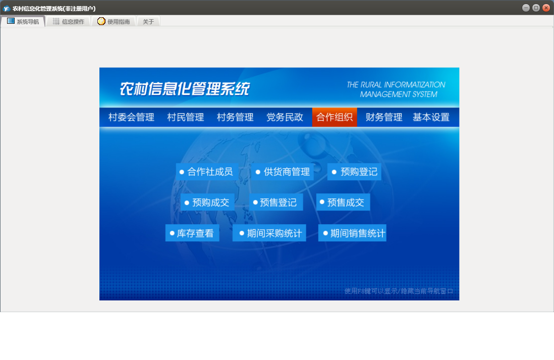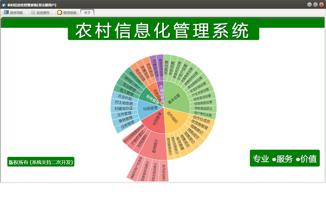 农村信息化管理系统包含以下功能:合作组织、基本设置、预售成交、供货商管理、村建设办证、支出管理、党员信息、收入管理、户耕作登记、财务管理、预售商品定义、村民管理、农业补贴、村土地变更、文件管理、党员变动、权限设置、任务管理、合作社成员、村委会成员、党务管理、村民资料、关于、村委会管理、村务管理、预售登记、预购登记、发展党员、日志、预购成交、事务管理等