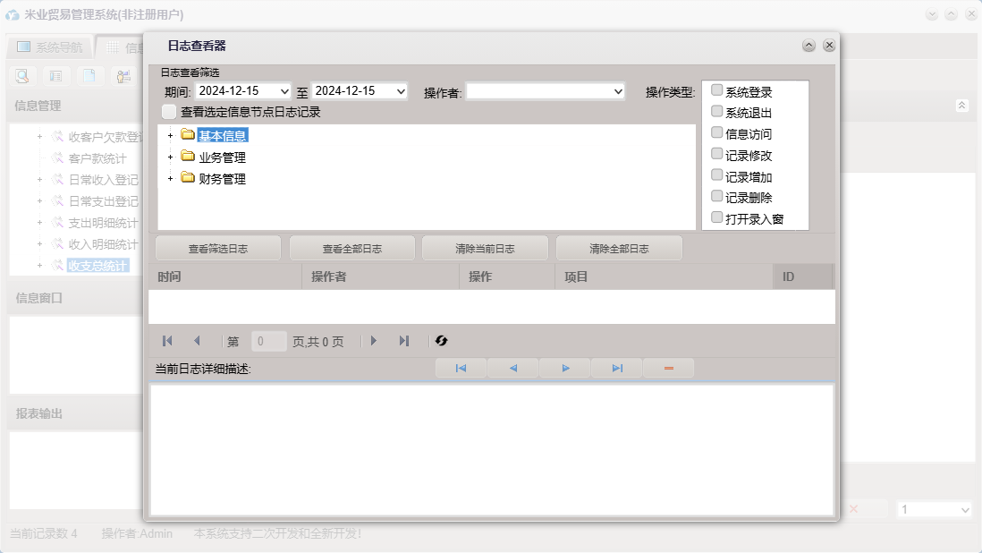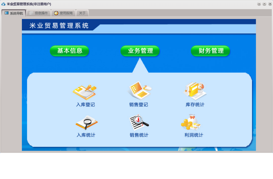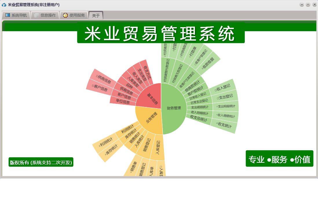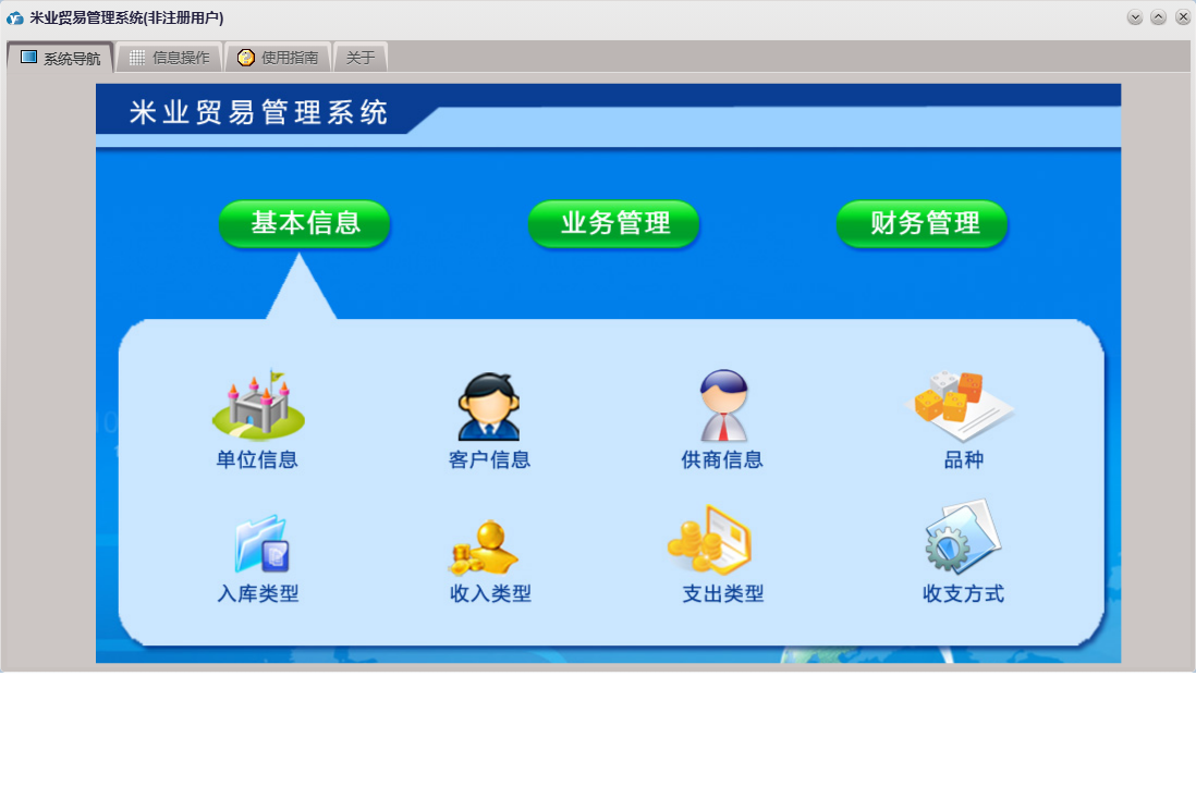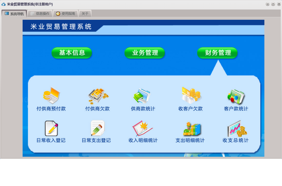 米业贸易管理系统包含以下功能:付供商欠款登记、财务管理、入库登记、供商信息、付供商预付款登记、日常收入登记、日志、关于、销售登记、基本信息、日常支出登记、权限设置、客户信息、收客户欠款登记、业务管理等
