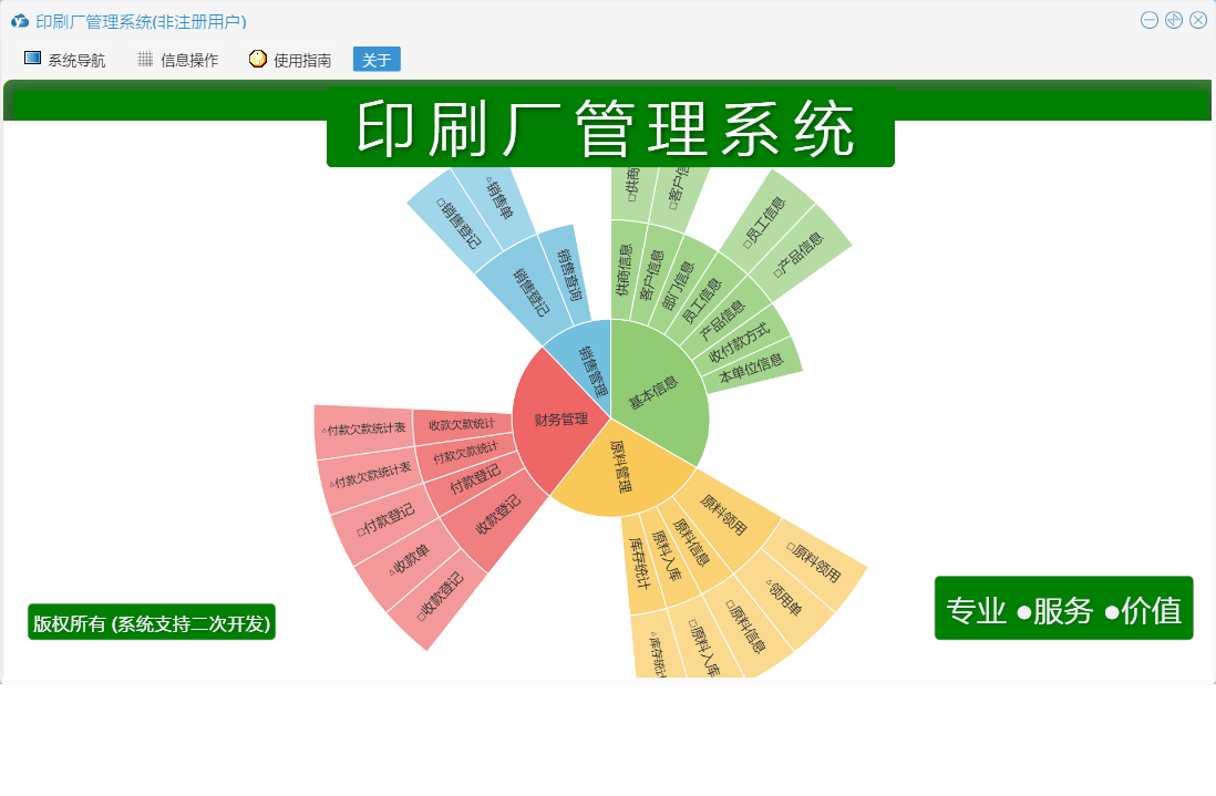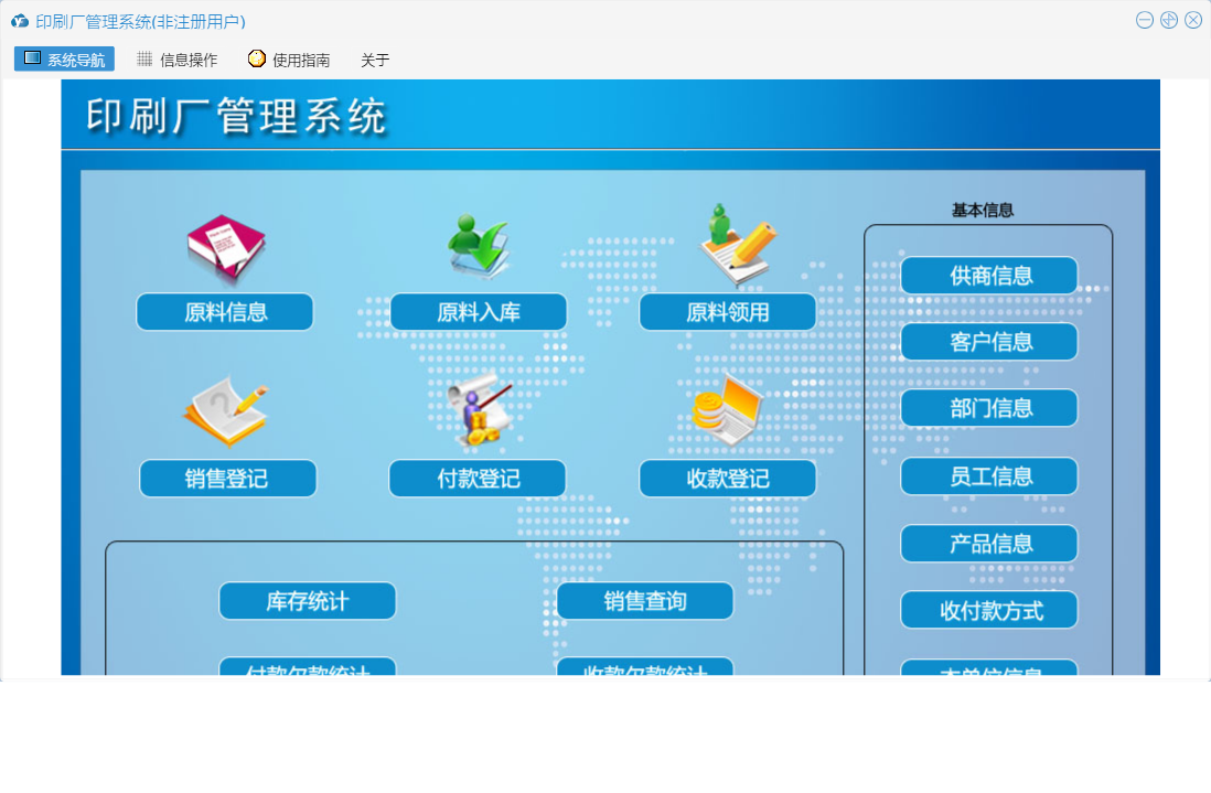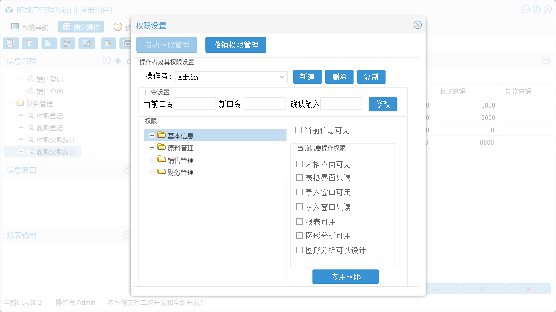印刷厂管理系统包含以下功能:原料领用、原料信息、面板、原料入库、员工信息、付款登记、日志、关于、产品信息、销售登记、权限设置、客户信息、收款登记、供商信息等