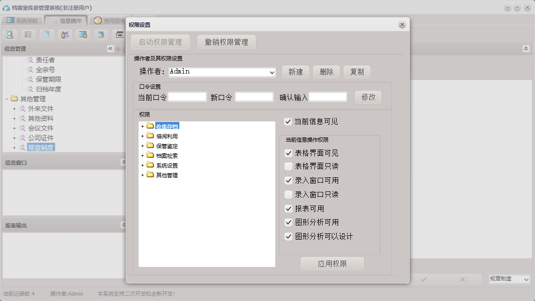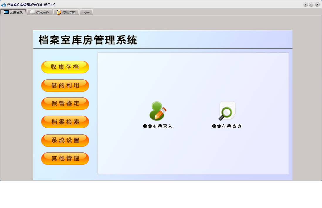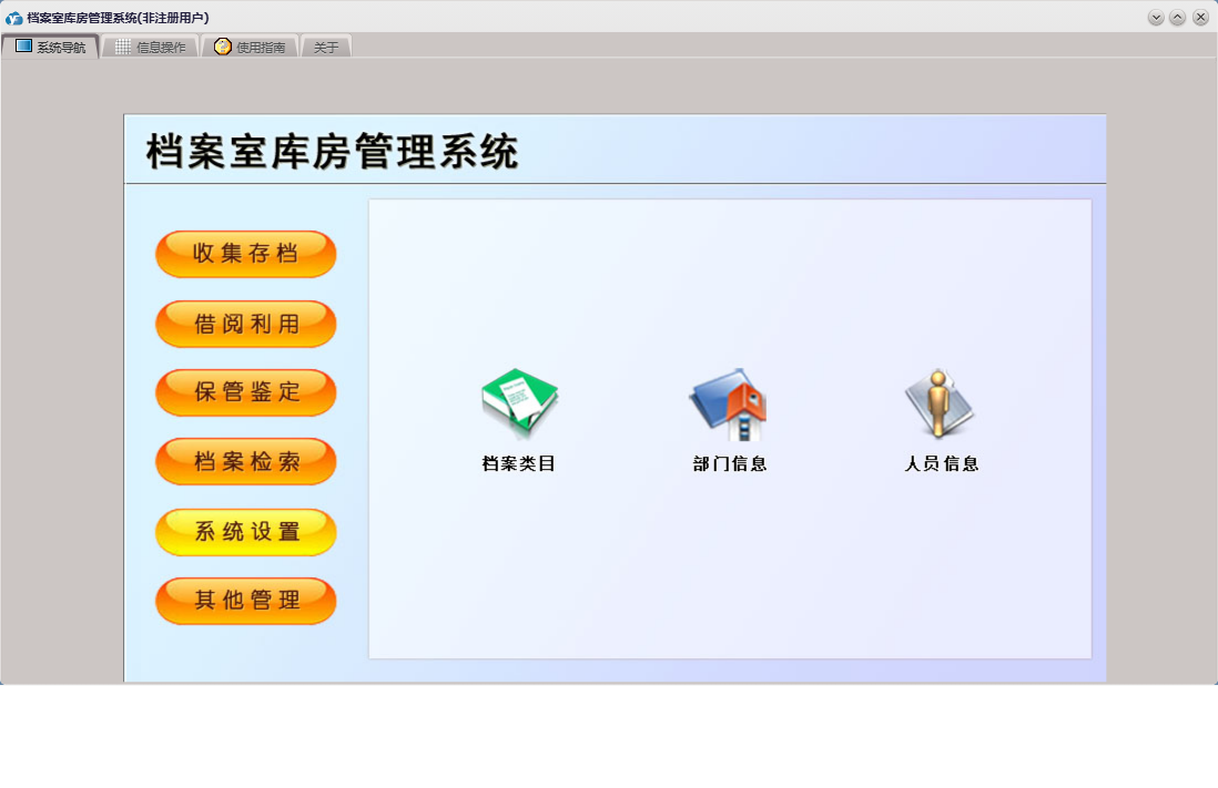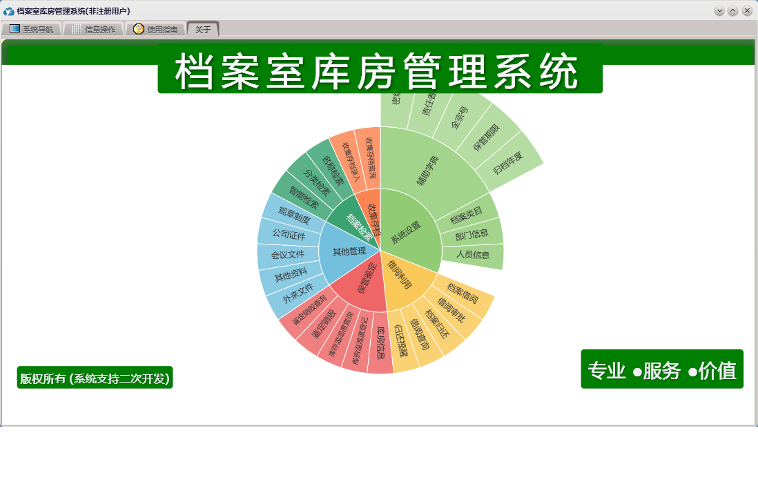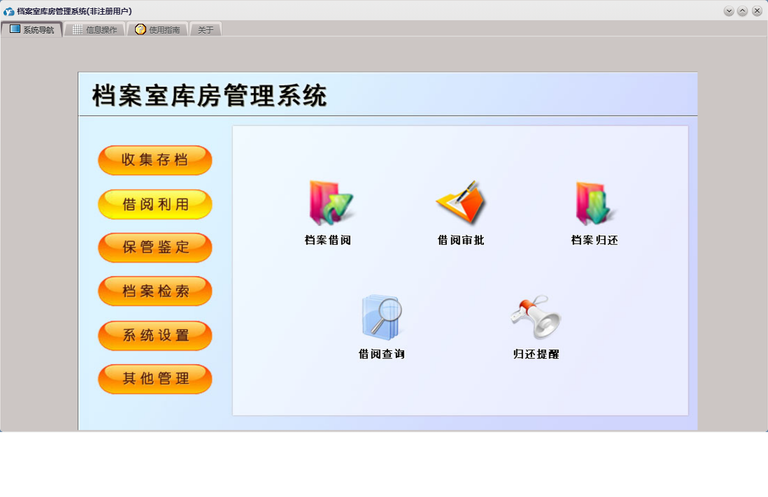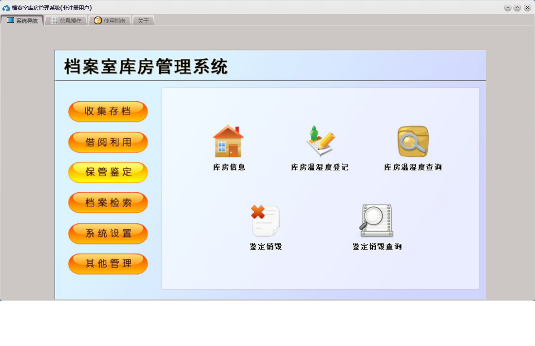 档案室库房管理系统包含以下功能:借阅审批、鉴定销毁、档案类目、库房信息、借阅利用、档案借阅、保管鉴定、外来文件、公司证件、权限设置、部门信息、收集存档录入、收集存档、会议文件、关于、库房温湿度登记、其他资料、其他管理、系统设置、规章制度、档案检索、日志、档案归还、人员信息等