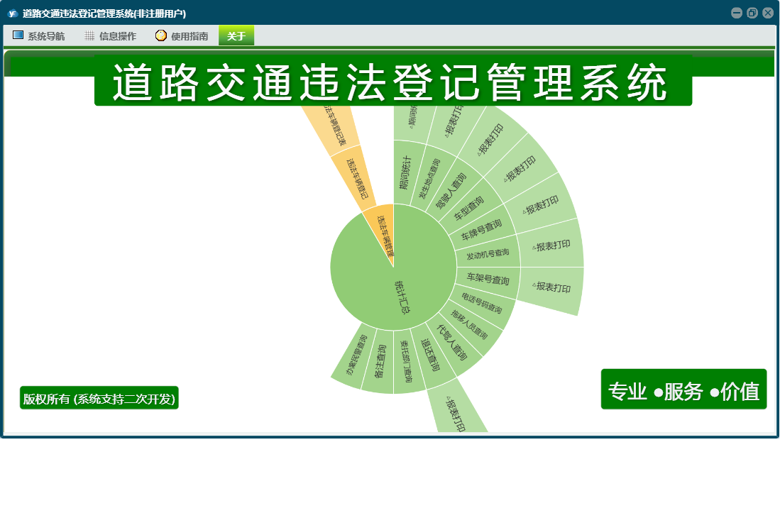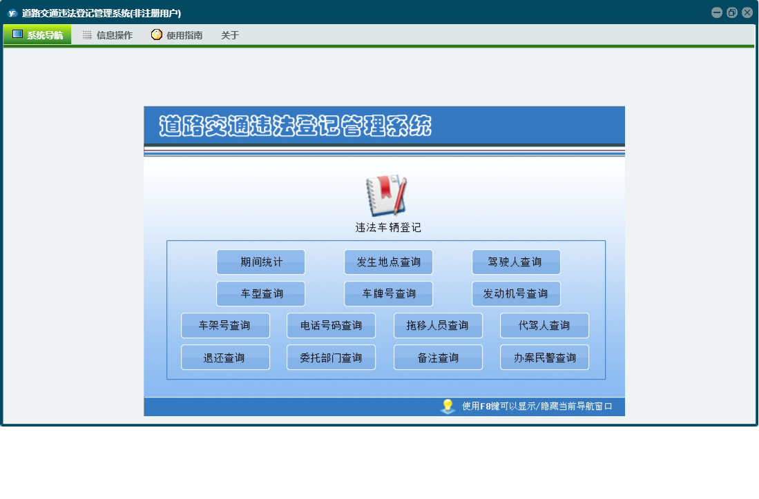 道路交通违法登记管理系统包含以下功能:日志、关于、权限设置、违法登记、违法车辆登记等