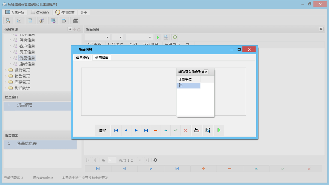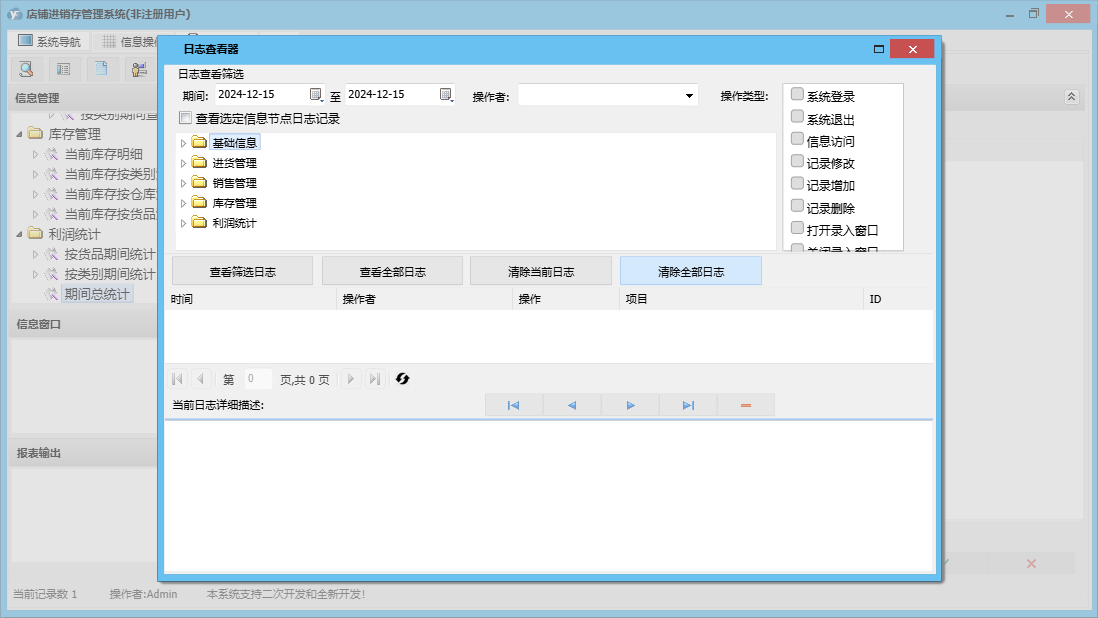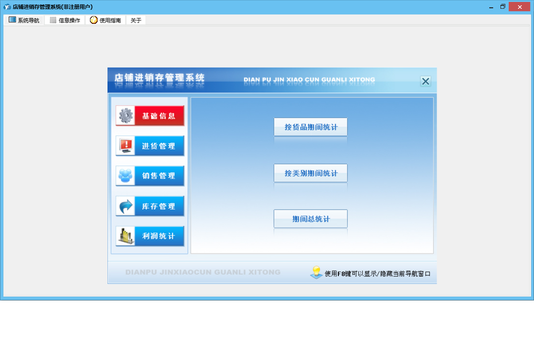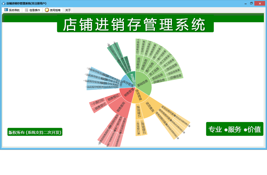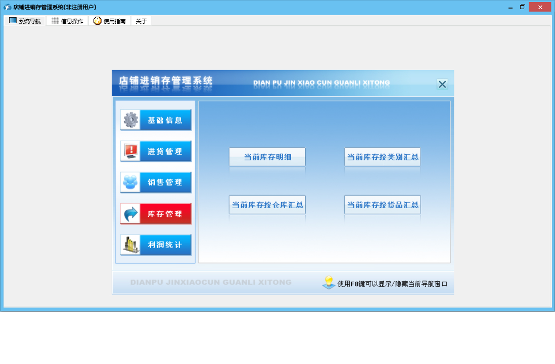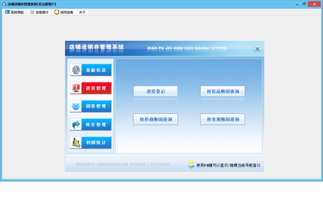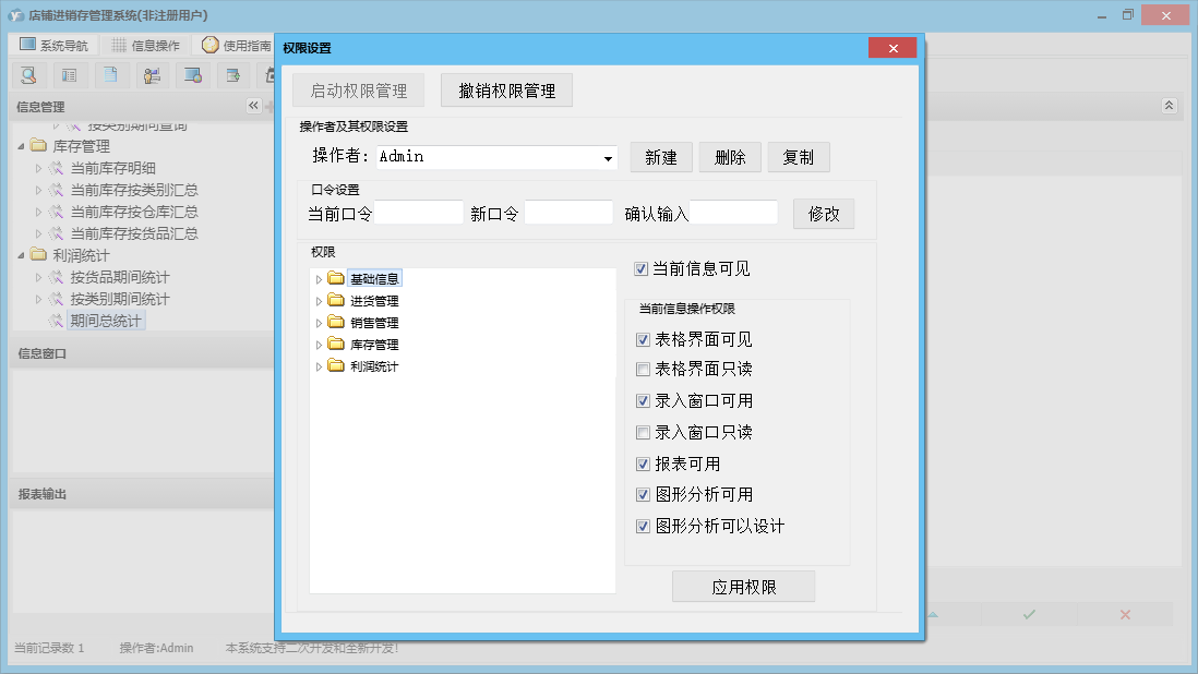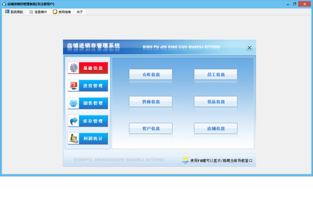 店铺进销存管理系统包含以下功能:基础信息、销售管理、货品信息、进货管理、利润统计、员工信息、日志、库存管理、关于、进货登记、销售登记、权限设置、店铺信息、客户信息、仓库信息、供商信息等