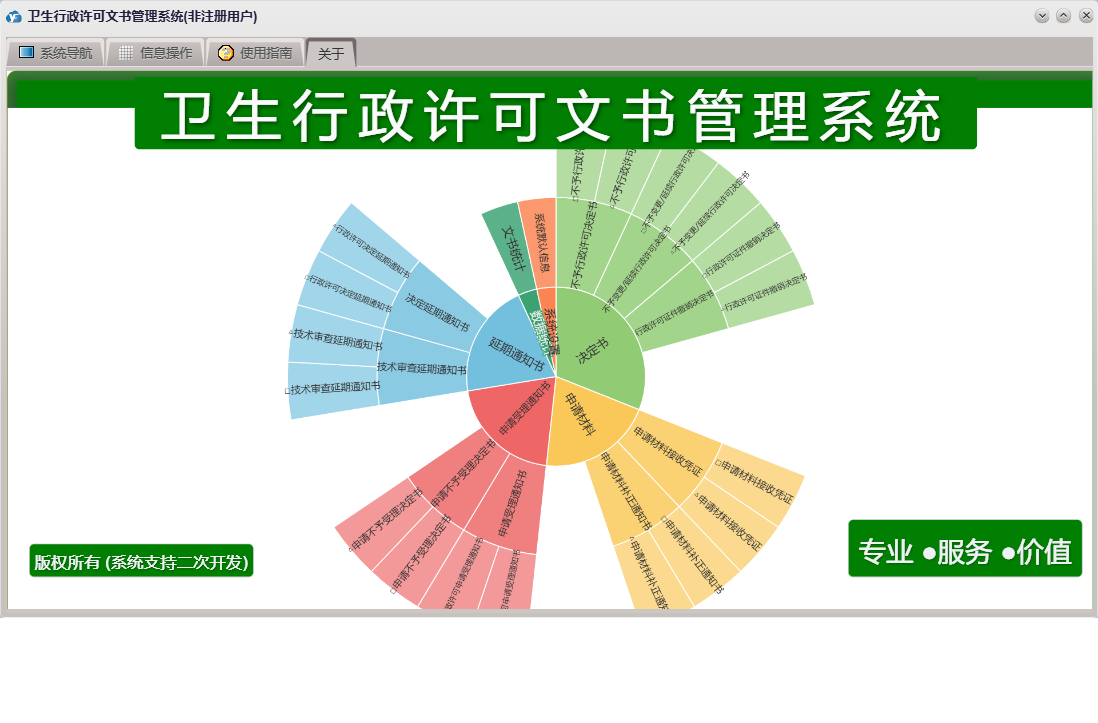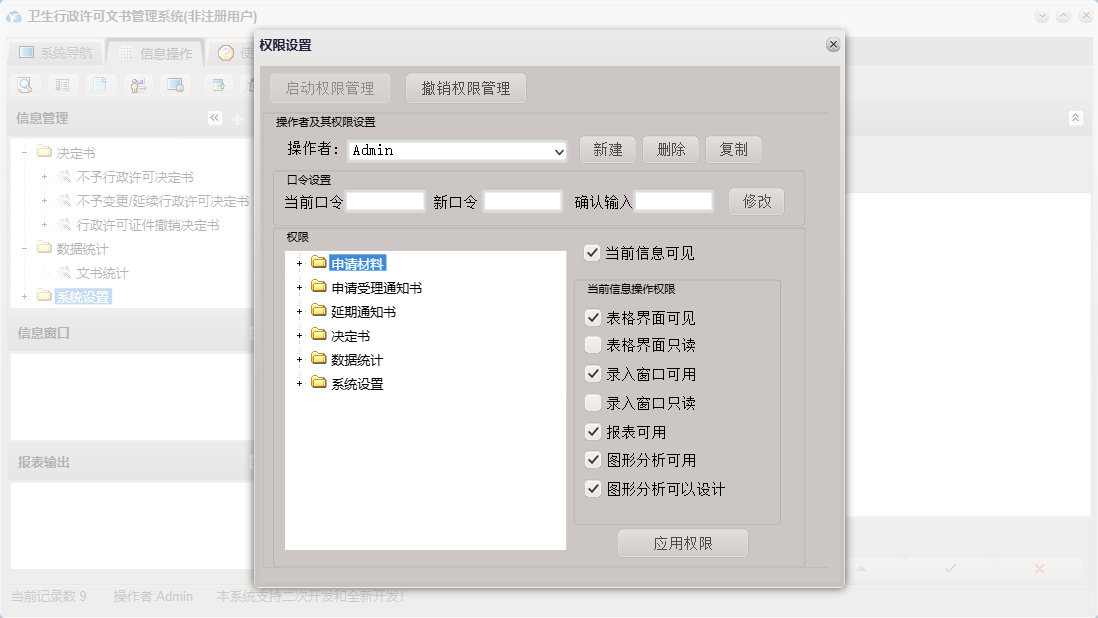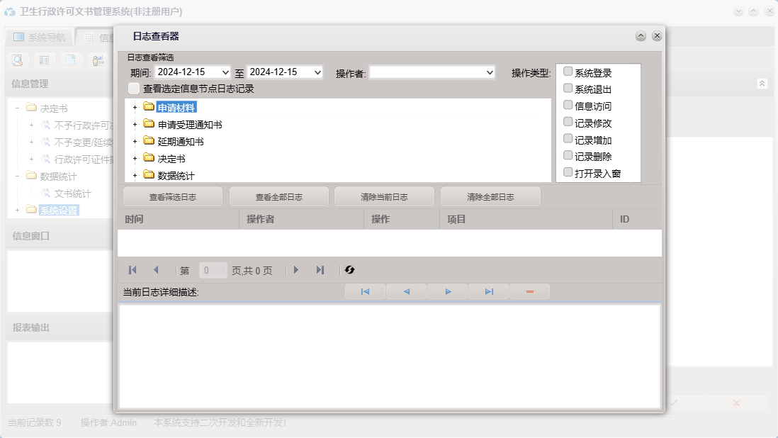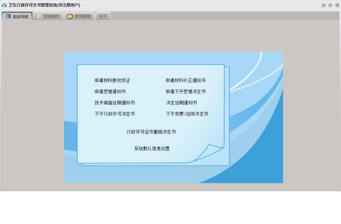卫生行政许可文书管理系统包含以下功能:行政许可证件撤销决定书、技术审查延期通知书、决定延期通知书、申请材料接收凭证、日志、不予变更、关于、权限设置、申请材料补正通知书、申请受理通知书、不予行政许可决定书、行政许可、申请不予受理决定书等