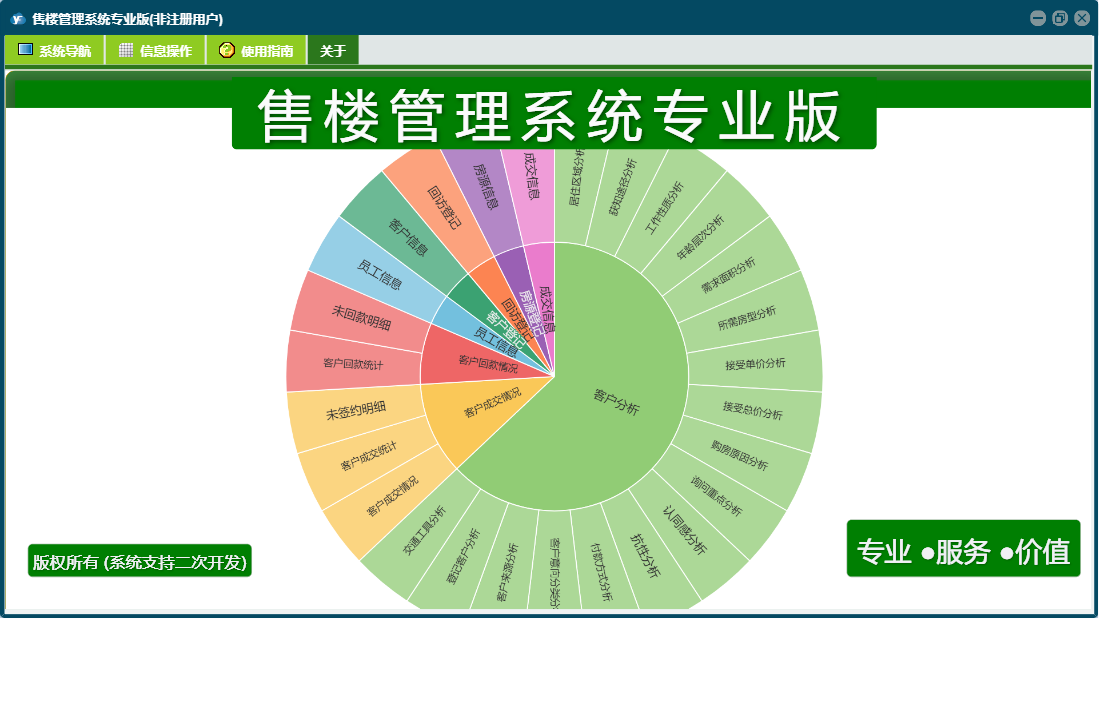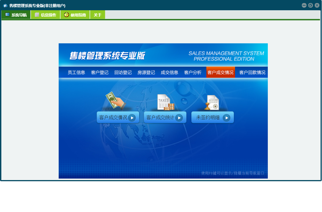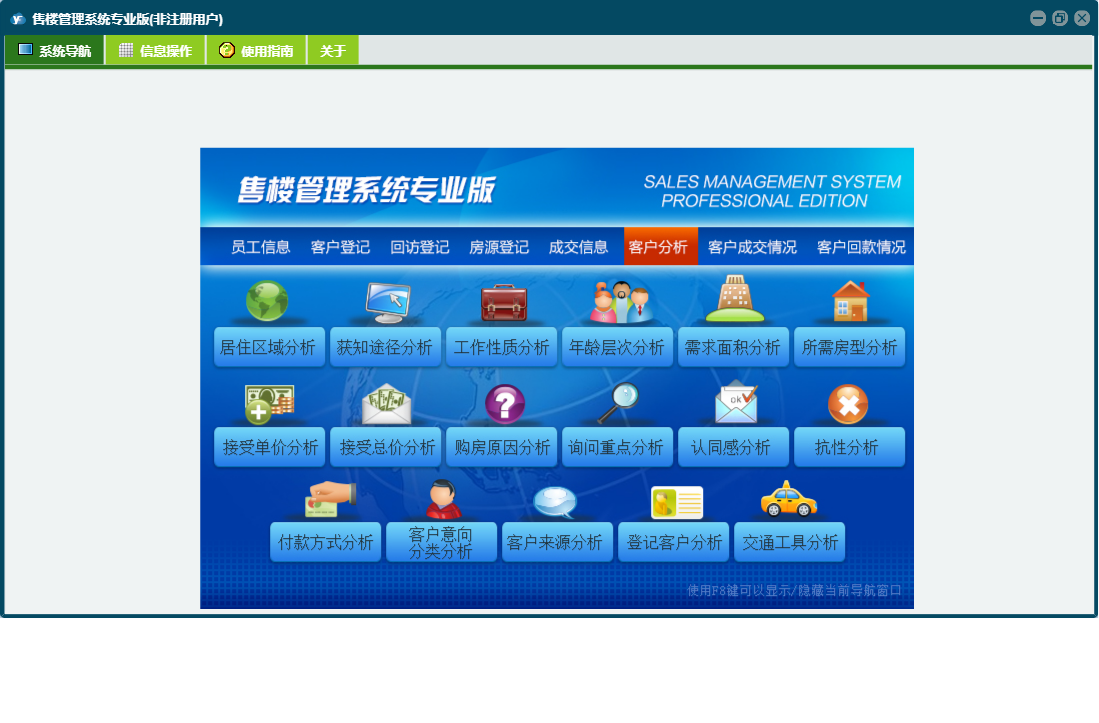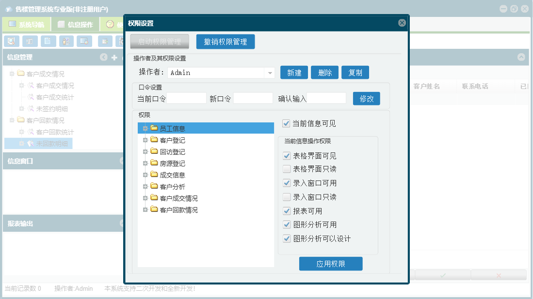 售楼管理系统专业版包含以下功能:成交信息、客户成交情况、员工信息、房源信息、房源登记、日志、关于、权限设置、客户分析、客户信息、客户登记、回访登记、客户回款情况等