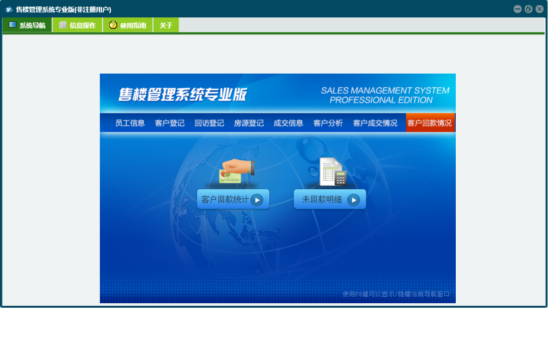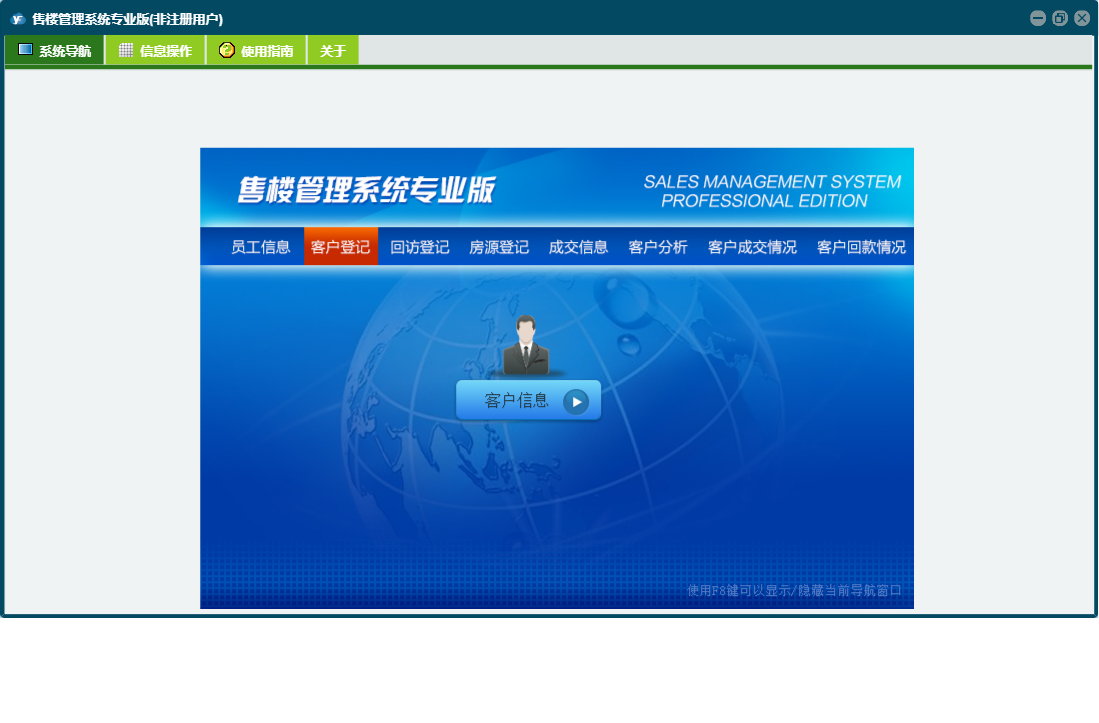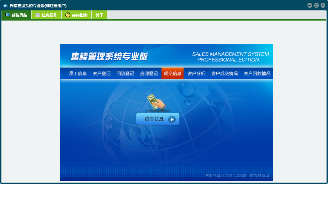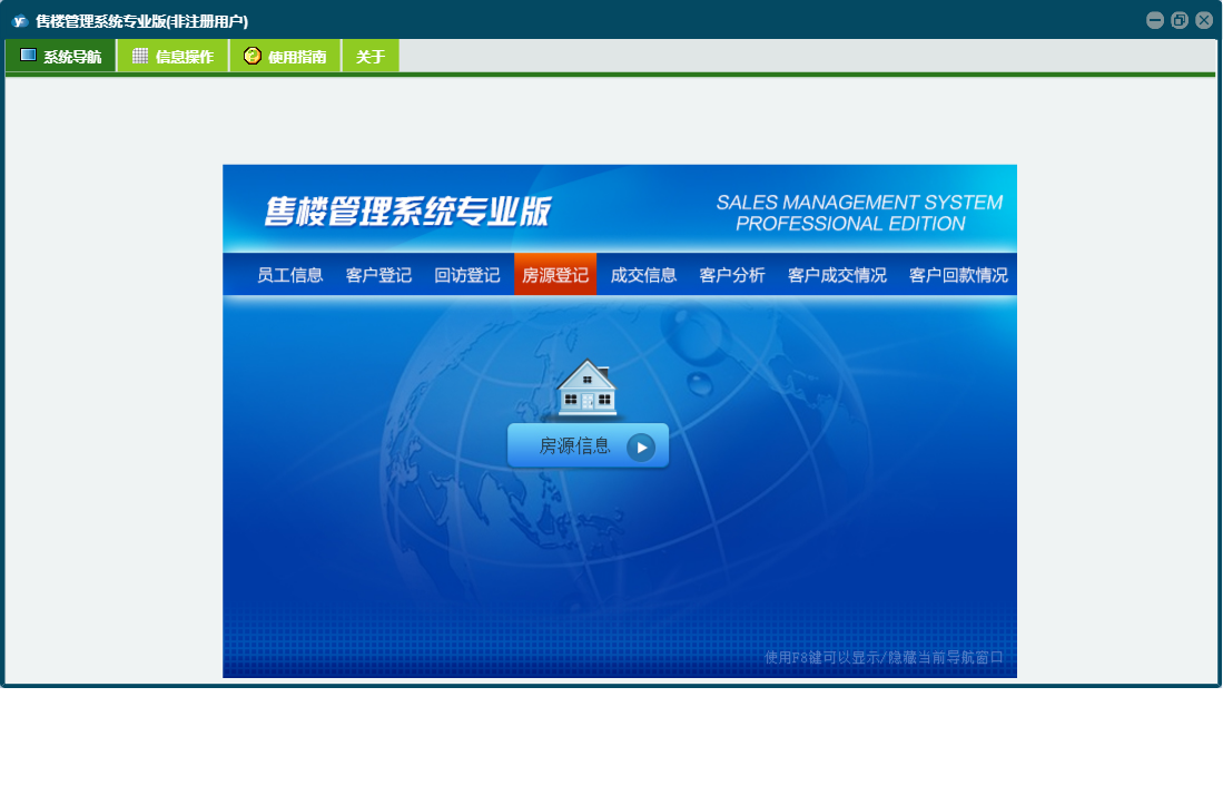 售楼管理系统专业版包含以下功能:成交信息、客户成交情况、员工信息、房源信息、房源登记、日志、关于、权限设置、客户分析、客户信息、客户登记、回访登记、客户回款情况等