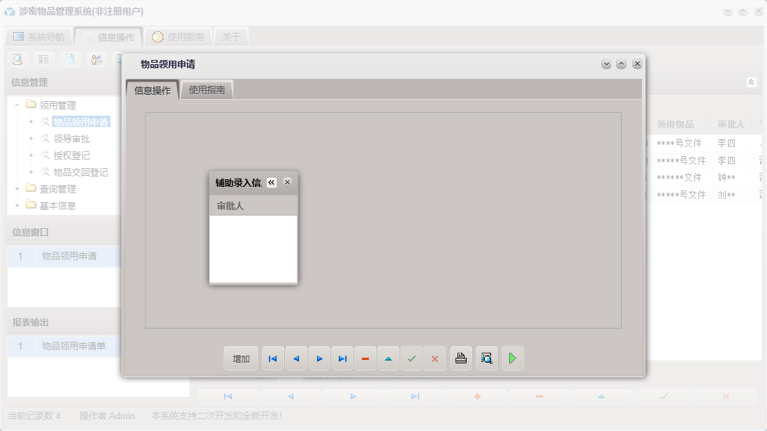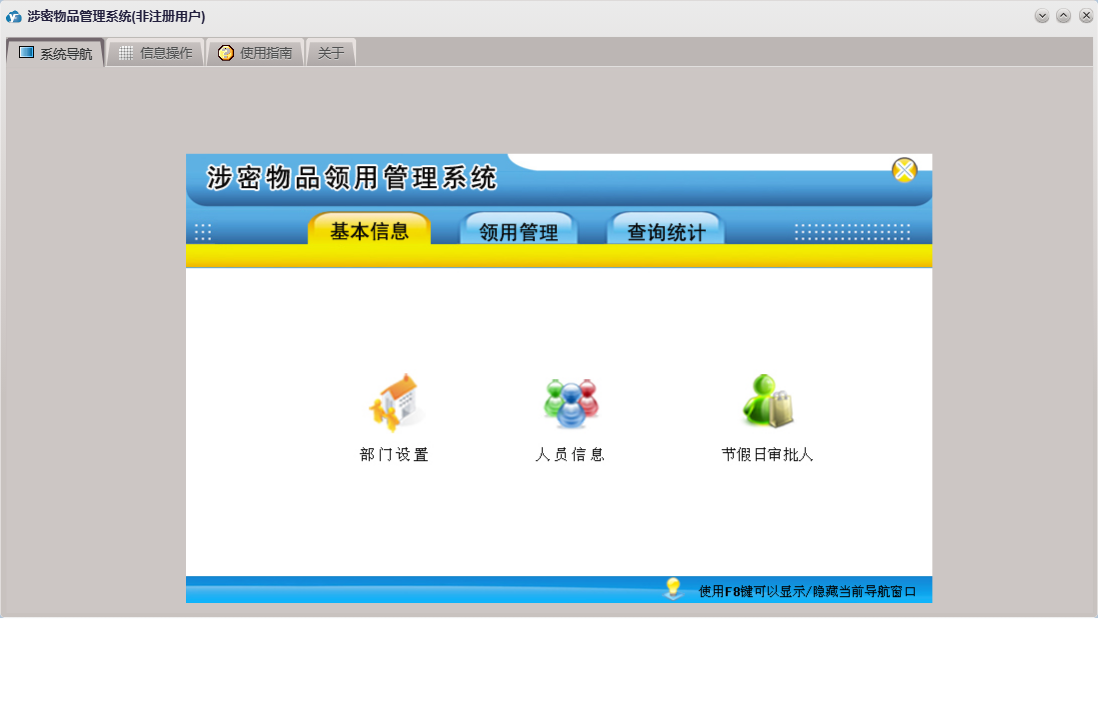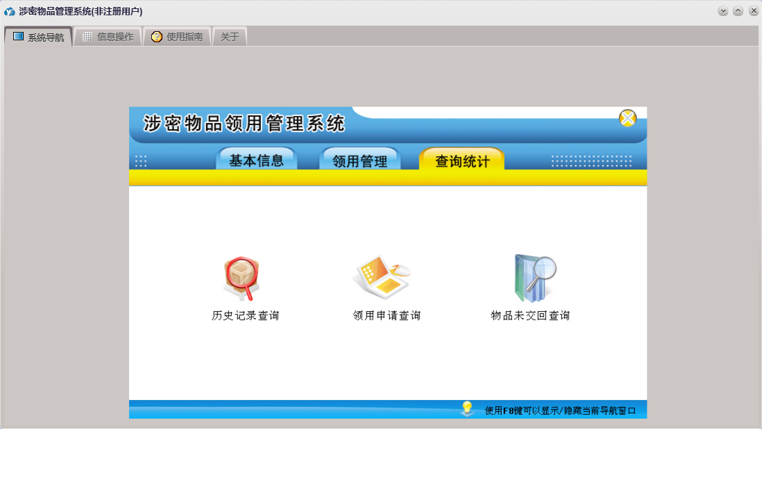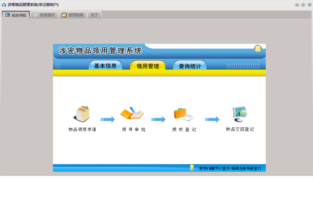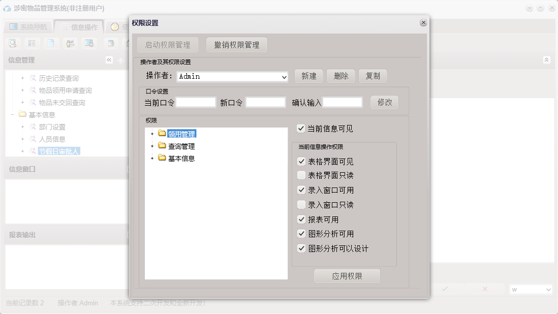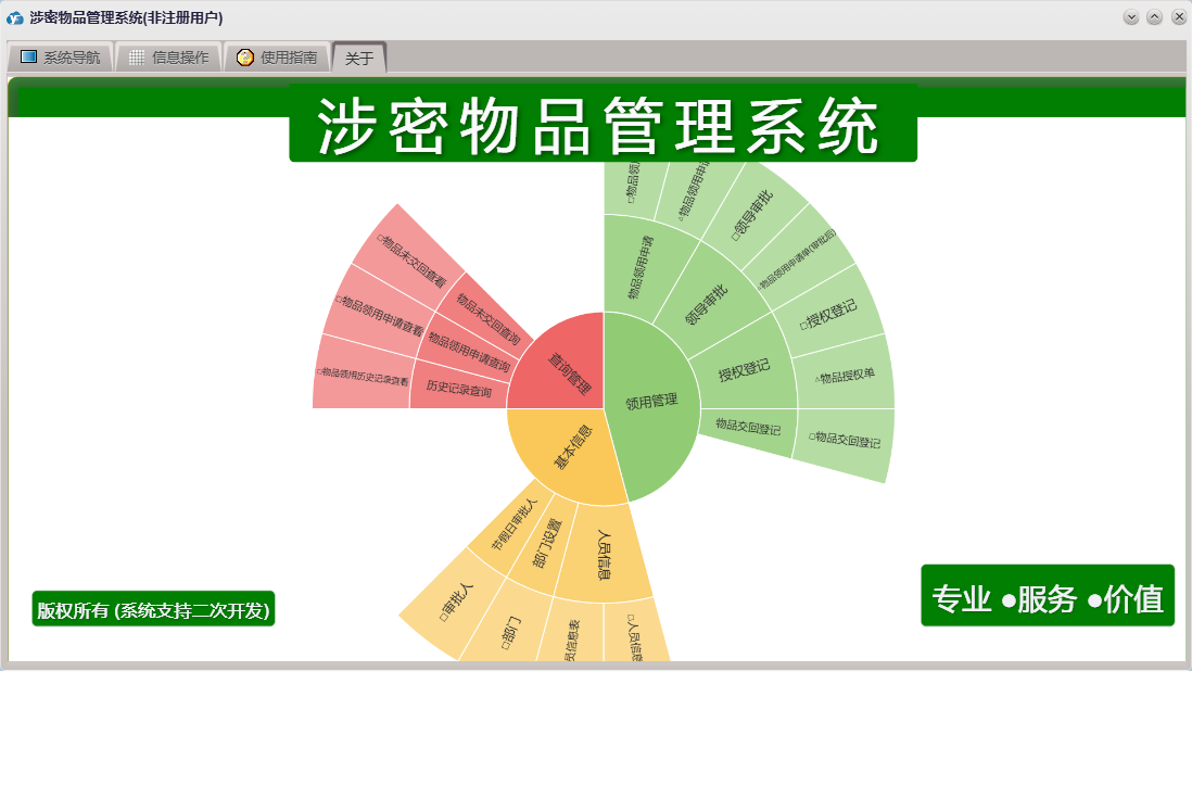 涉密物品管理系统包含以下功能:物品未交回查询、部门设置、历史记录查询、领用管理、领导审批、授权登记、物品交回登记、日志、关于、权限设置、节假日审批人、基本信息、物品领用申请、人员信息、查询管理、物品领用申请查询等