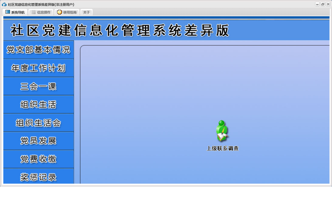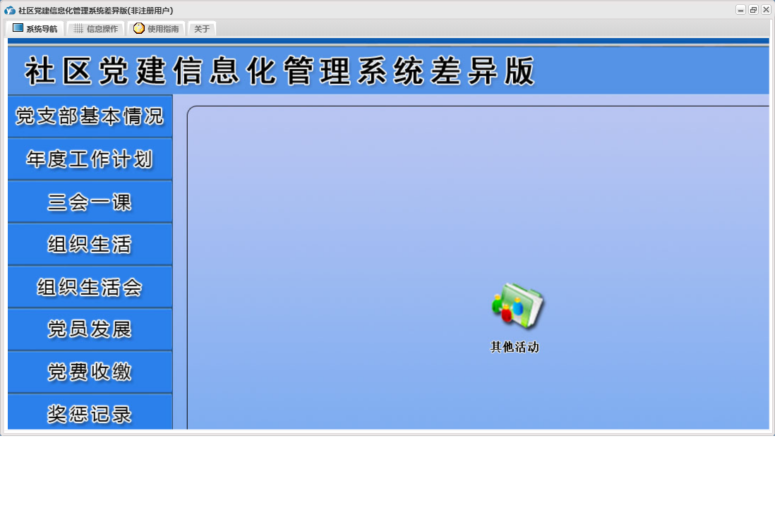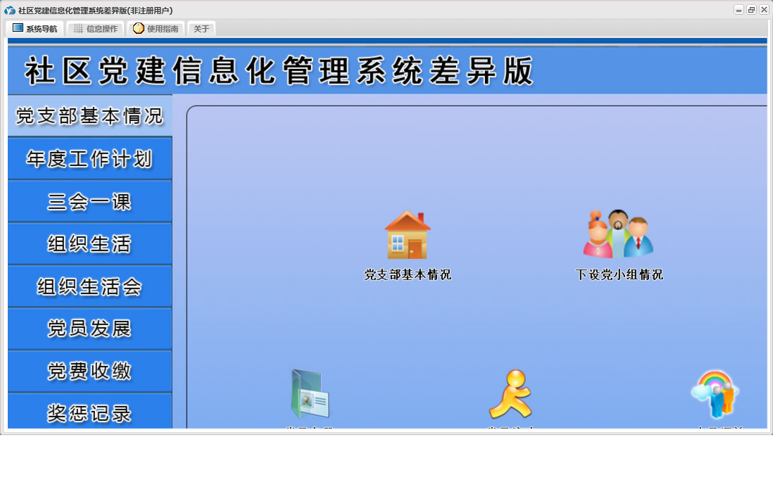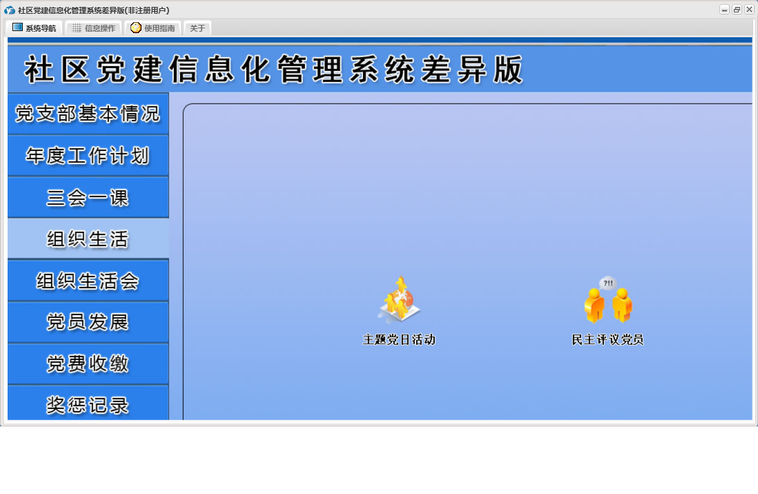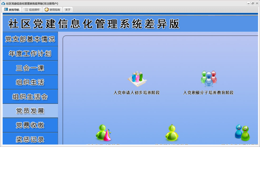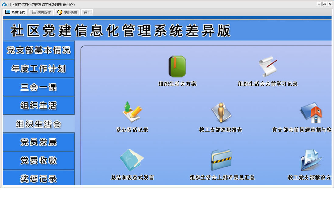 社区党建信息化管理系统差异版包含以下功能:党员流动、教工党支部整改方案、其他材料、入党申请人初步培养阶段、年度考核结果、下设党小组情况、党小组会、人员汇总、推荐优秀名单、教工支部述职报告、组织生活会上批评意见汇总、民主评议党员、教工支部组织生活会总结报告、接收预备党员阶段、党课、预备党员考察转正阶段、党员发展、其他活动、党费收缴、组织生活会方案、权限设置、谈心谈话记录、组织生活会、上级联系调查、组织生活、支部党员大会、党员名册、总结和表态式发言、年度考核总结、三会一课、党支部基本情况、关于、入党积极分子培养教育阶段、年度工作计划、奖惩记录、组织生活会会前学习记录、个人整改承诺书、检索统计、党支部会前问题查摆与检视剖析、日志、支部委员会、主题党日活动、确定发展对象阶段等