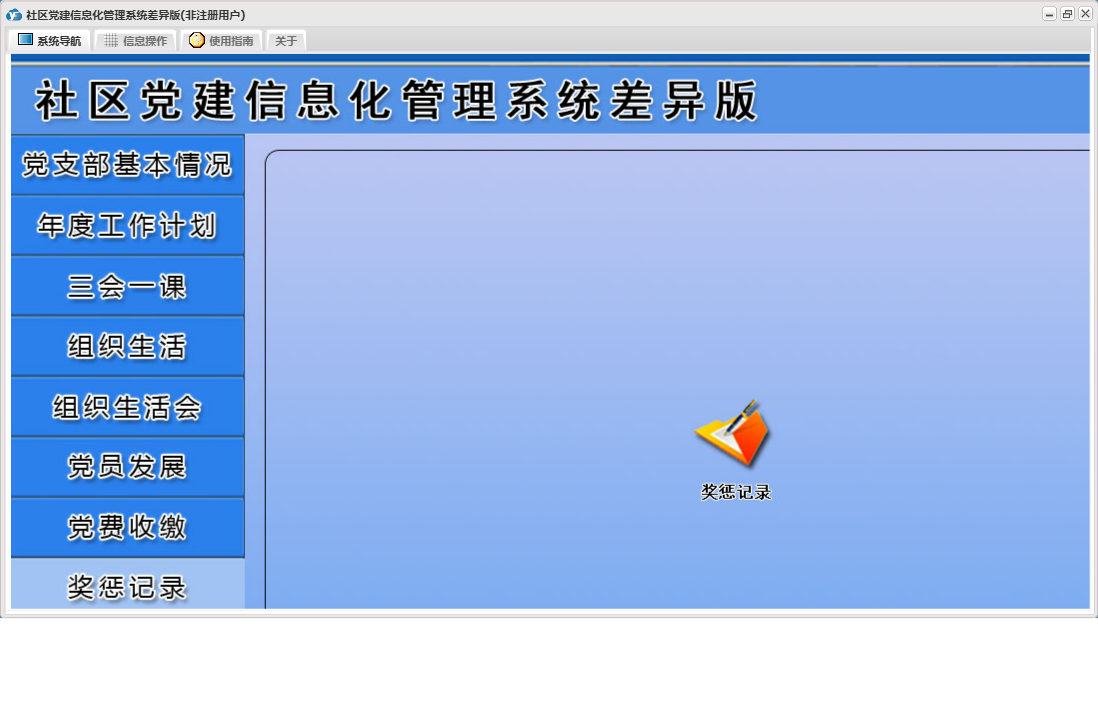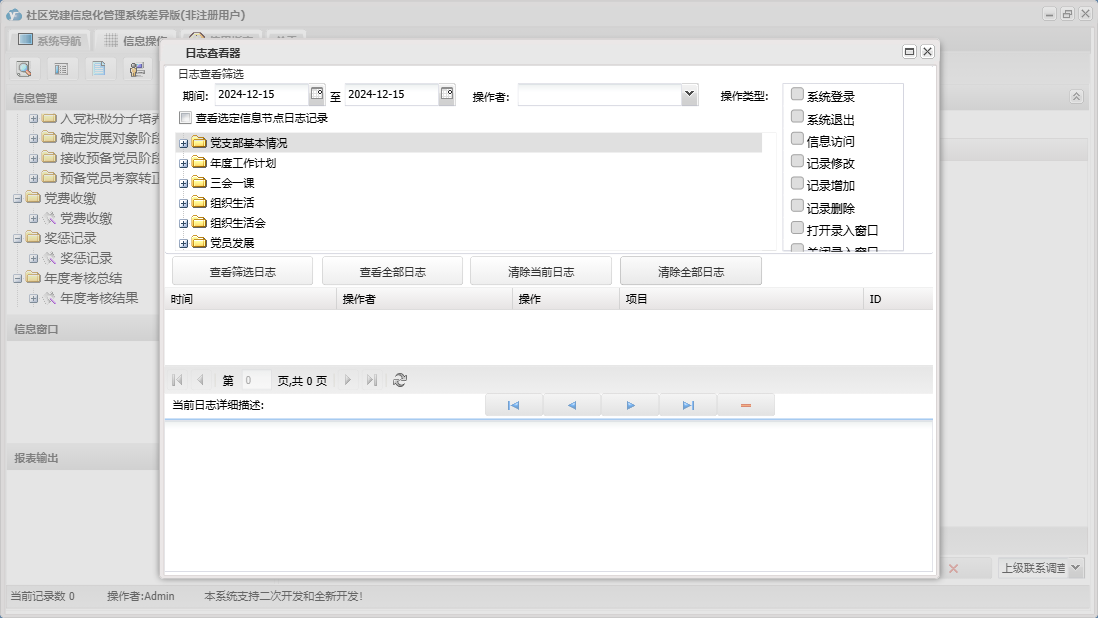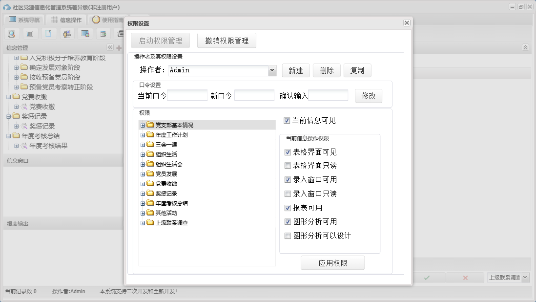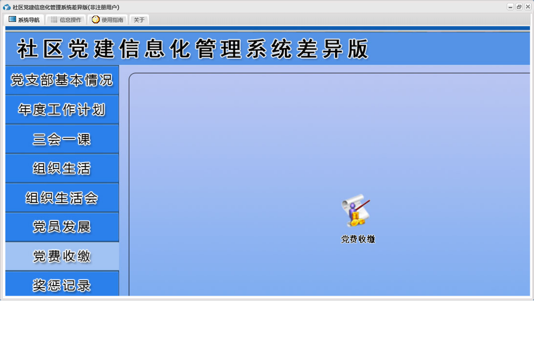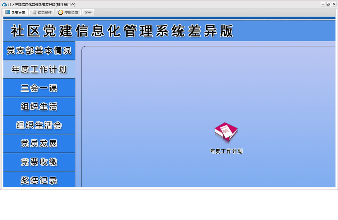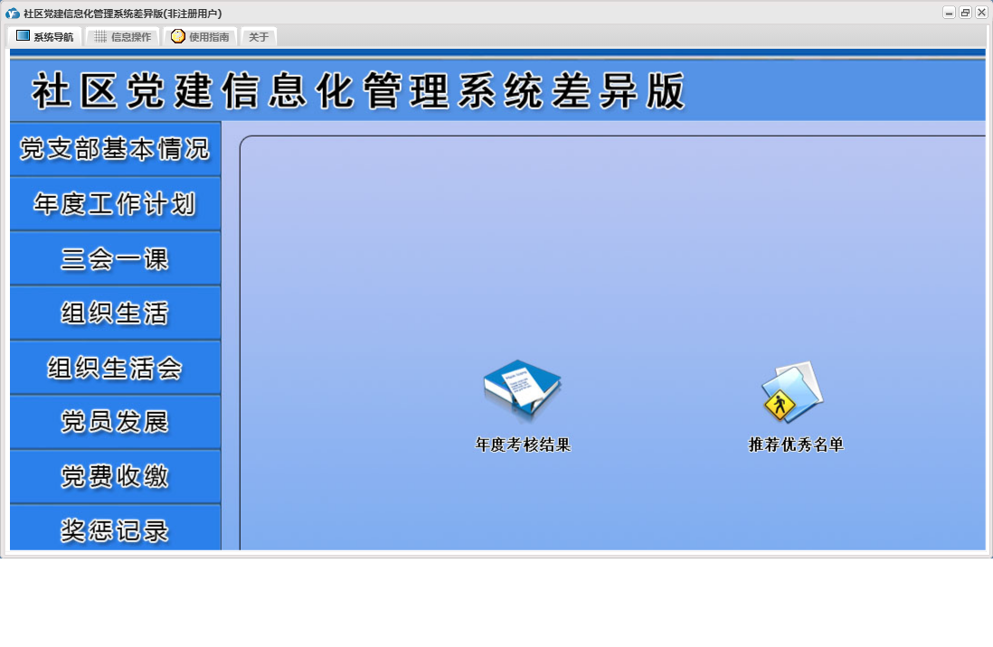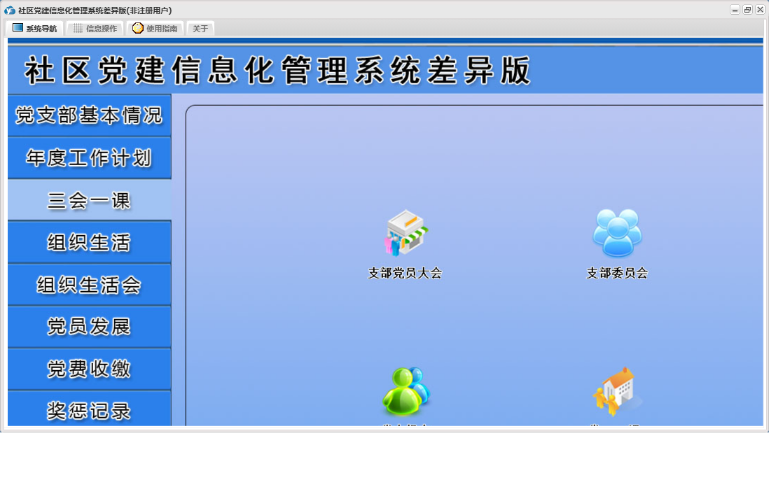 社区党建信息化管理系统差异版包含以下功能:党员流动、教工党支部整改方案、其他材料、入党申请人初步培养阶段、年度考核结果、下设党小组情况、党小组会、人员汇总、推荐优秀名单、教工支部述职报告、组织生活会上批评意见汇总、民主评议党员、教工支部组织生活会总结报告、接收预备党员阶段、党课、预备党员考察转正阶段、党员发展、其他活动、党费收缴、组织生活会方案、权限设置、谈心谈话记录、组织生活会、上级联系调查、组织生活、支部党员大会、党员名册、总结和表态式发言、年度考核总结、三会一课、党支部基本情况、关于、入党积极分子培养教育阶段、年度工作计划、奖惩记录、组织生活会会前学习记录、个人整改承诺书、检索统计、党支部会前问题查摆与检视剖析、日志、支部委员会、主题党日活动、确定发展对象阶段等
