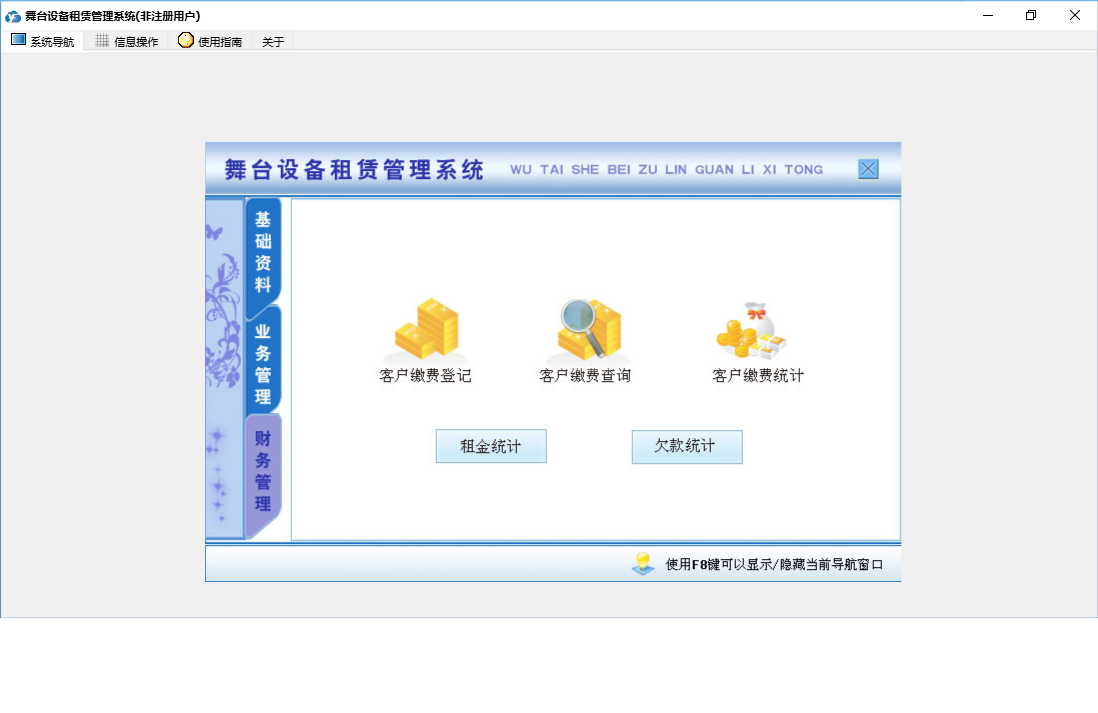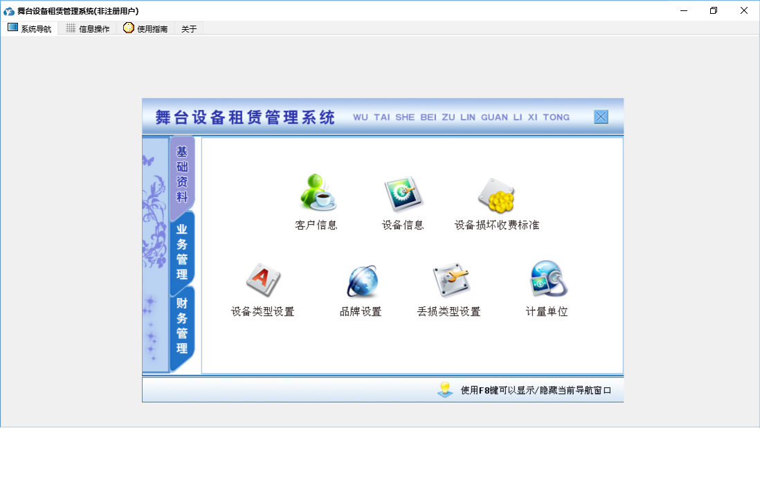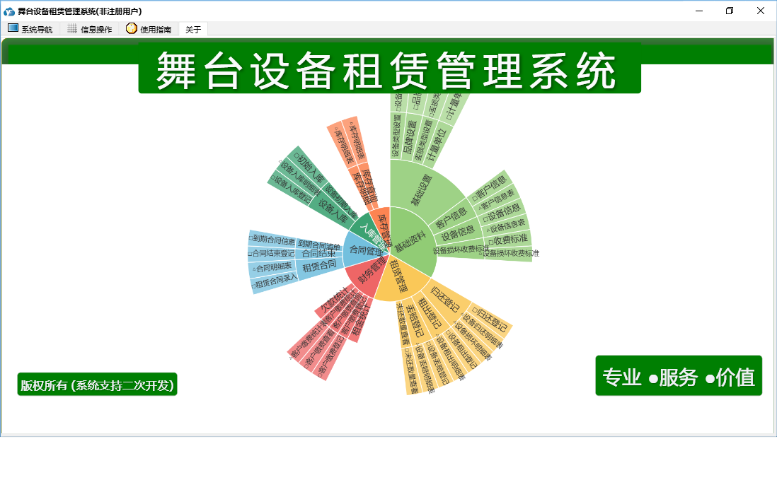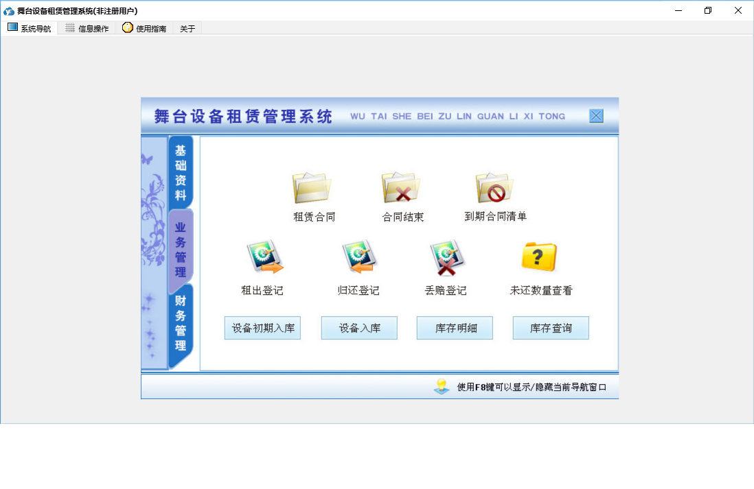 舞台设备租赁管理系统包含以下功能:设备损坏收费标准、1、2、归还登记、合同结束、租出登记、丢赔登记、未还数量查看、丢损类型设置、设备类型设置、3、设备入库、客户缴费登记、设备信息、关于、客户信息、到期合同清单、品牌设置、设备初期入库、客户缴费查询、租赁合同、计量单位等