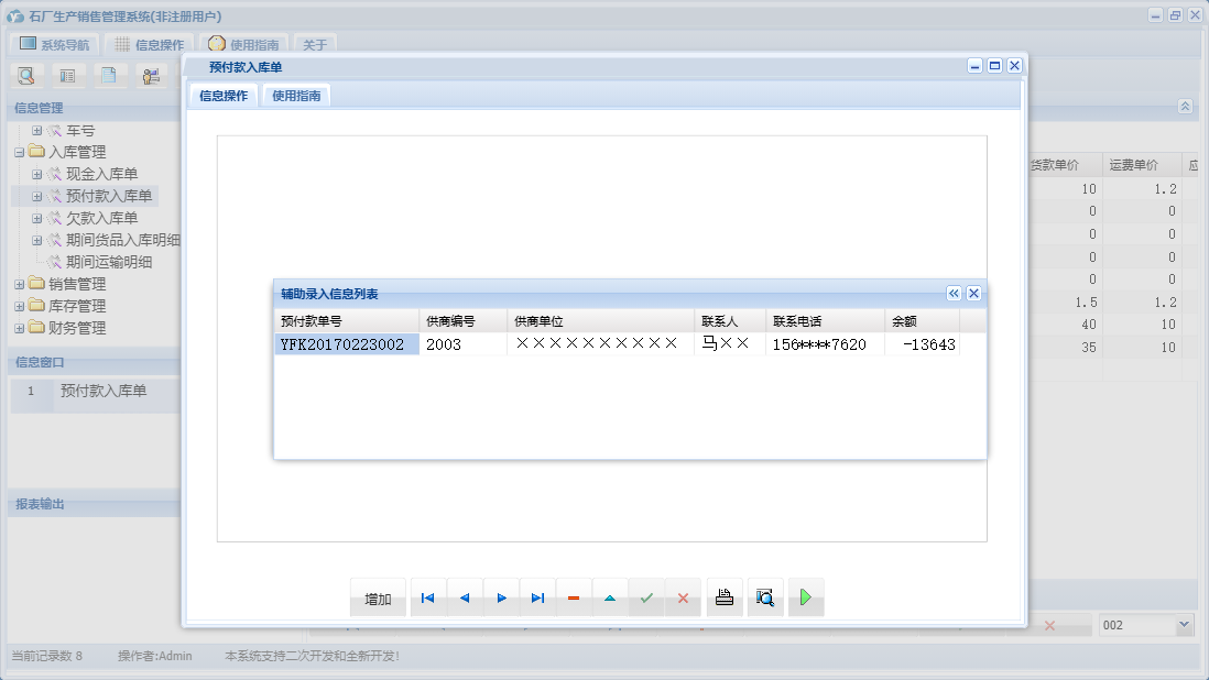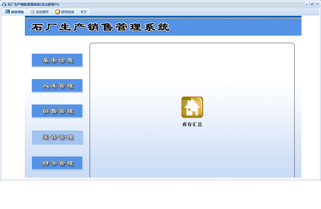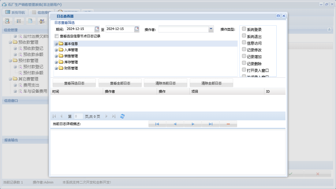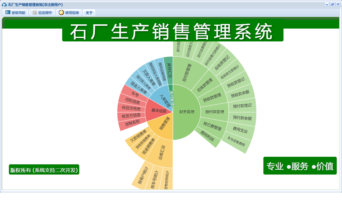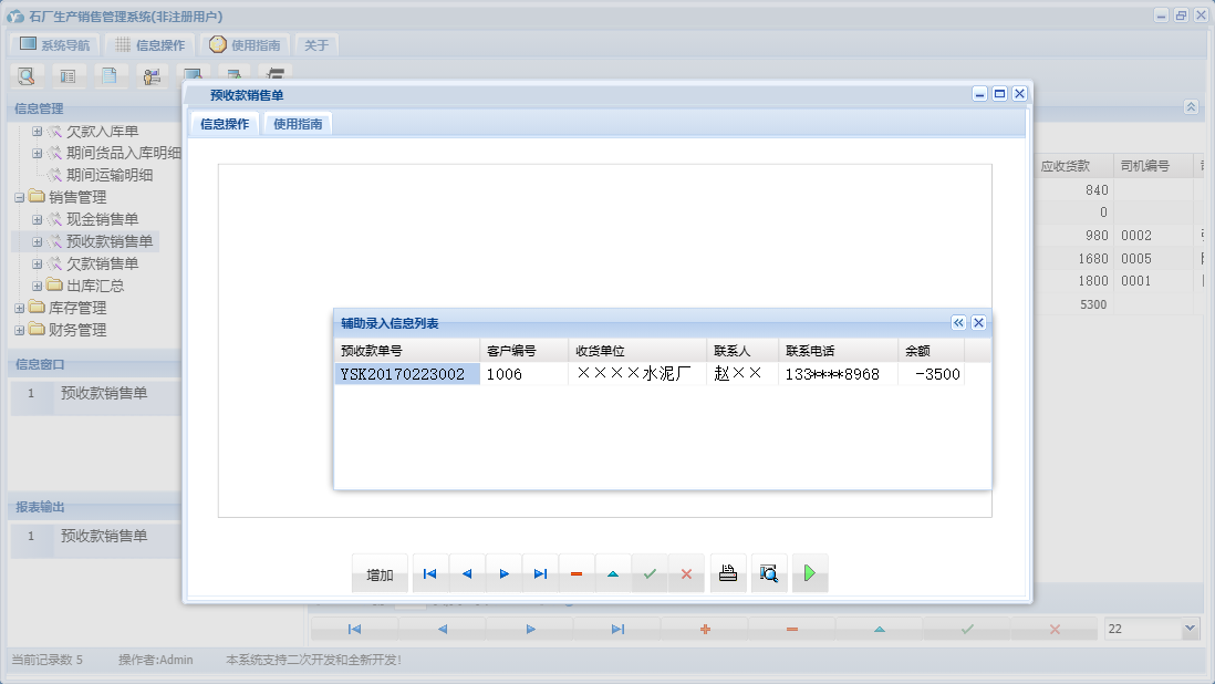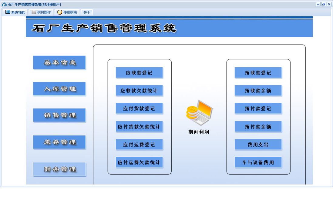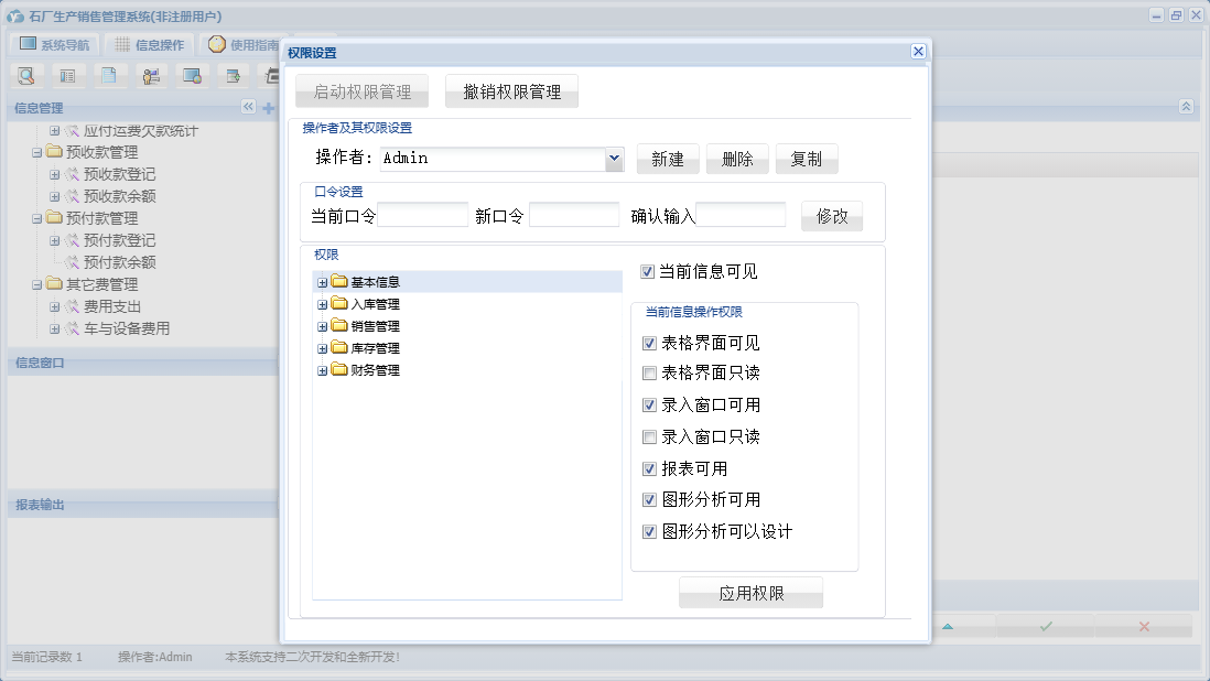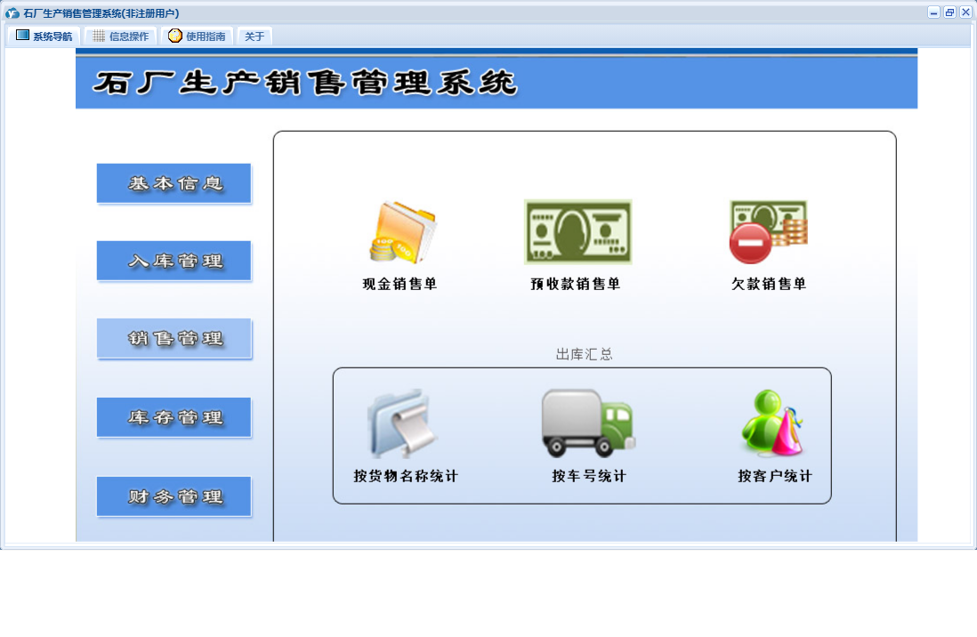 石厂生产销售管理系统包含以下功能:入库管理、销售管理、现金销售单、欠款销售单、日志、库存管理、关于、基本信息、权限设置、现金入库单、财务管理、预收款销售单、欠款入库单、预付款入库单等