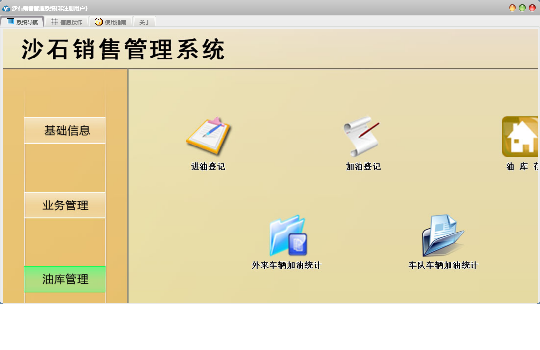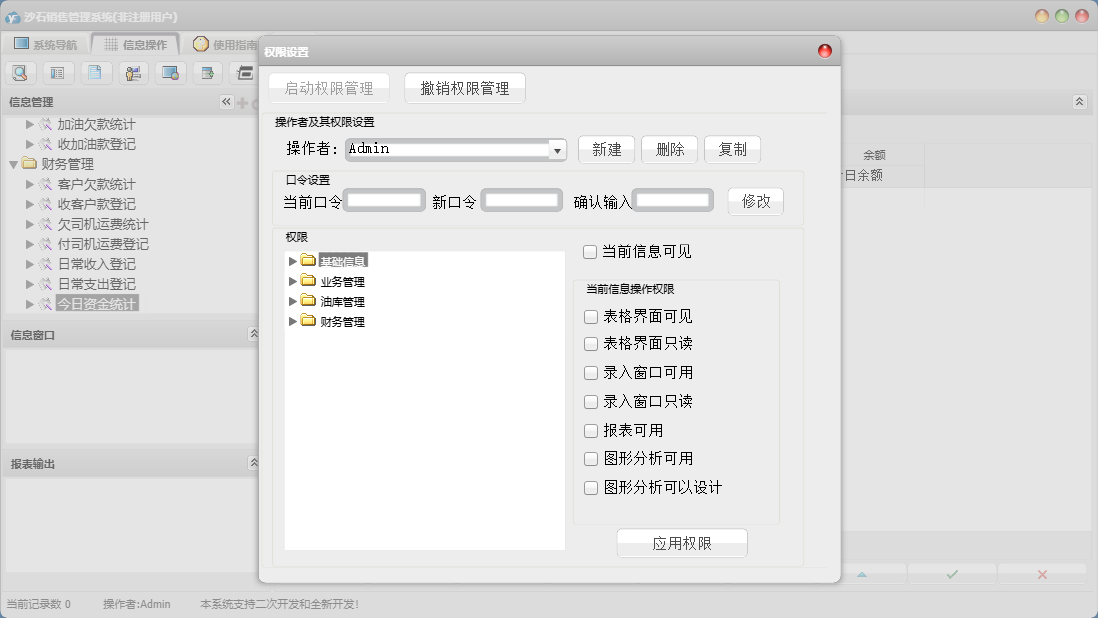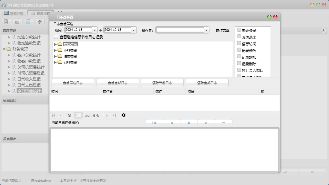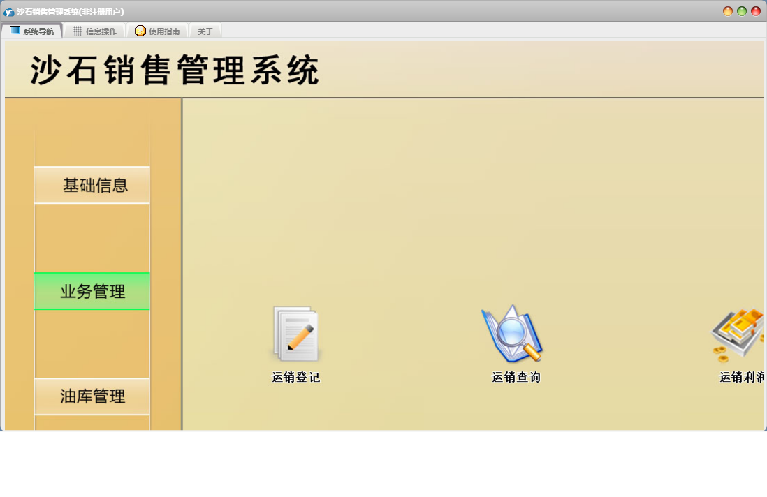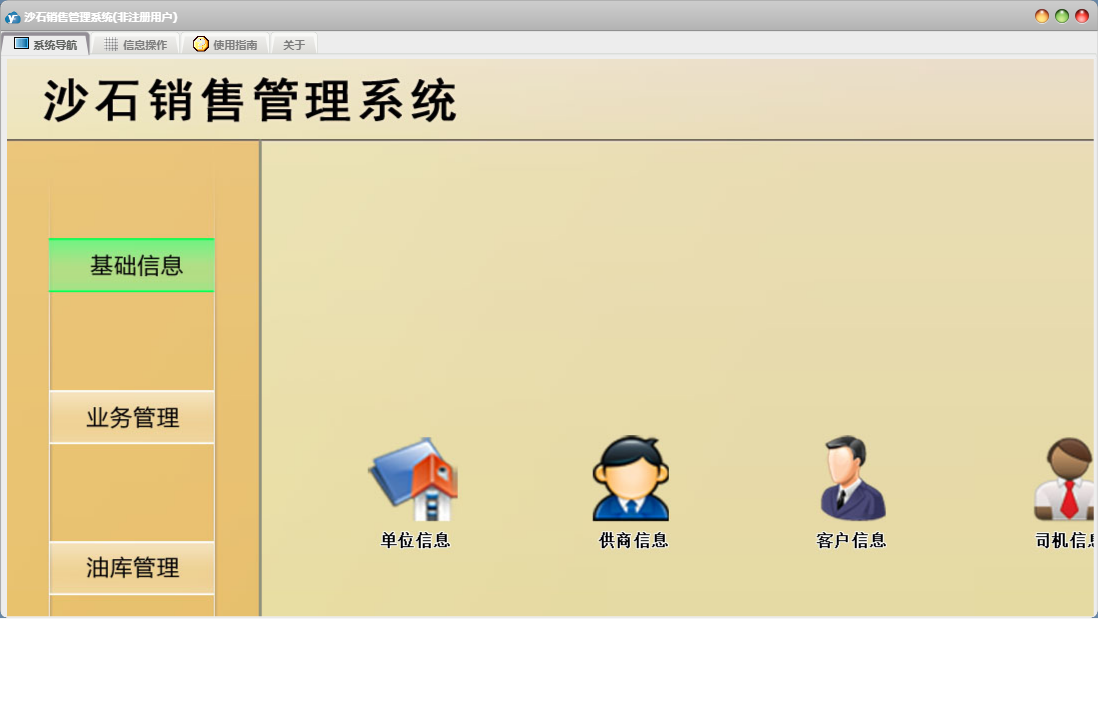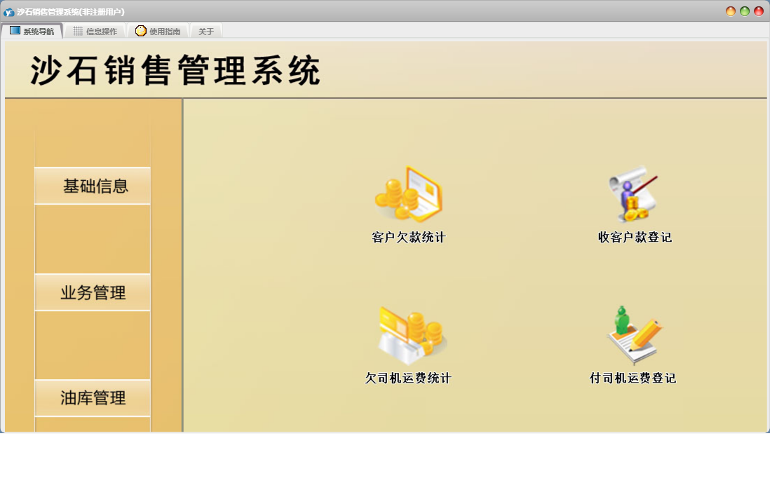 沙石销售管理系统包含以下功能:收客户款登记、财务管理、加油登记、收加油款登记、进油登记、权限设置、单位信息、关于、日常支出登记、客户信息、运销登记、业务管理、油库管理、基础信息、司机信息、日常收入登记、付司机运费登记、日志、供商信息等
