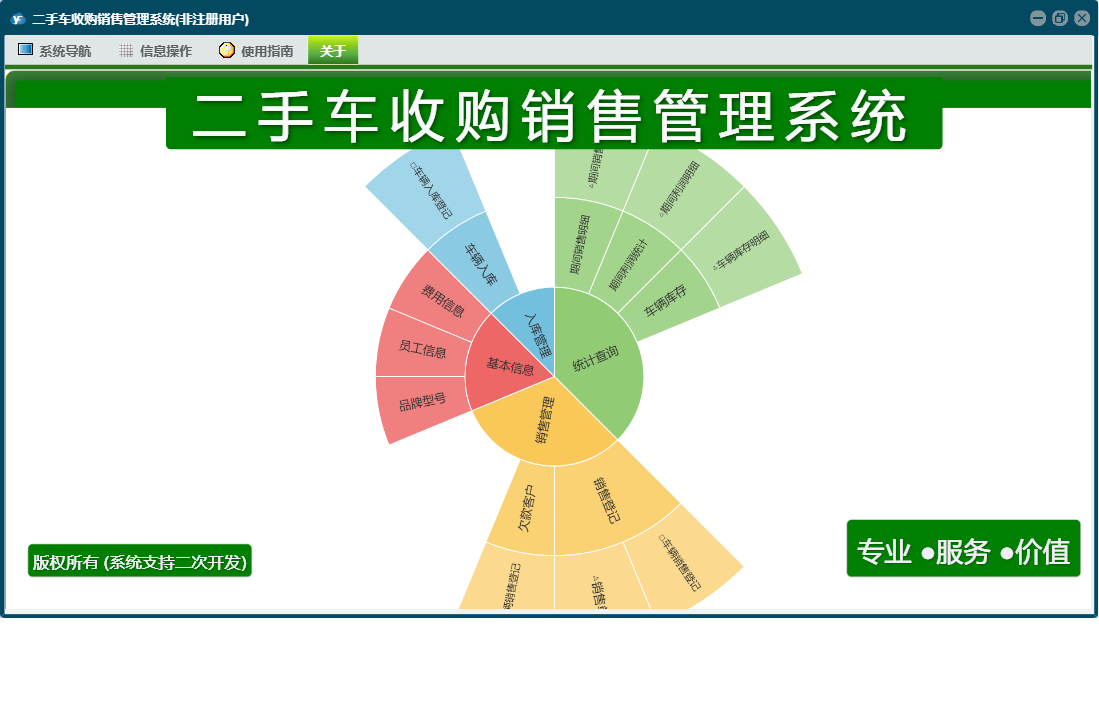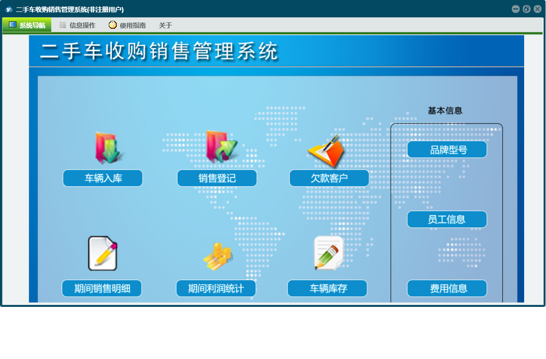二手车收购销售管理系统包含以下功能:欠款客户、关于、面板等