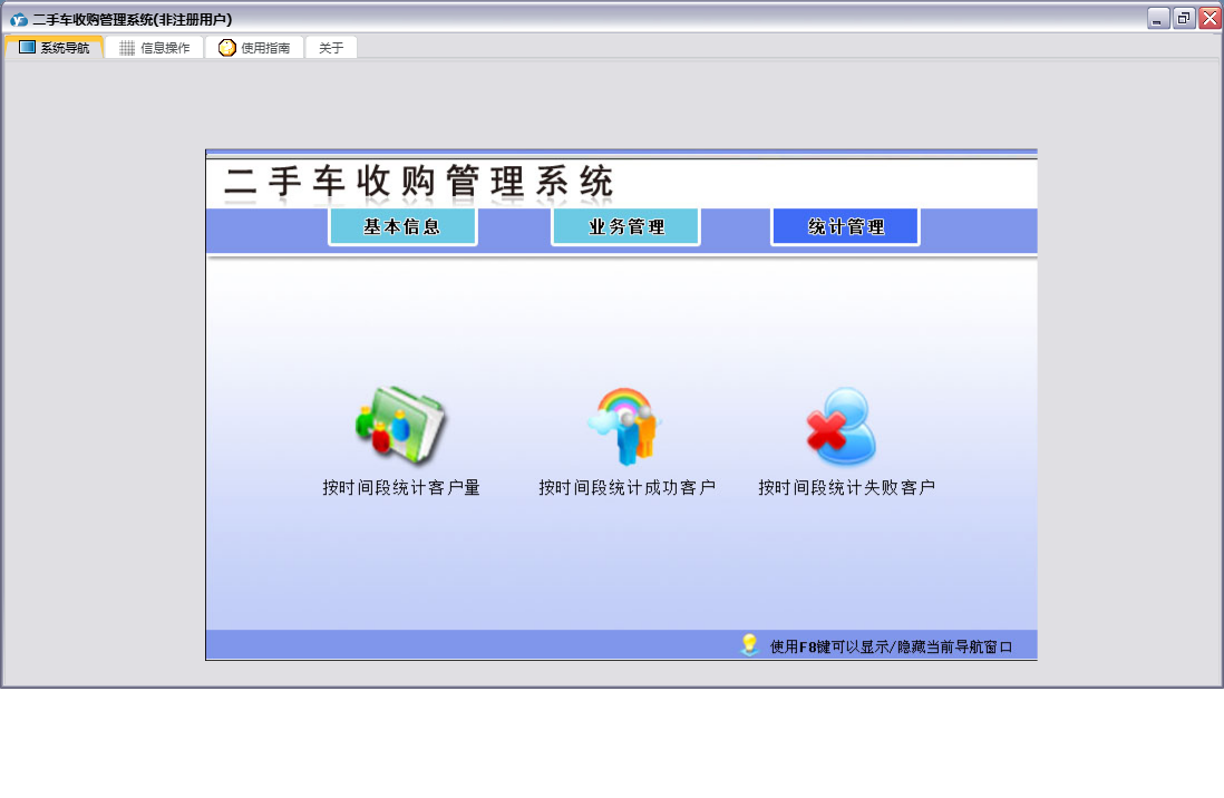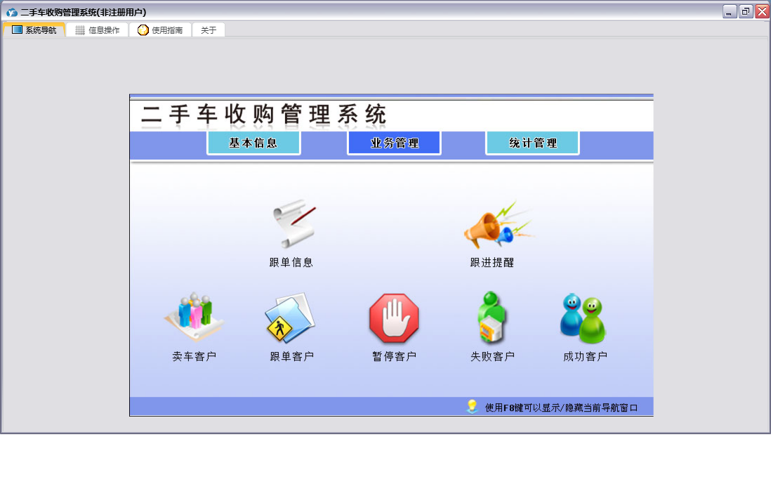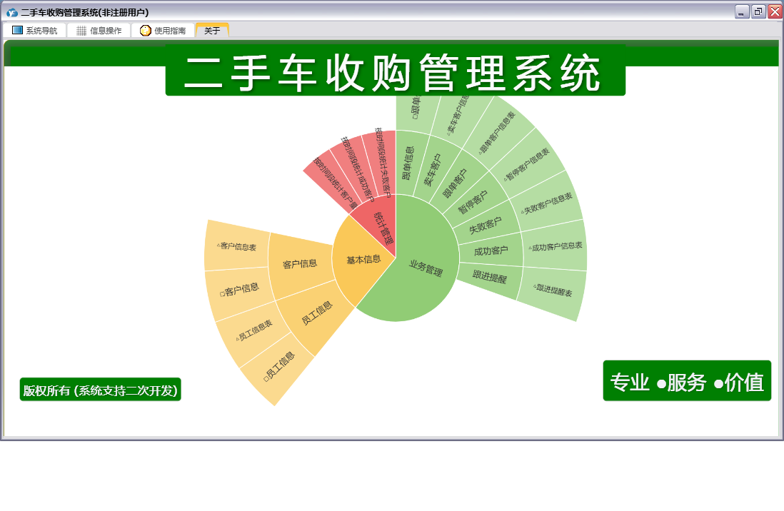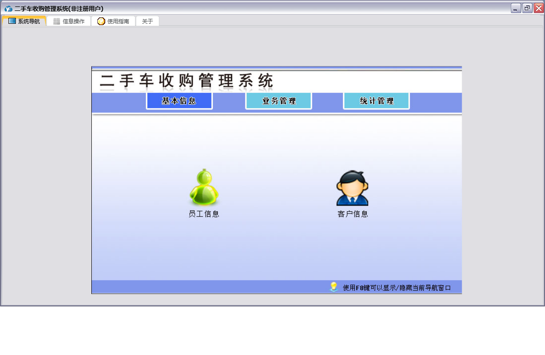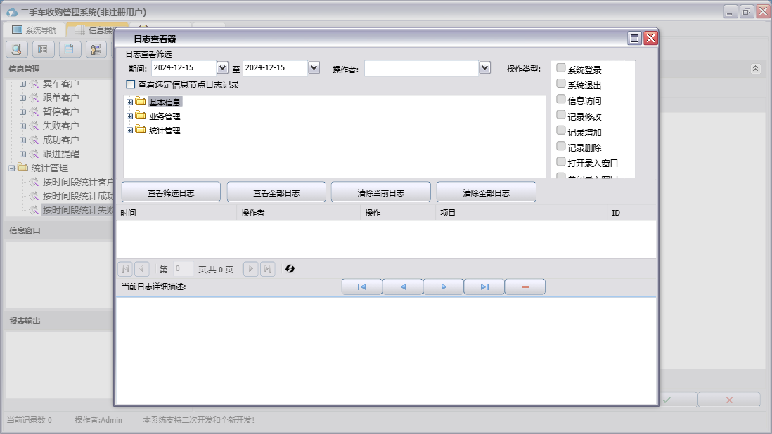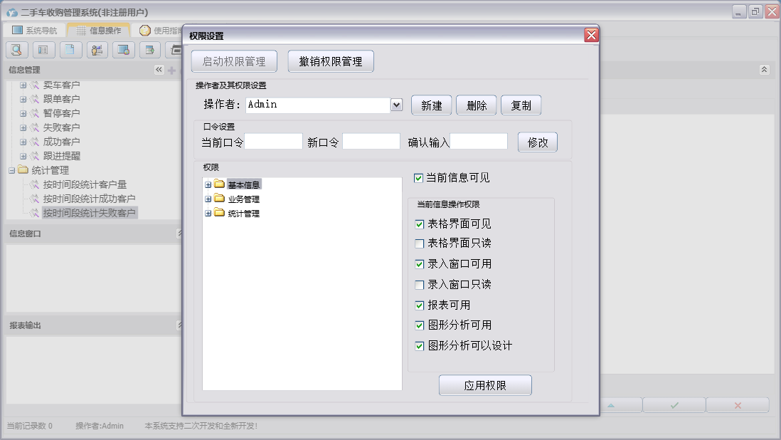 二手车收购管理系统包含以下功能:员工信息、日志、跟单信息、关于、权限设置、基本信息、统计管理、客户信息、业务管理等