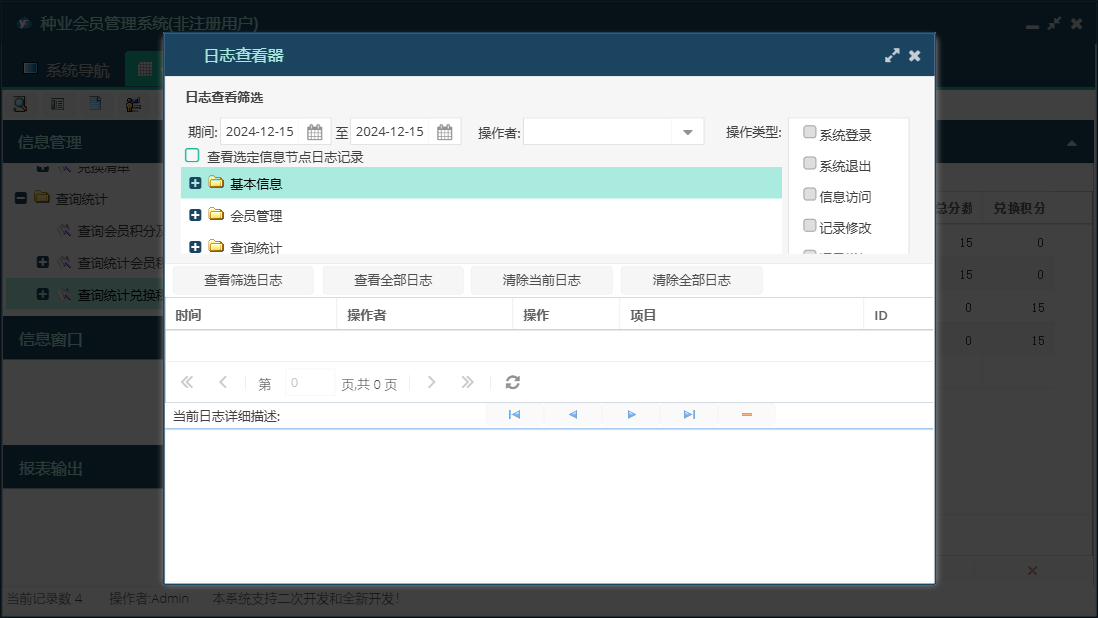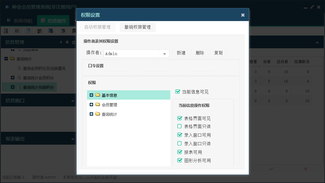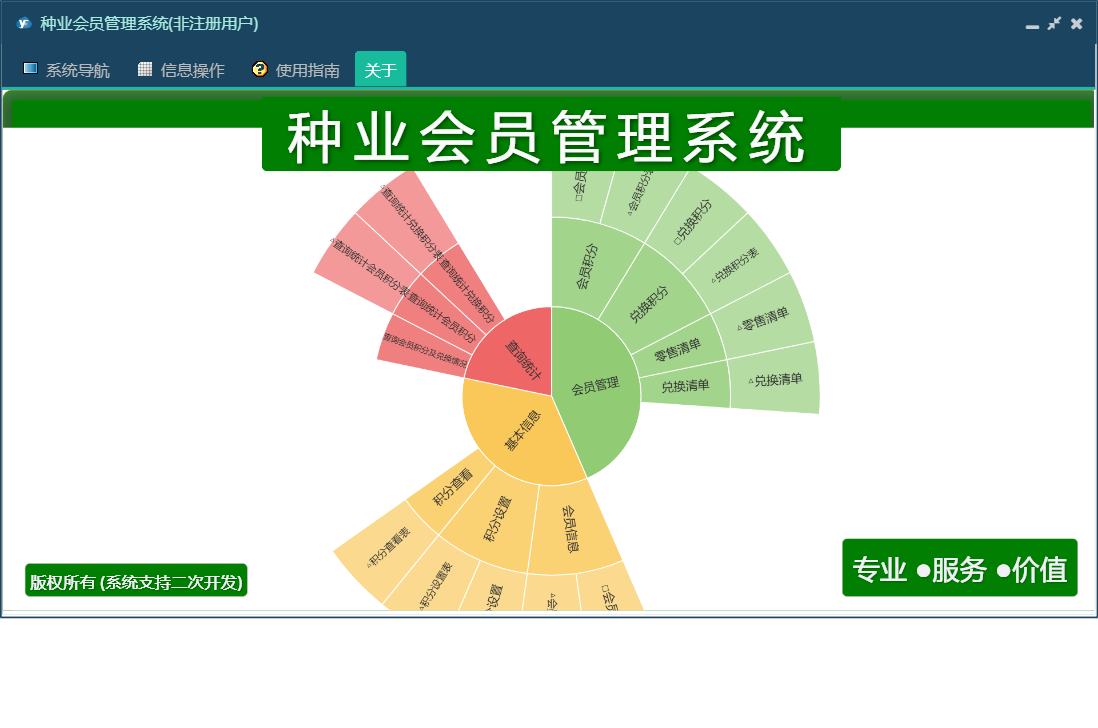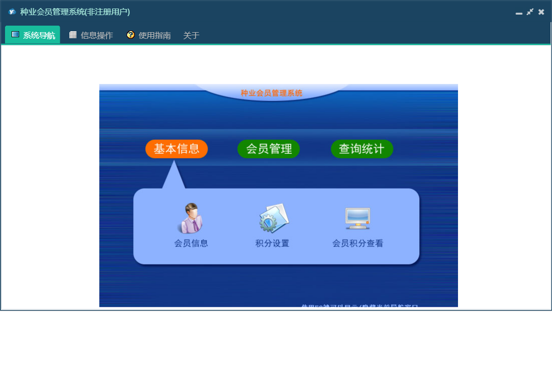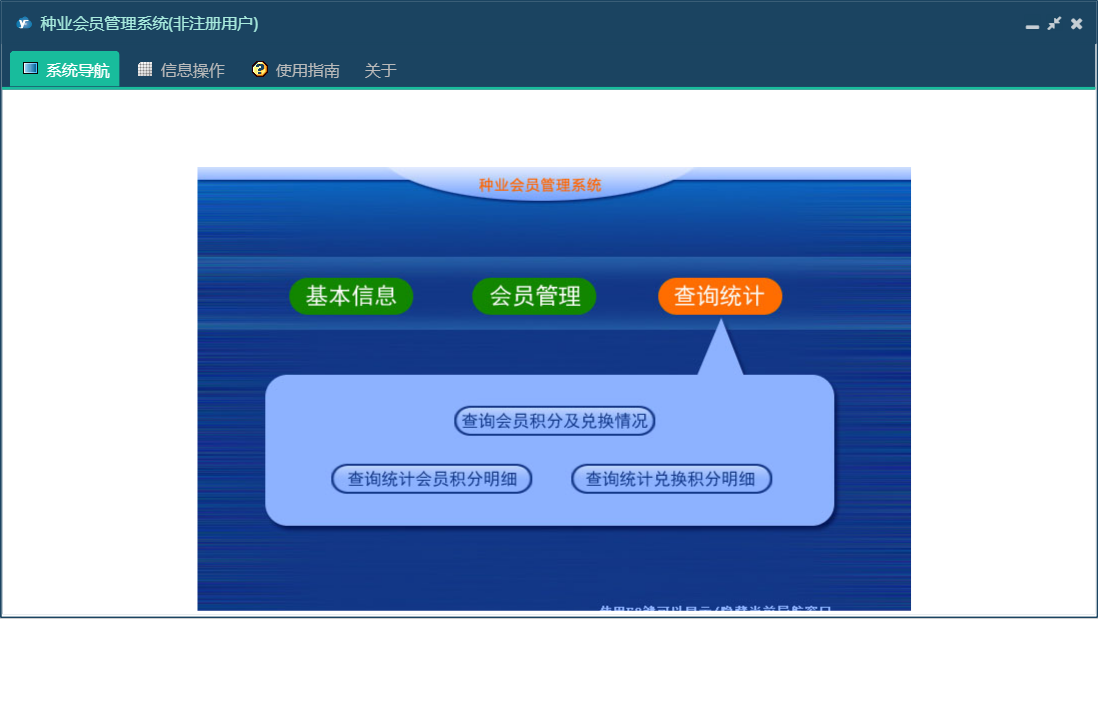 种业会员管理系统包含以下功能:积分设置、会员信息、会员管理、查询统计、兑换积分、日志、关于、权限设置、基本信息、会员积分等