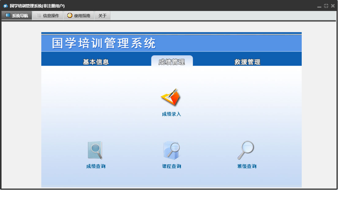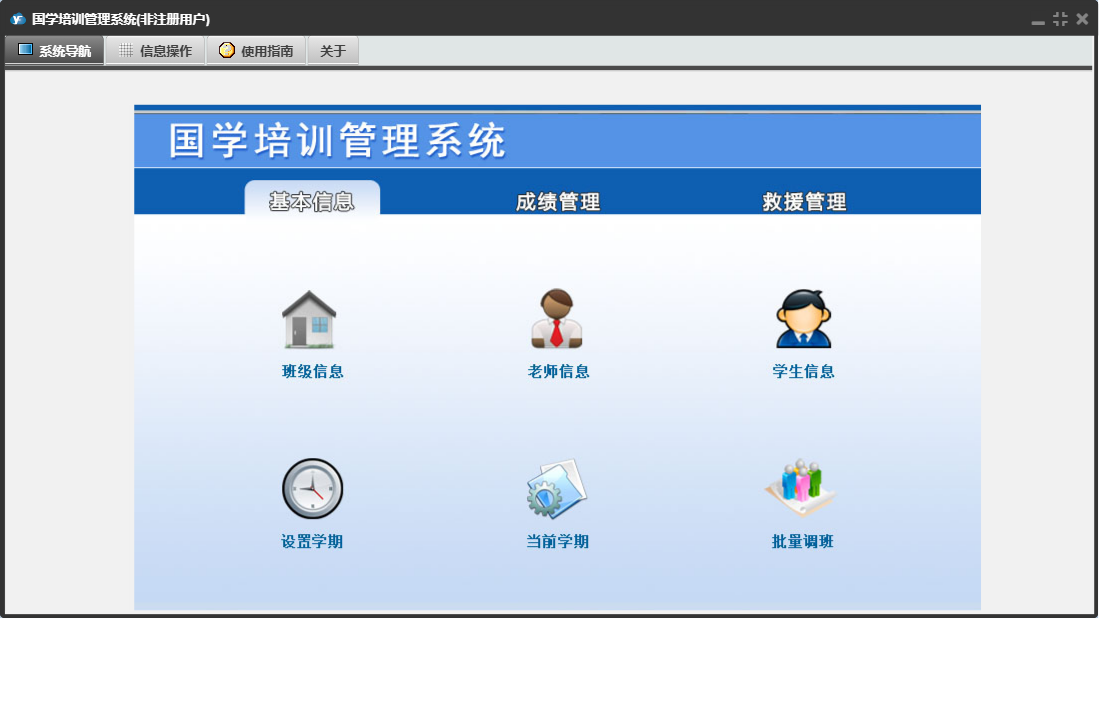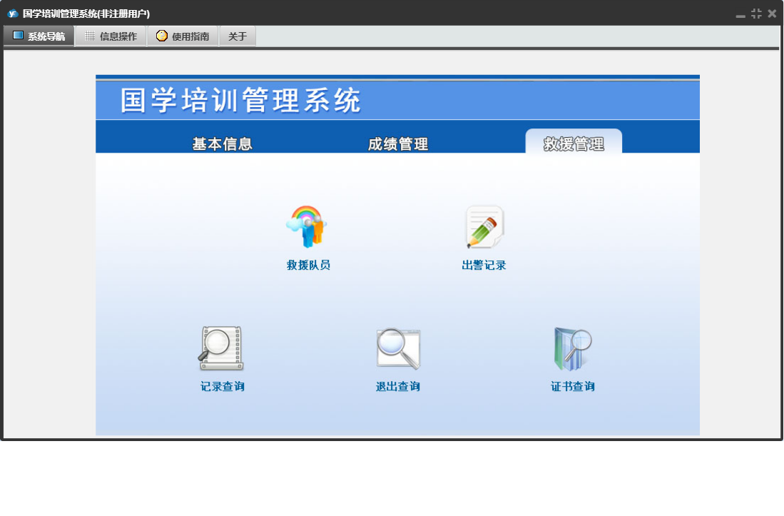 国学培训管理系统包含以下功能:班级信息、出警记录、救援队员、设置学期、学生信息、日志、当前学期、成绩录入、成绩管理、关于、基本信息、权限设置、老师信息、救援管理等
