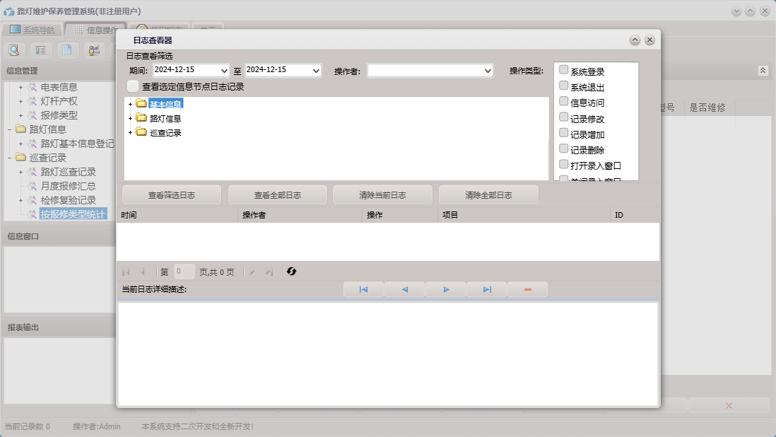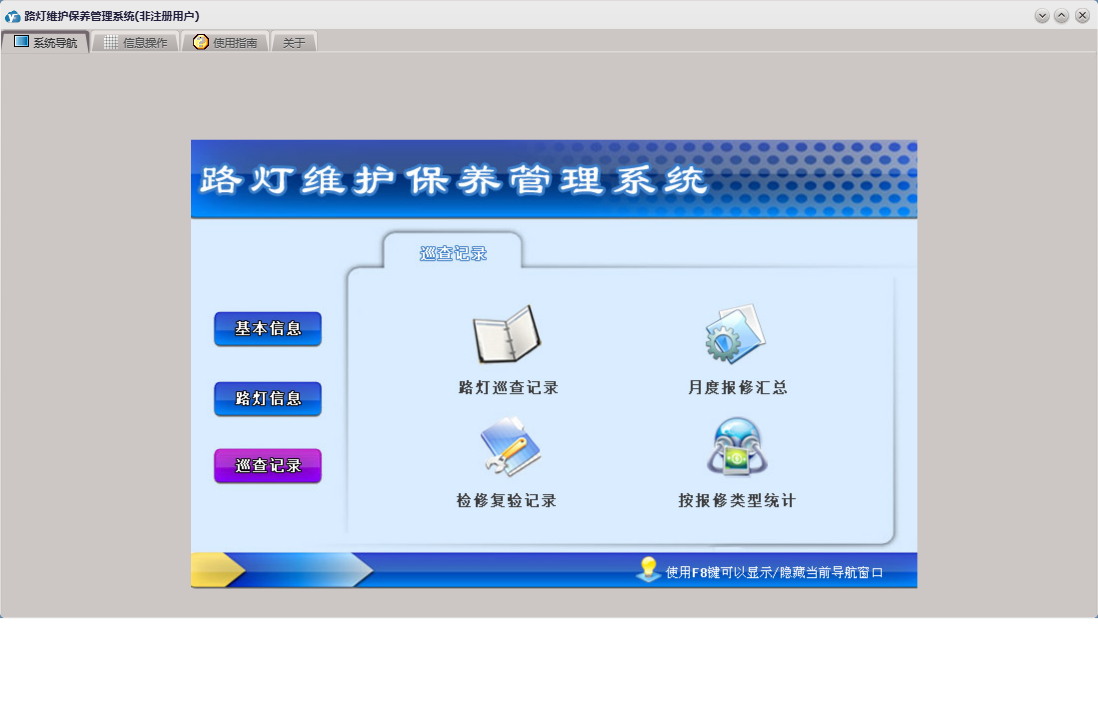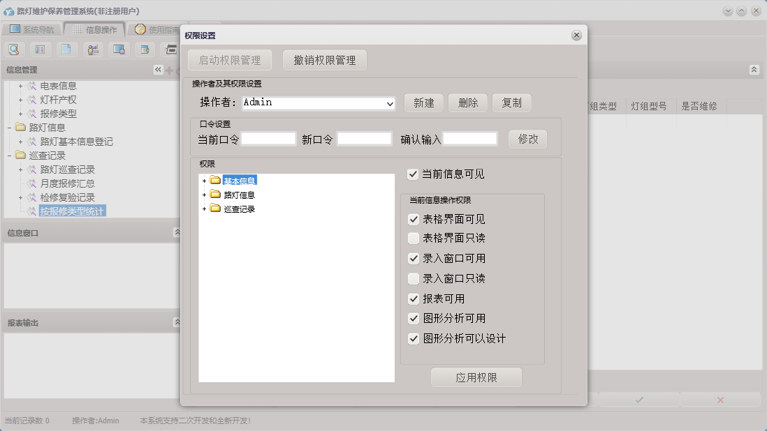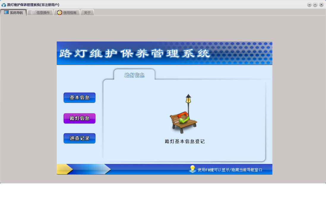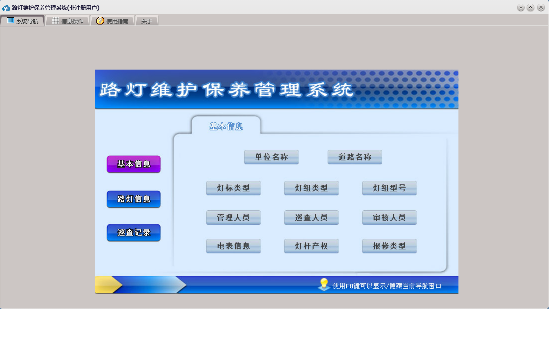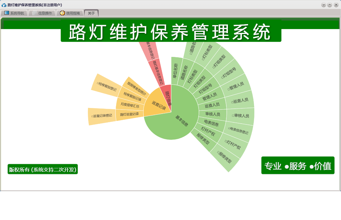 路灯维护保养管理系统包含以下功能:路灯信息、巡查人员、灯杆产权、道路名称、检修复验记录、路灯巡查记录、权限设置、灯标类型、灯组型号、灯组类型、报修类型、关于、基本信息、管理人员、审核人员、巡查记录、电表信息、路灯基本信息登记、日志等