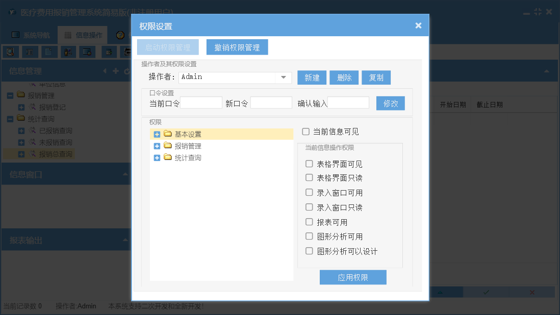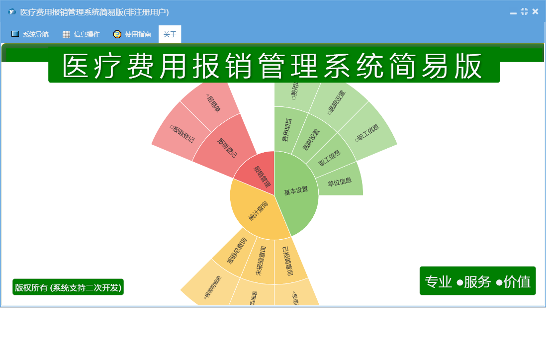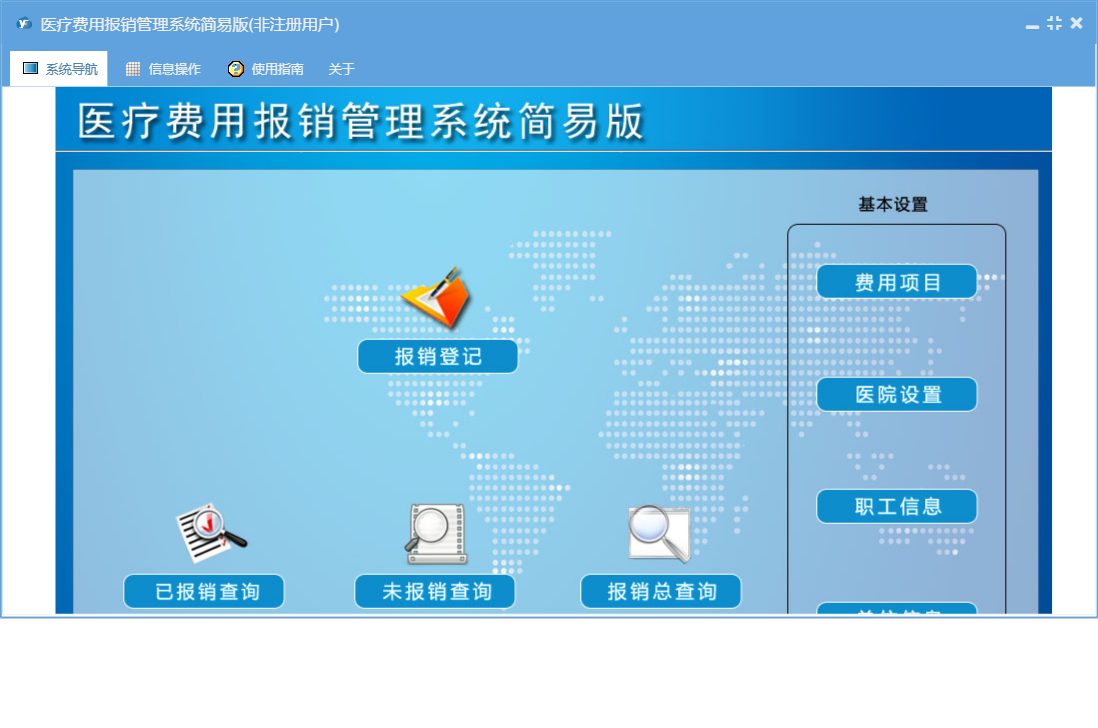 医疗费用报销管理系统简易版包含以下功能:职工信息、报销登记、基本设置、医院设置、日志、费用项目、关于、权限设置等