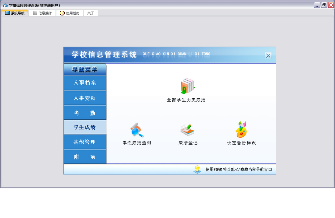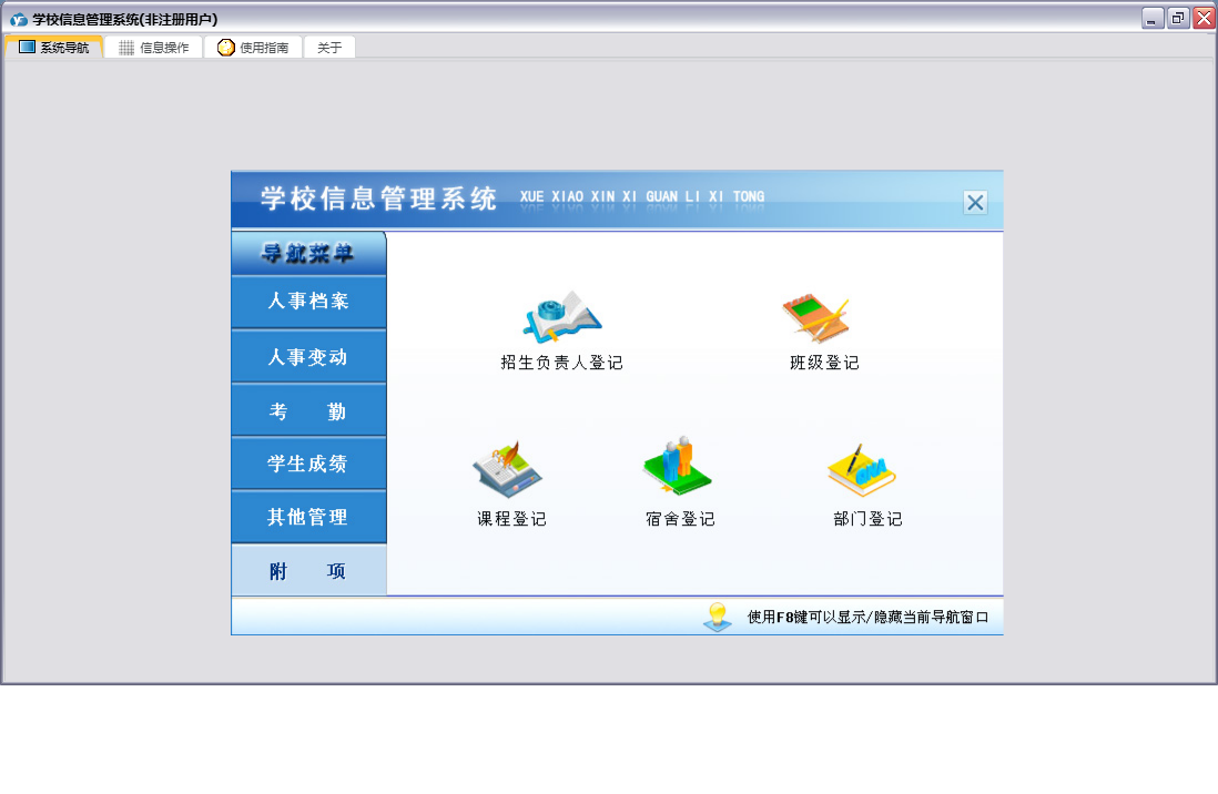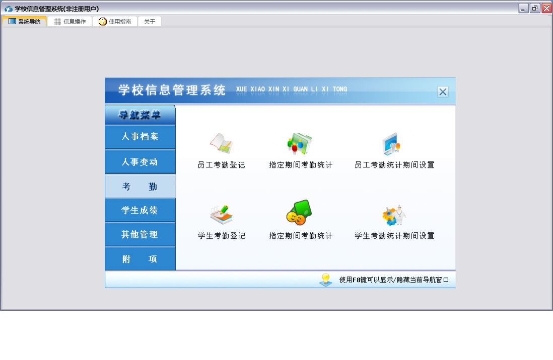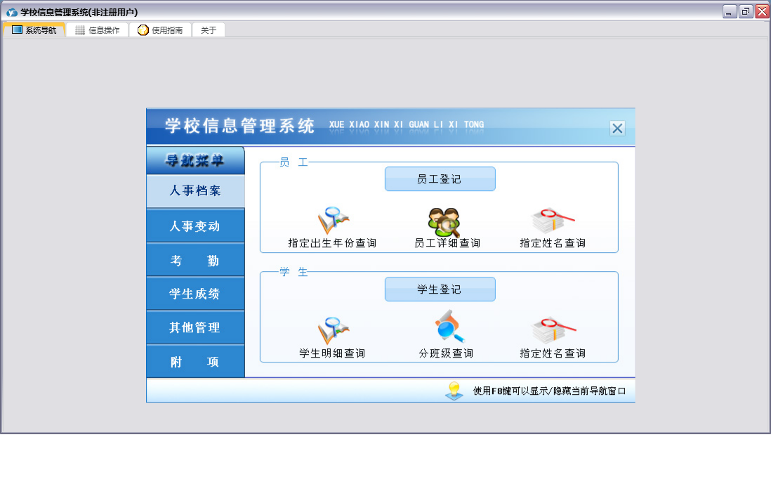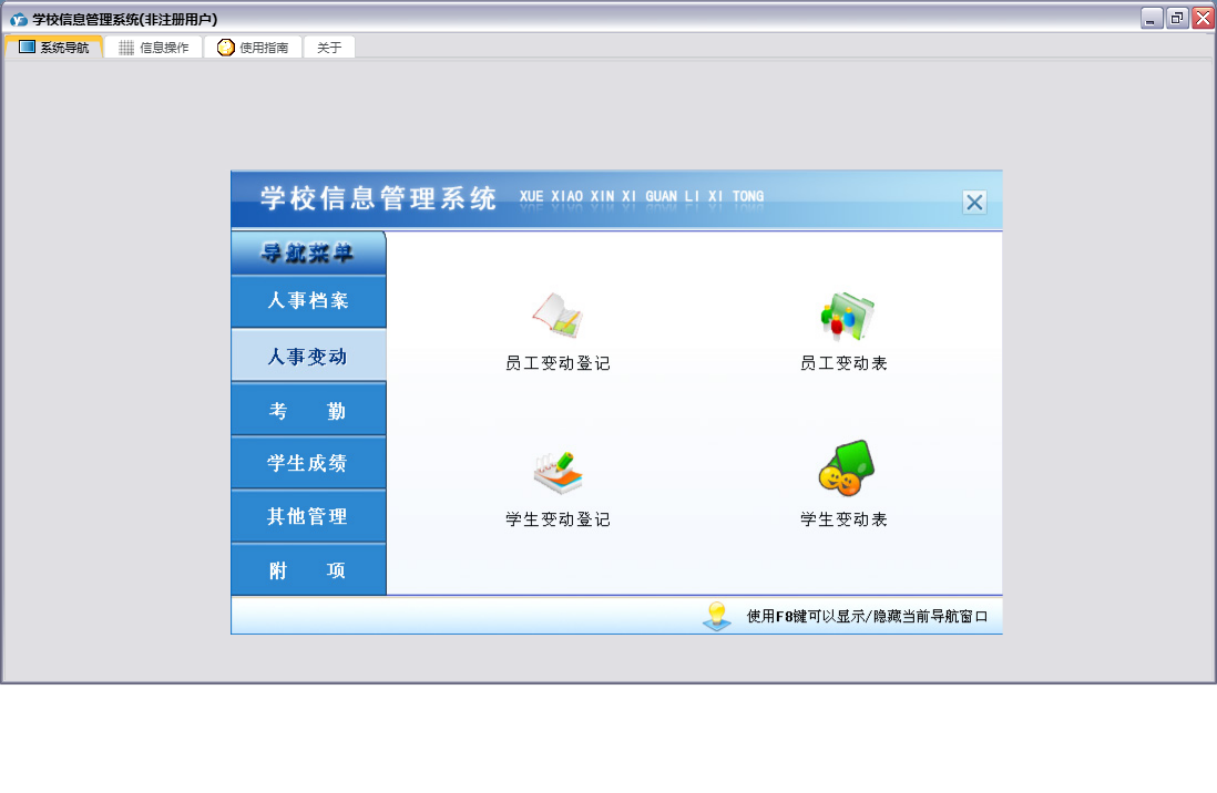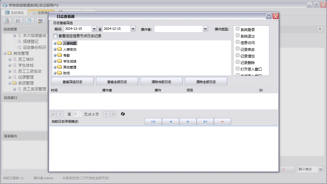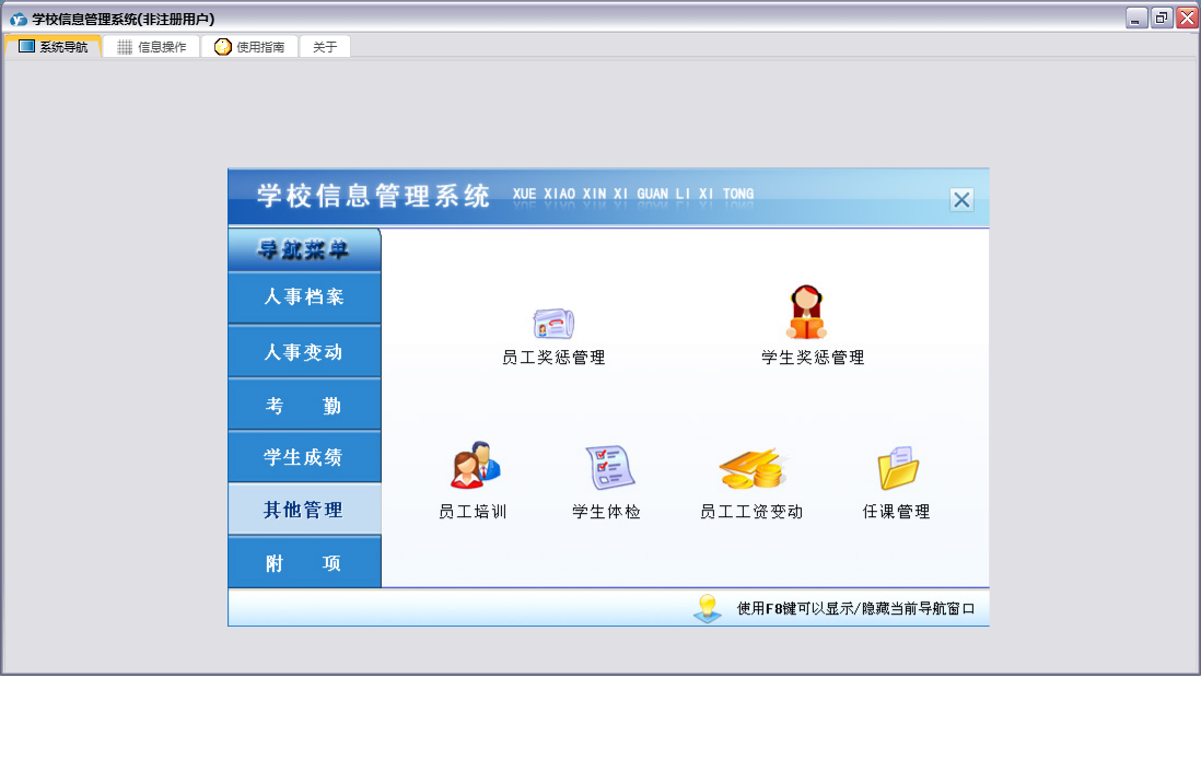 学校信息管理系统包含以下功能:人事变动、学生考勤登记、课程登记、员工考勤登记、学生变动、任课管理、员工工资变动、员工培训、部门登记、宿舍登记、权限设置、学生登记、考勤、班级登记、附项、学生奖惩管理、员工奖惩管理、关于、其他管理、员工变动、员工登记、人事档案、日志、学生成绩、学生体检等