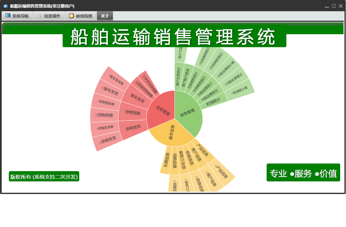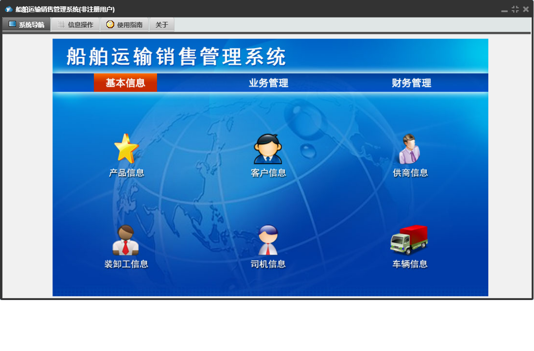 船舶运输销售管理系统包含以下功能:司机信息、供商信息、关于、基本信息、产品信息、装卸工信息、财务管理、业务管理等