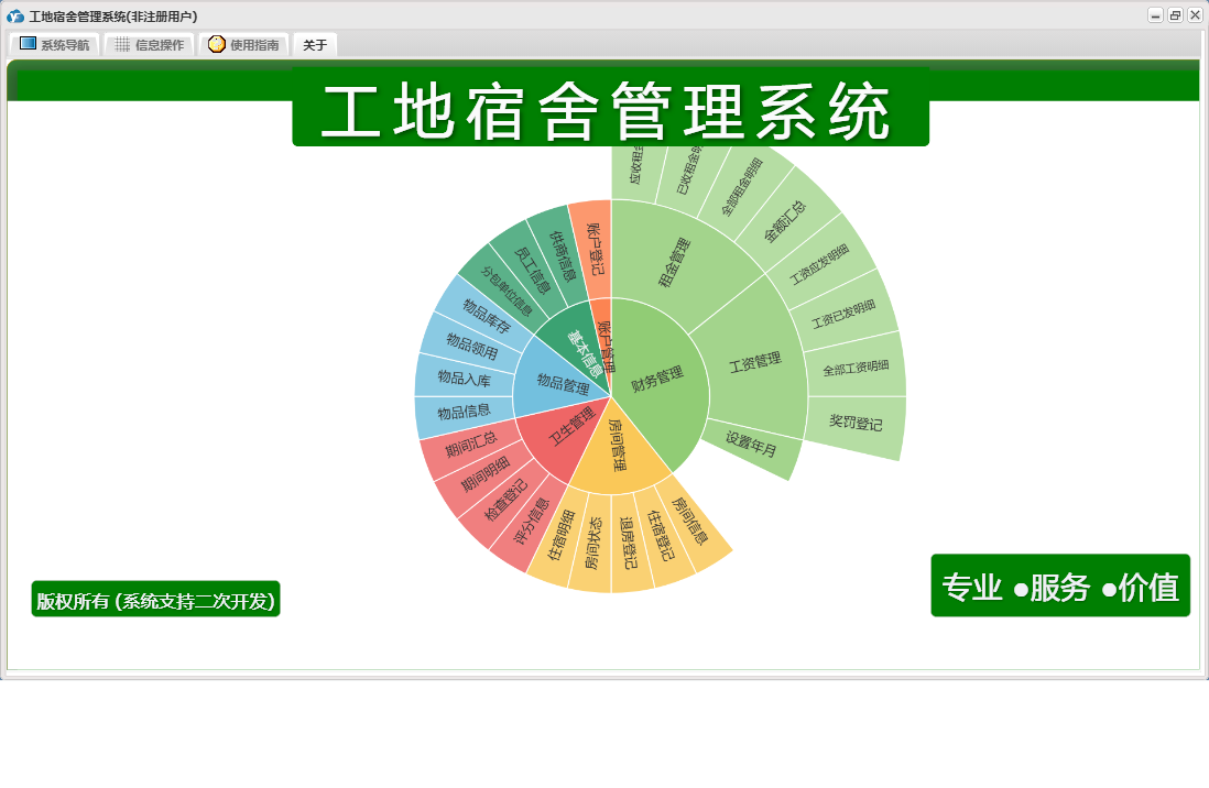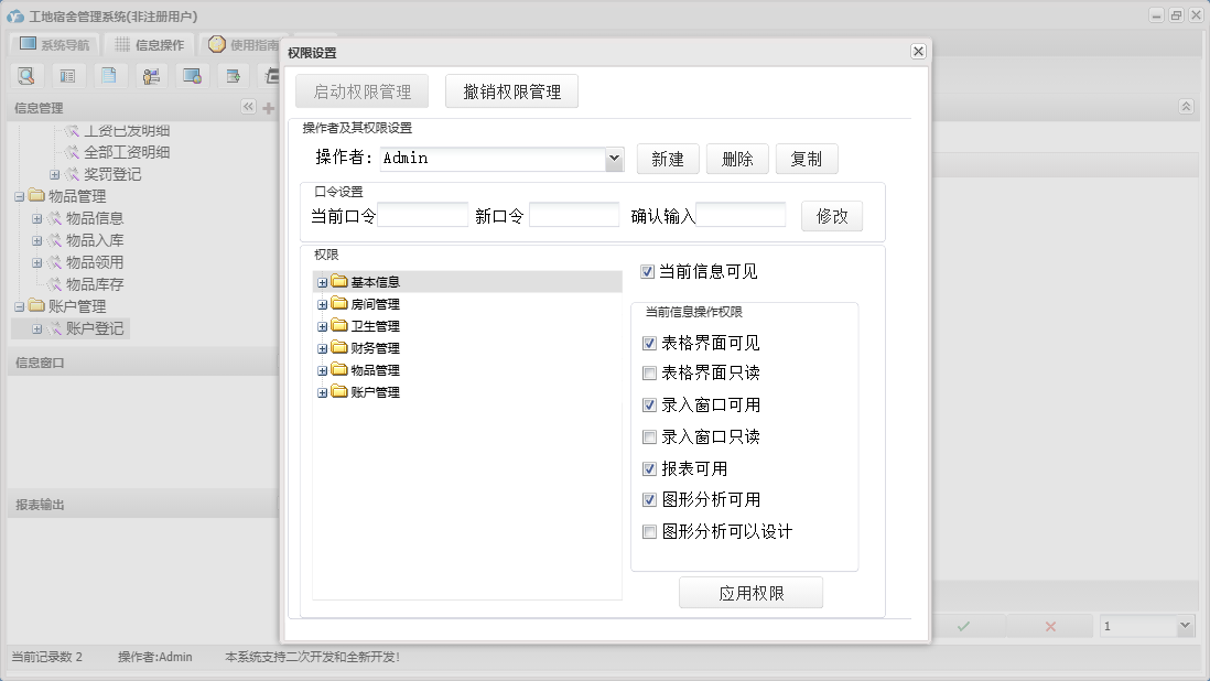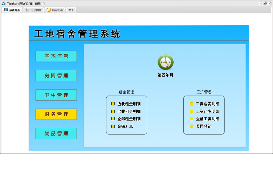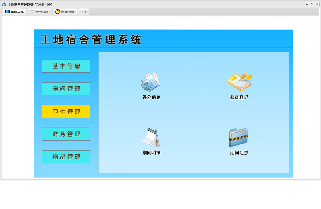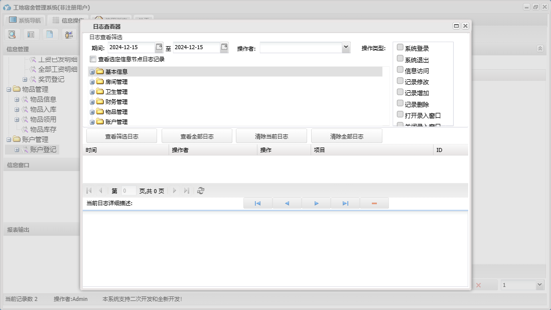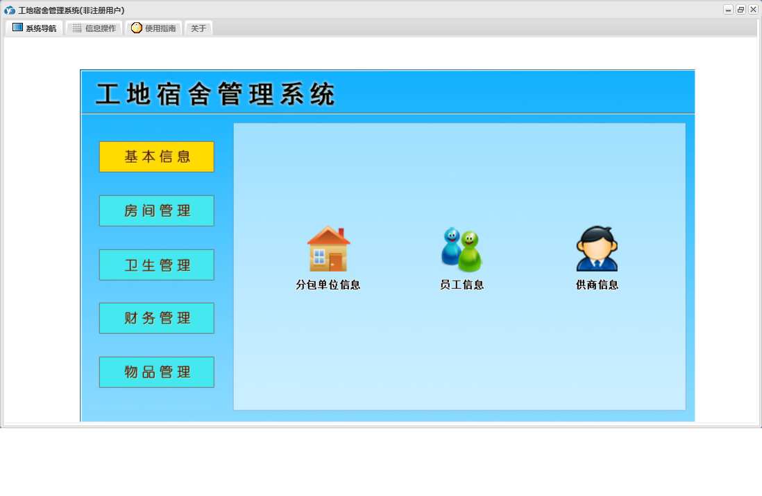 工地宿舍管理系统包含以下功能:房间信息、检查登记、房间管理、财务管理、物品入库、住宿登记、卫生管理、退房登记、日志、关于、基本信息、账户登记、权限设置、物品管理、奖罚登记、物品领用等