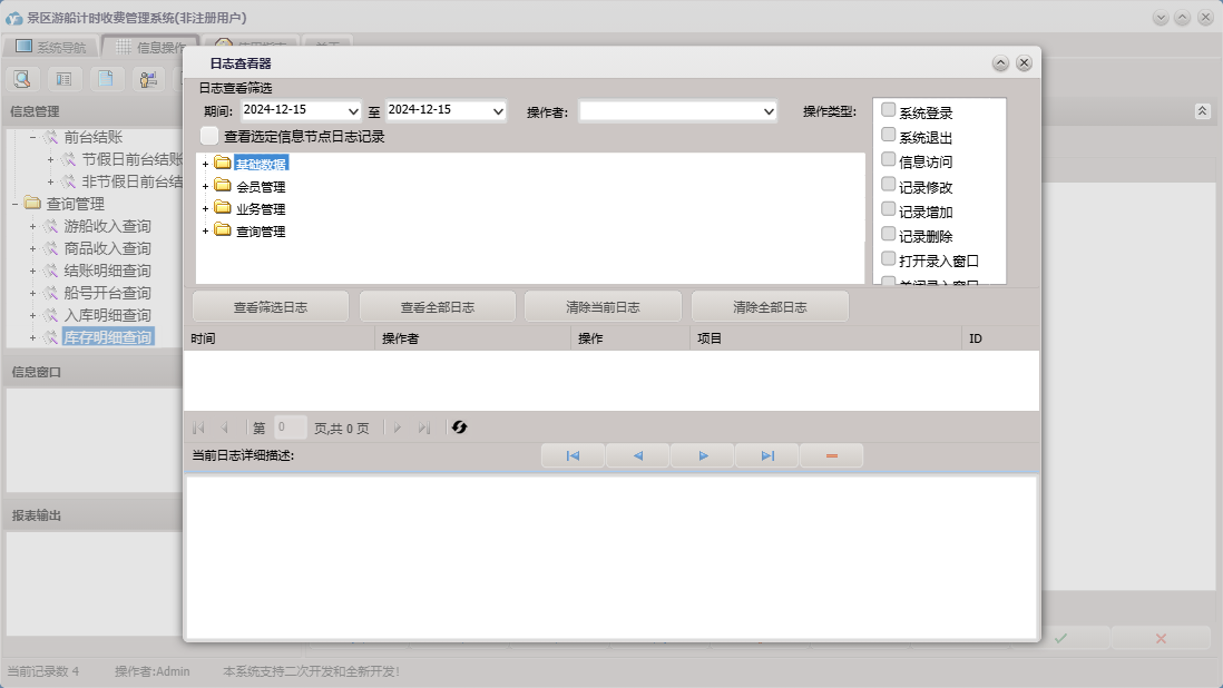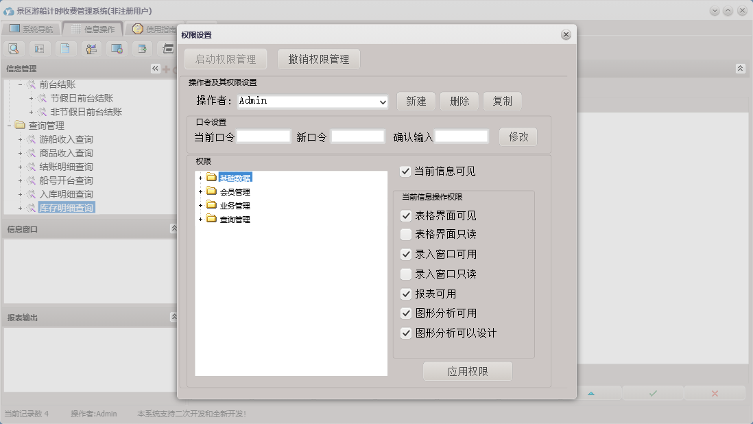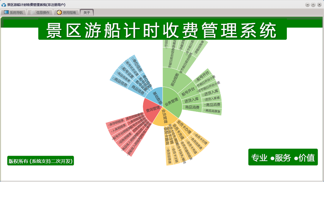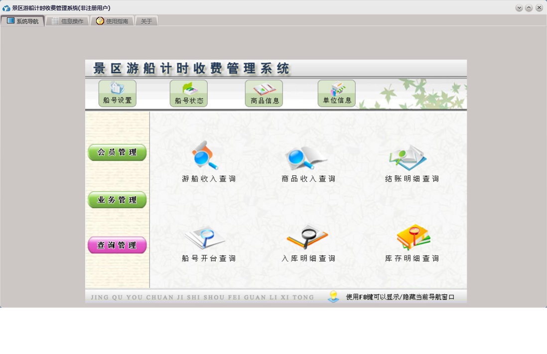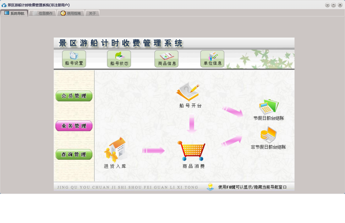 景区游船计时收费管理系统包含以下功能:进货入库、会员卡办理、商品信息、节假日前台结账、权限设置、非节假日前台结账、查询管理、会员卡注销、单位信息、船号开台、船号状态、关于、商品消费、船号设置、业务管理、会员卡充值、会员管理、日志、会员卡挂失等
