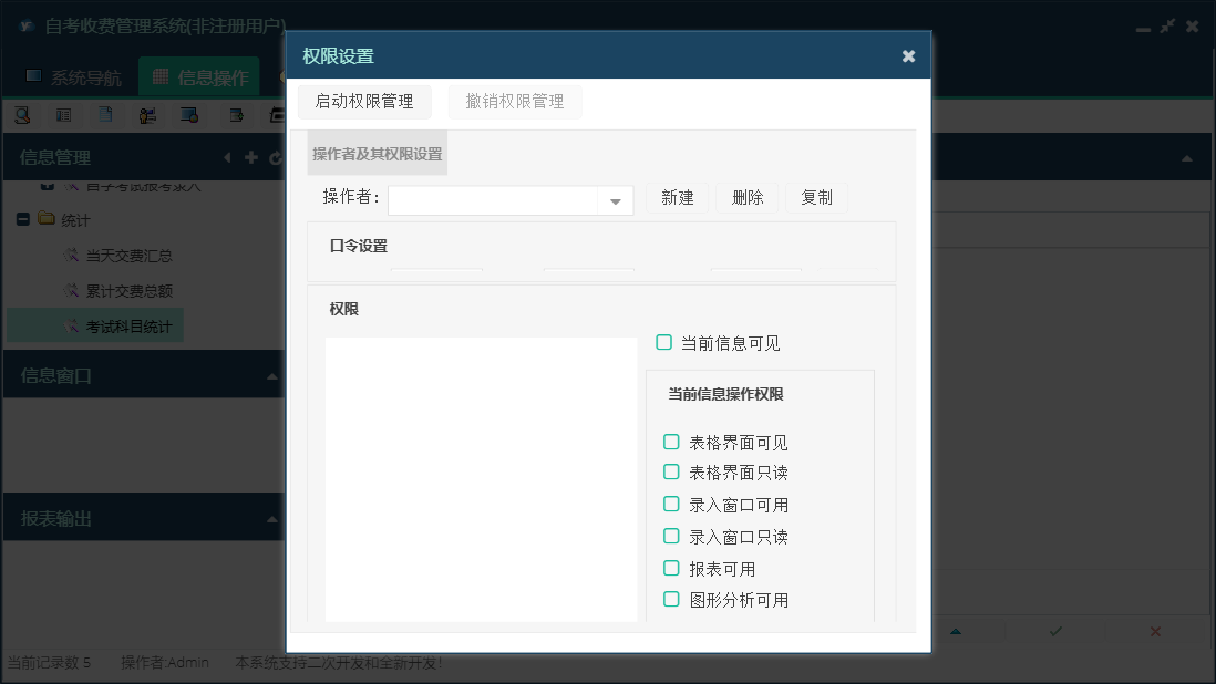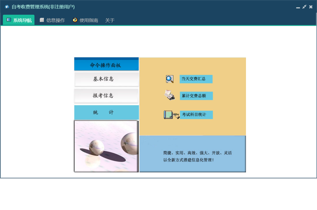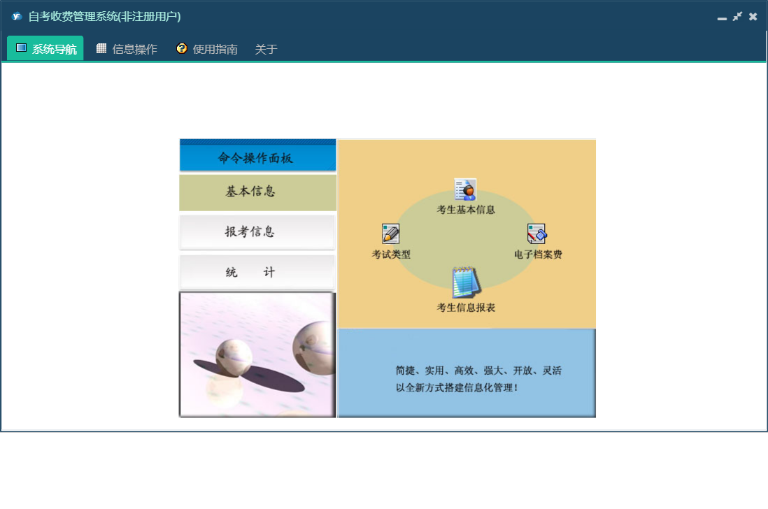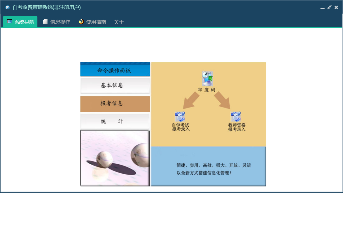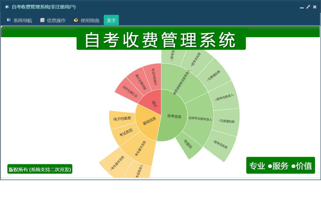自考收费管理系统包含以下功能:教师资格考试报考录入、报考信息、日志、考生基本信息、关于、权限设置、统计、自学考试报考录入、主面板等
