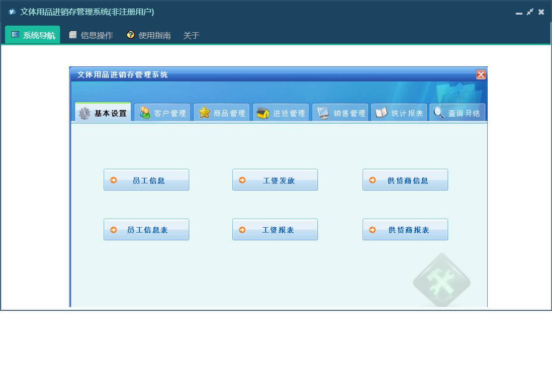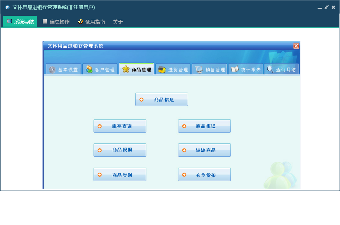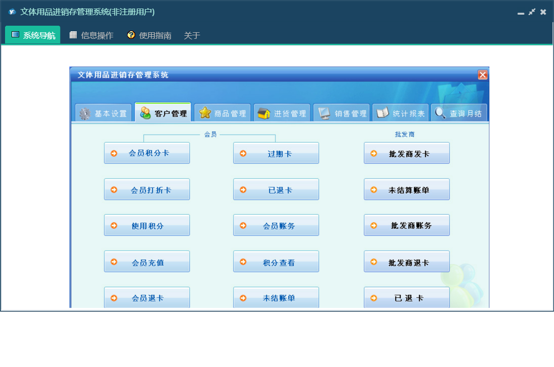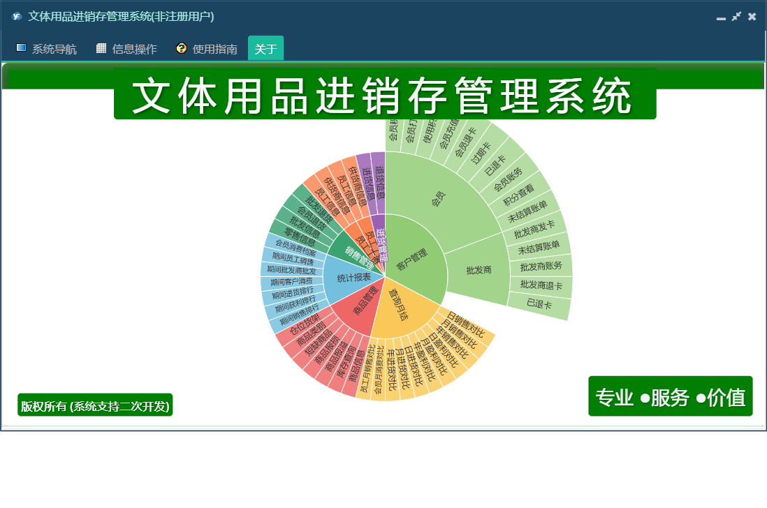 文体用品进销存管理系统包含以下功能:销售管理、零售信息、批发商发卡、退货信息、会员打折卡、使用积分、会员退货、批发退货、商品报溢、商品信息、商品类别、统计、权限设置、仓位货架、过期卡、会员充值、批发信息、关于、基本信息、客户信息、会员积分卡、查询月结、商品管理、商品报损、进货管理、员工信息、供货商信息、日志、进货信息、已退卡、会员退卡等