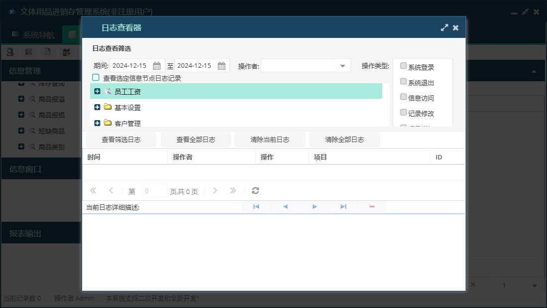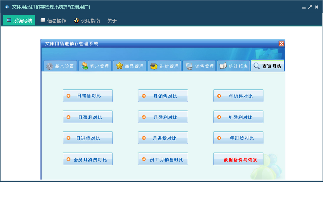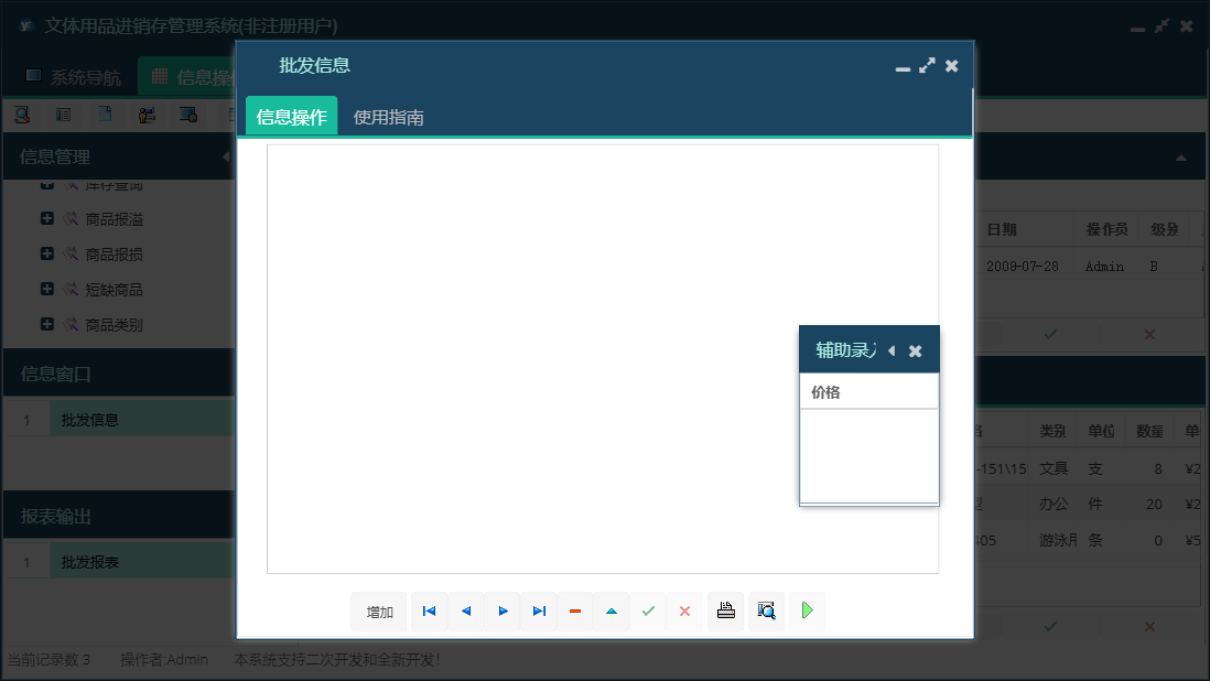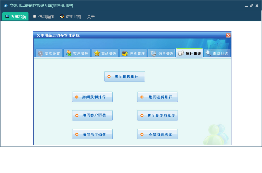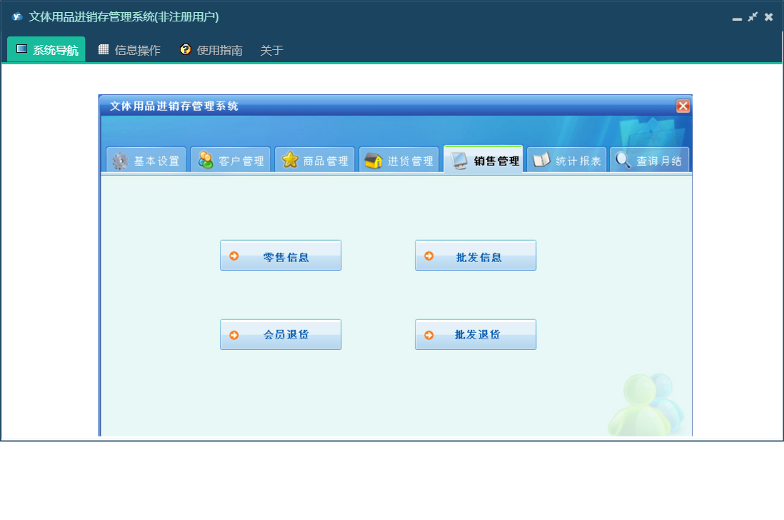 文体用品进销存管理系统包含以下功能:销售管理、零售信息、批发商发卡、退货信息、会员打折卡、使用积分、会员退货、批发退货、商品报溢、商品信息、商品类别、统计、权限设置、仓位货架、过期卡、会员充值、批发信息、关于、基本信息、客户信息、会员积分卡、查询月结、商品管理、商品报损、进货管理、员工信息、供货商信息、日志、进货信息、已退卡、会员退卡等