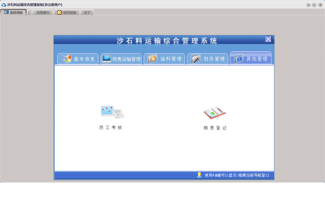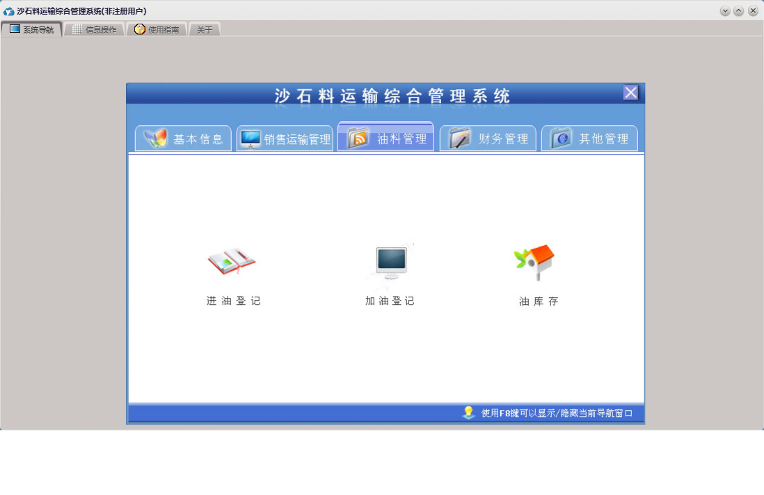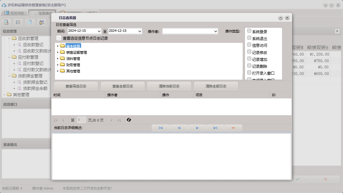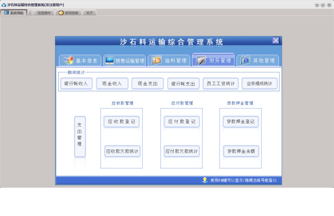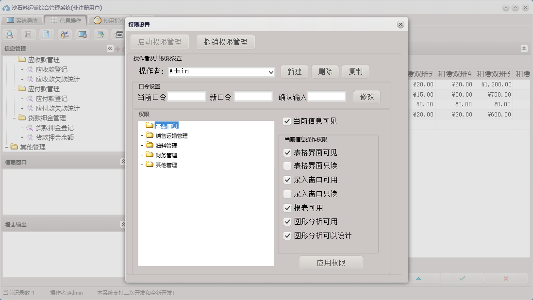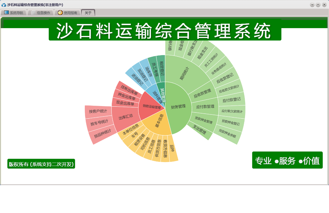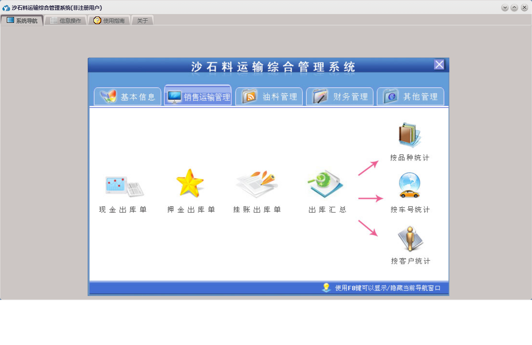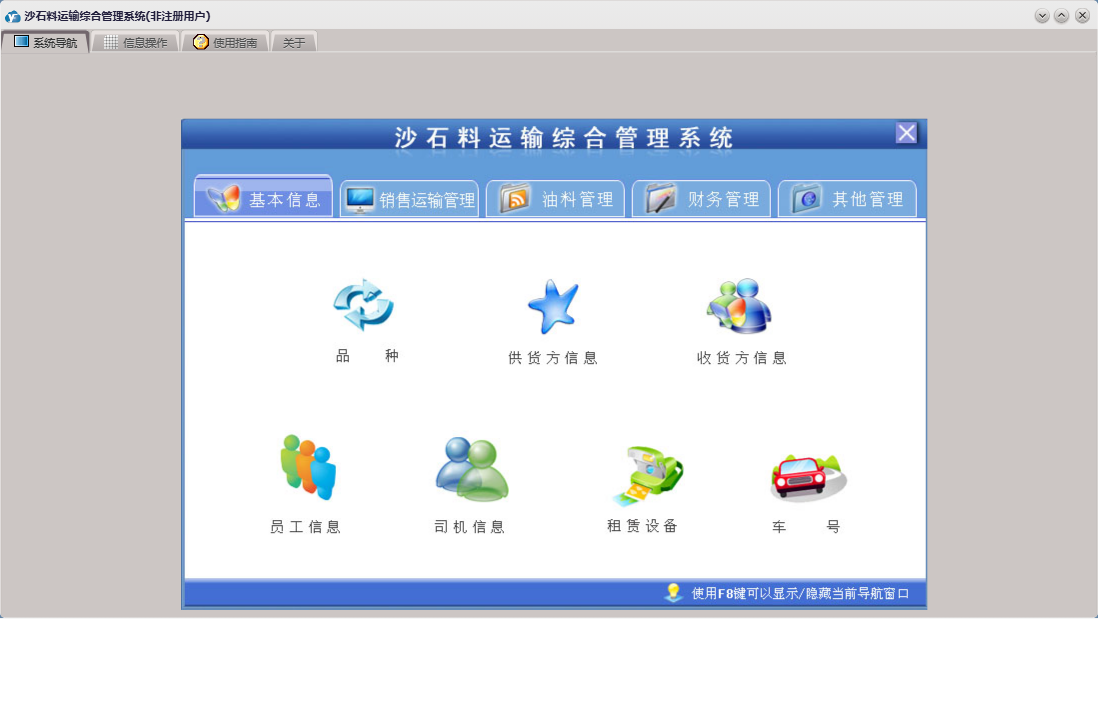 沙石料运输综合管理系统包含以下功能:收货方信息、车号、应付款登记、支出管理、员工考核、财务管理、供货方信息、加油登记、本单位信息、品种、销售运输管理、货款押金登记、进油登记、押金出库单、权限设置、租赁登记、关于、基本信息、挂帐出库单、现金出库单、租赁设备、司机信息、员工信息、油料管理、日志、应收款登记、其它管理等