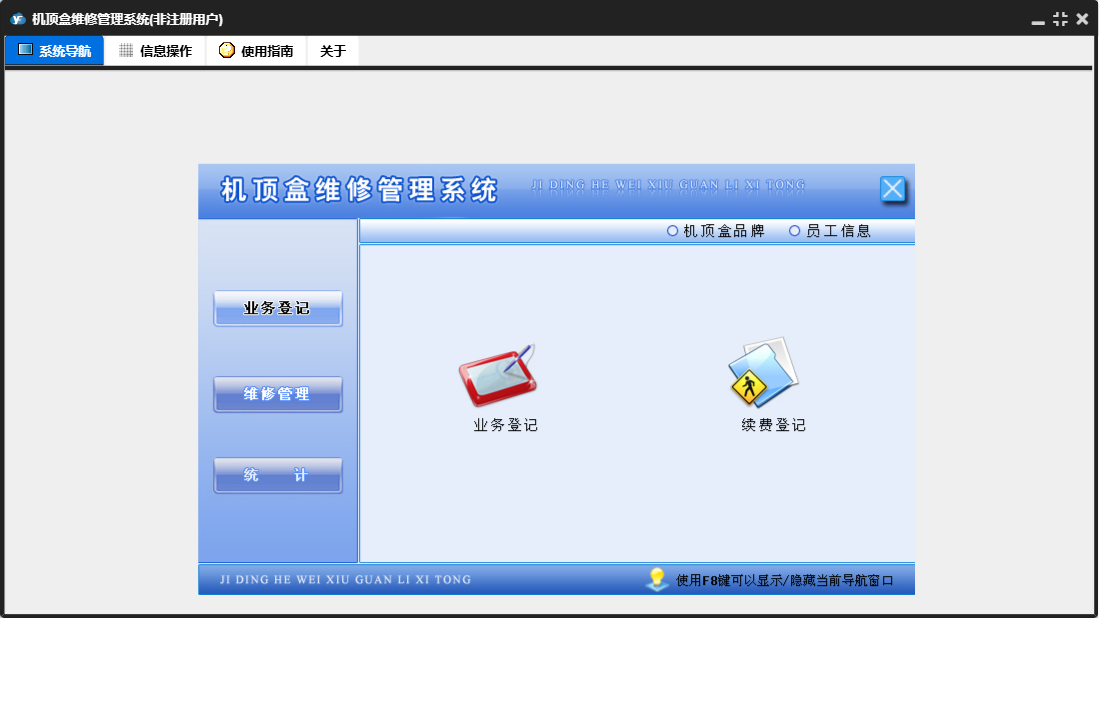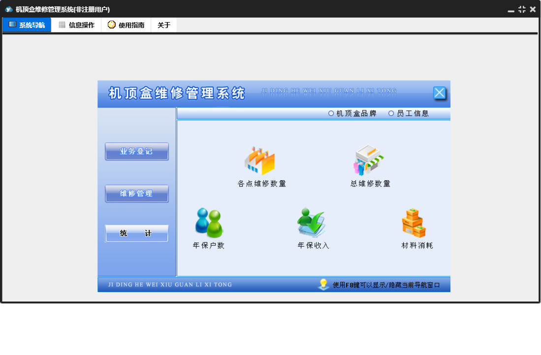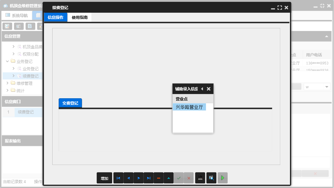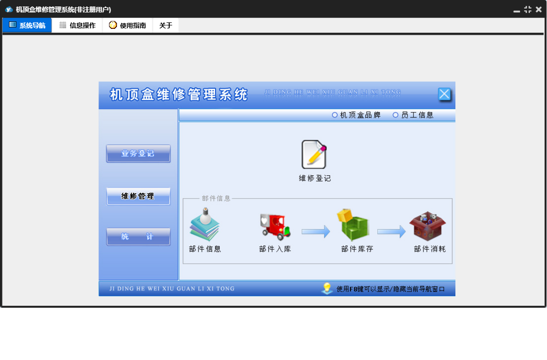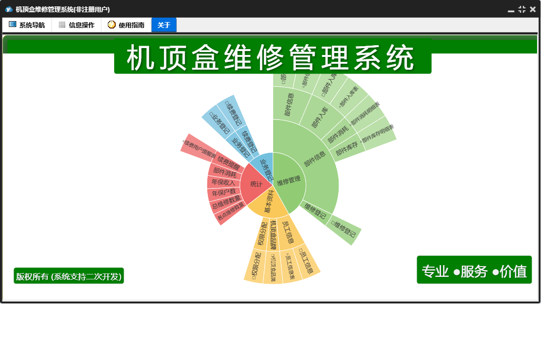 机顶盒维修管理系统包含以下功能:维修管理、机顶盒品牌、维修登记、员工信息、权限分配、业务登记、日志、关于、权限设置、统计、续费登记、部件入库、部件信息等