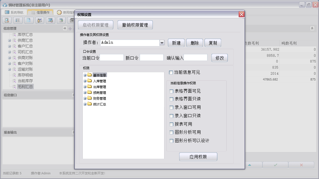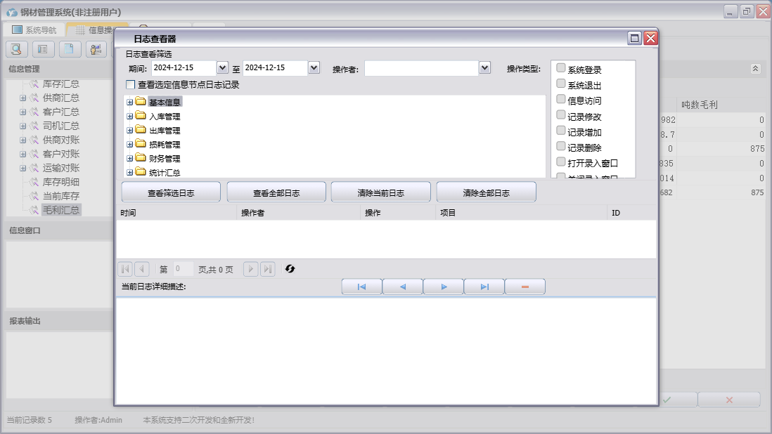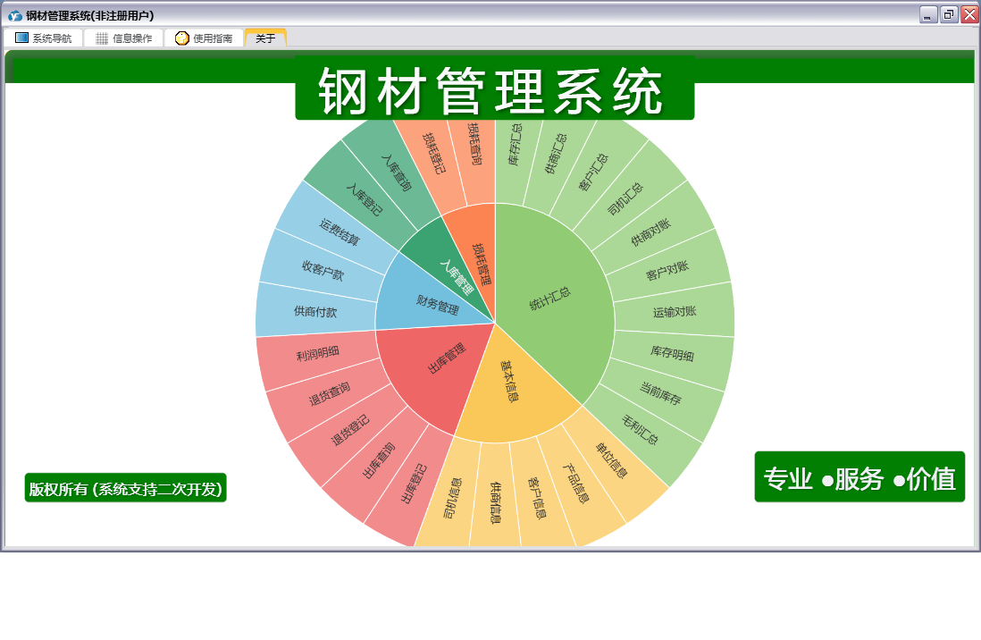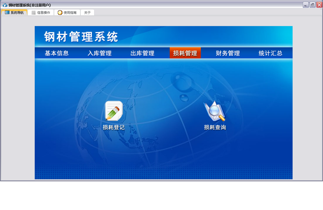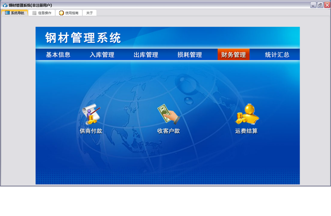 钢材管理系统包含以下功能:运费结算、出库登记、产品信息、收客户款、统计汇总、财务管理、退货登记、入库登记、权限设置、供商付款、出库管理、损耗登记、关于、基本信息、客户信息、入库管理、司机信息、日志、损耗管理、供商信息等