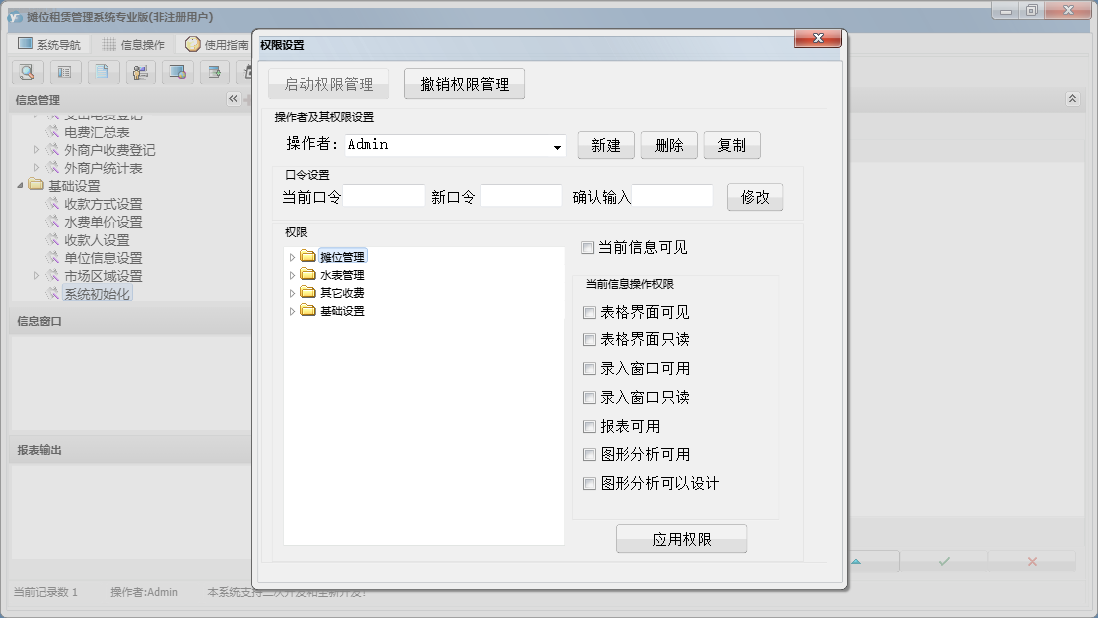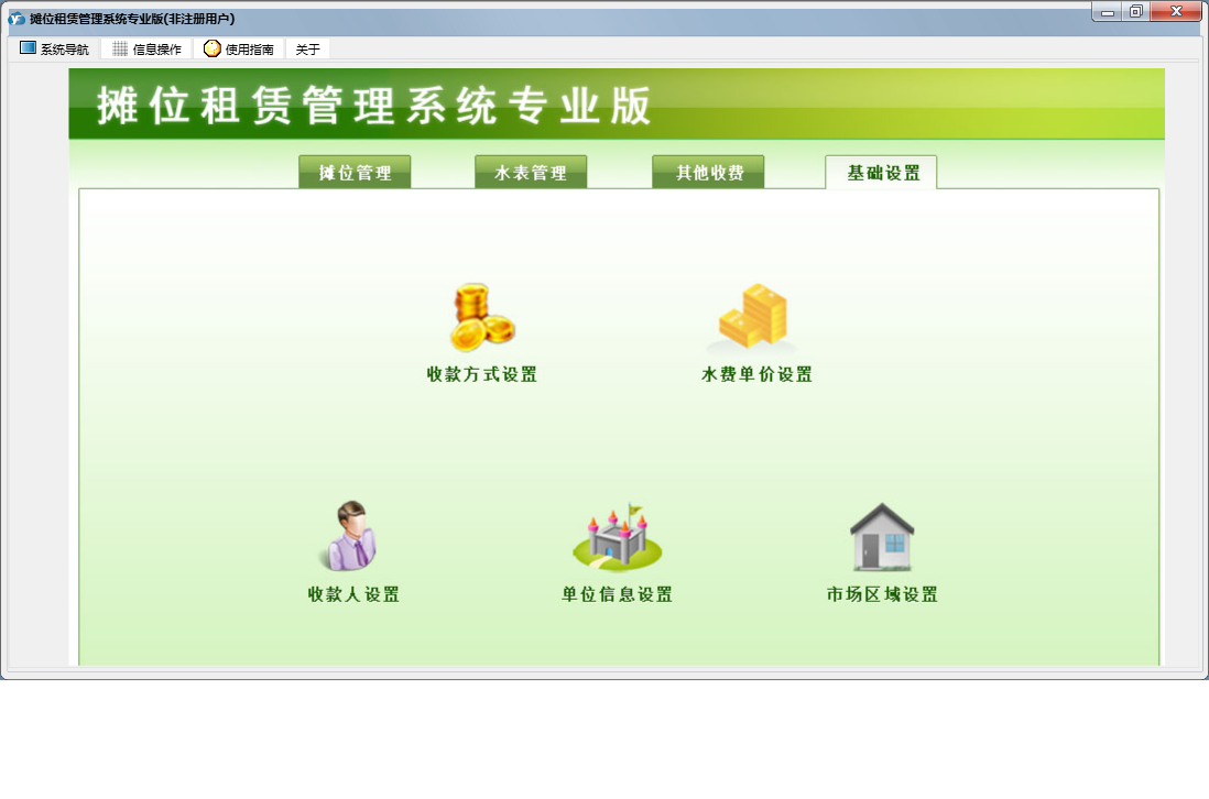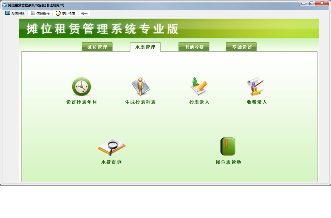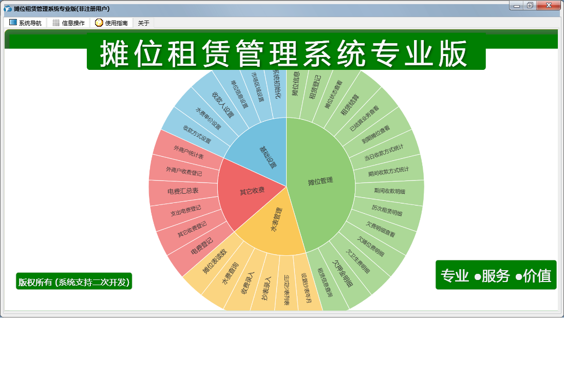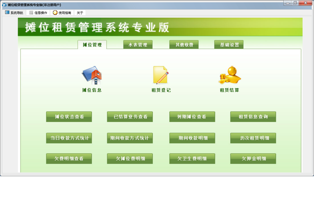摊位租赁管理系统专业版包含以下功能:支出电费登记、基础设置、租赁信息查询、外商户收费登记、市场区域设置、已结算业务查看、其它收费登记、摊位信息、抄表录入、收费录入、摊位状态查看、权限设置、租赁结算、租赁登记、关于、摊位管理、其他管理、日志、电费登记、水表管理等