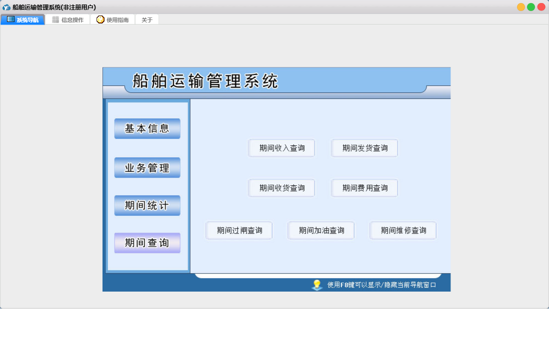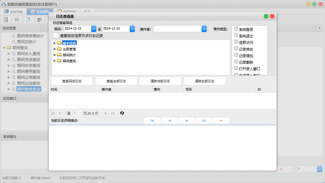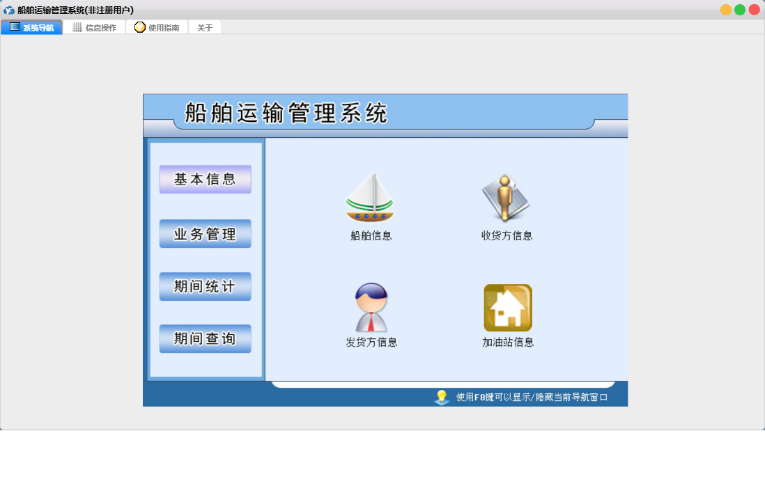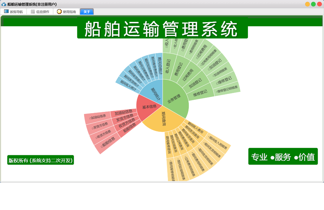 船舶运输管理系统包含以下功能:加油站信息、收货方信息、期间统计、船舶信息、收入登记、维修登记、日志、关于、基本信息、权限设置、期间查询、过闸费用、发货方信息、费用登记、加油登记、业务管理等